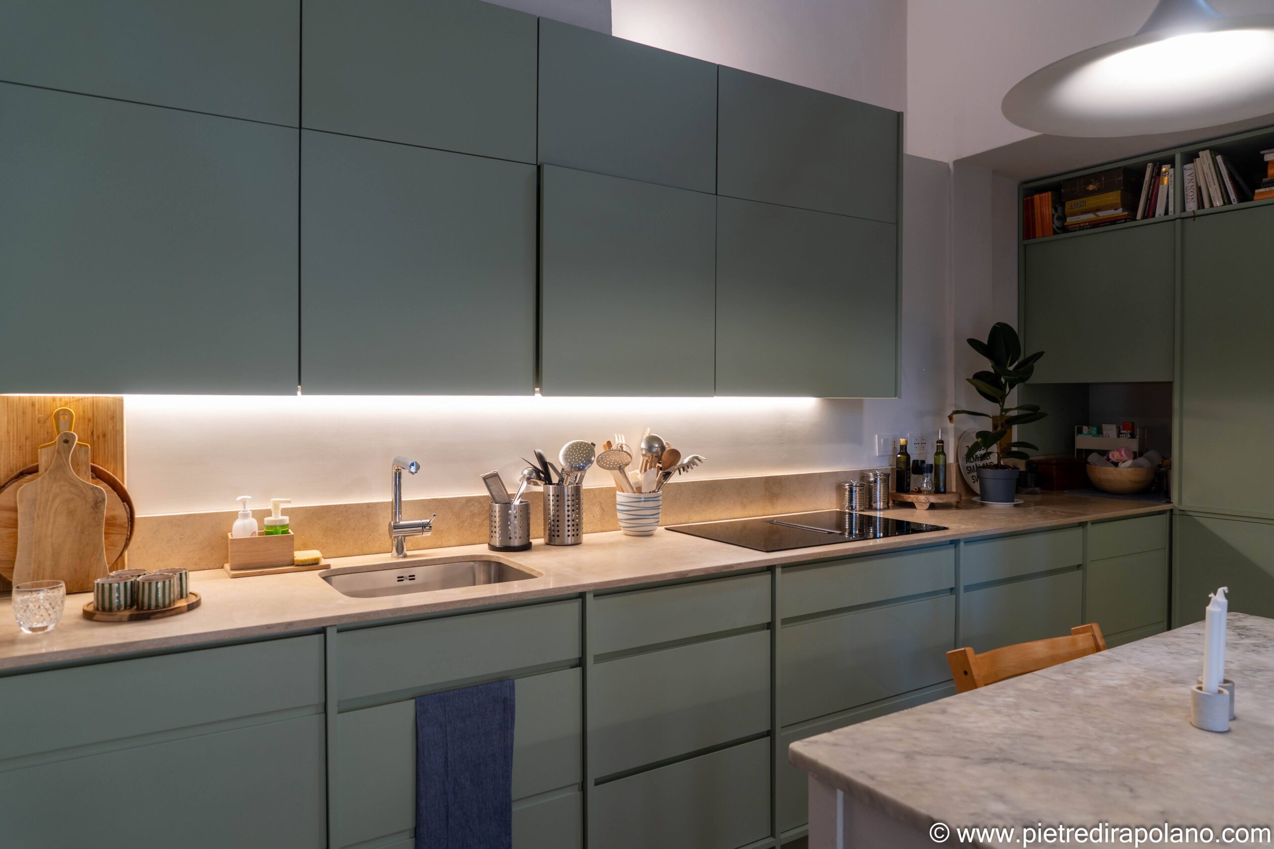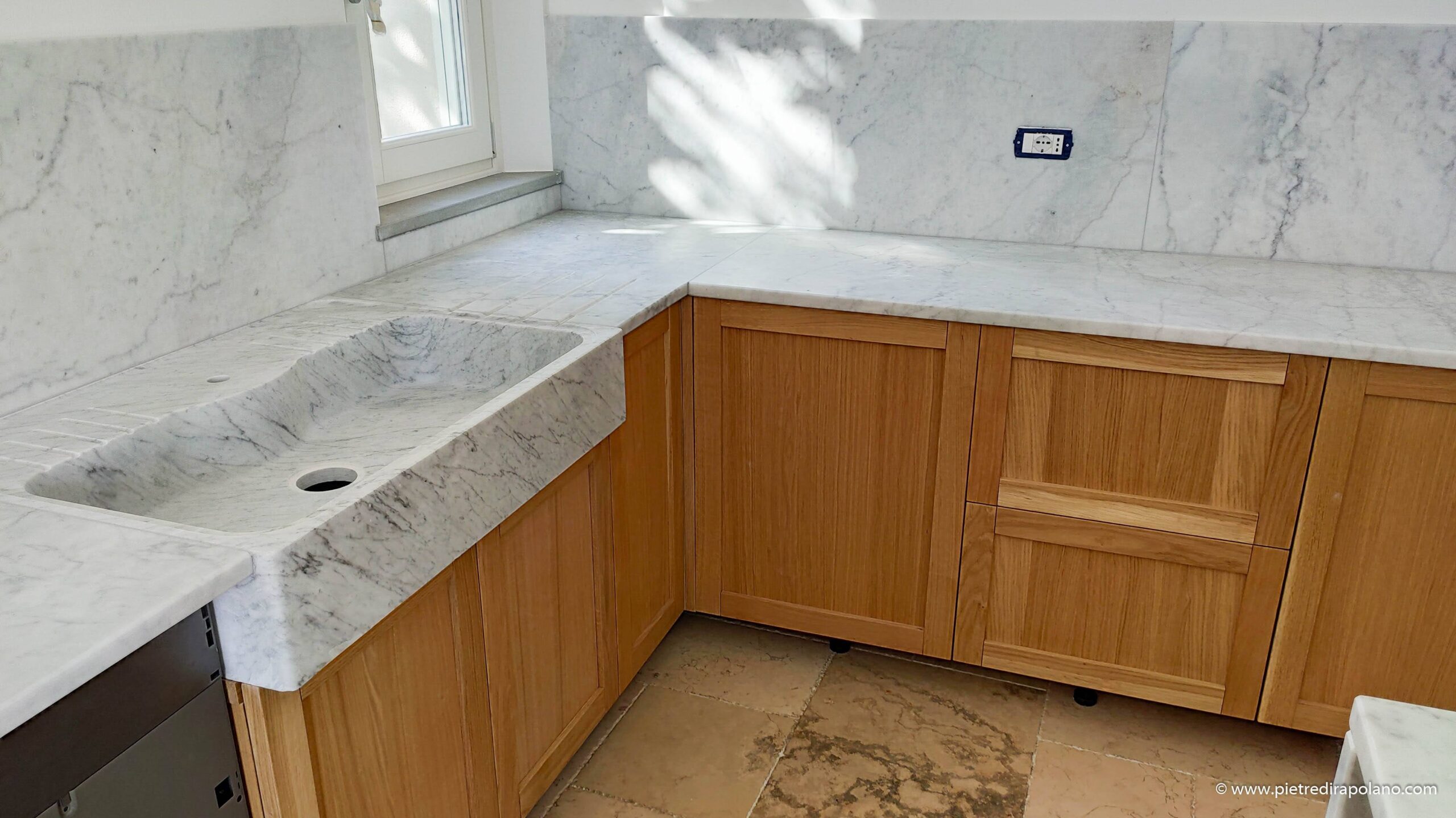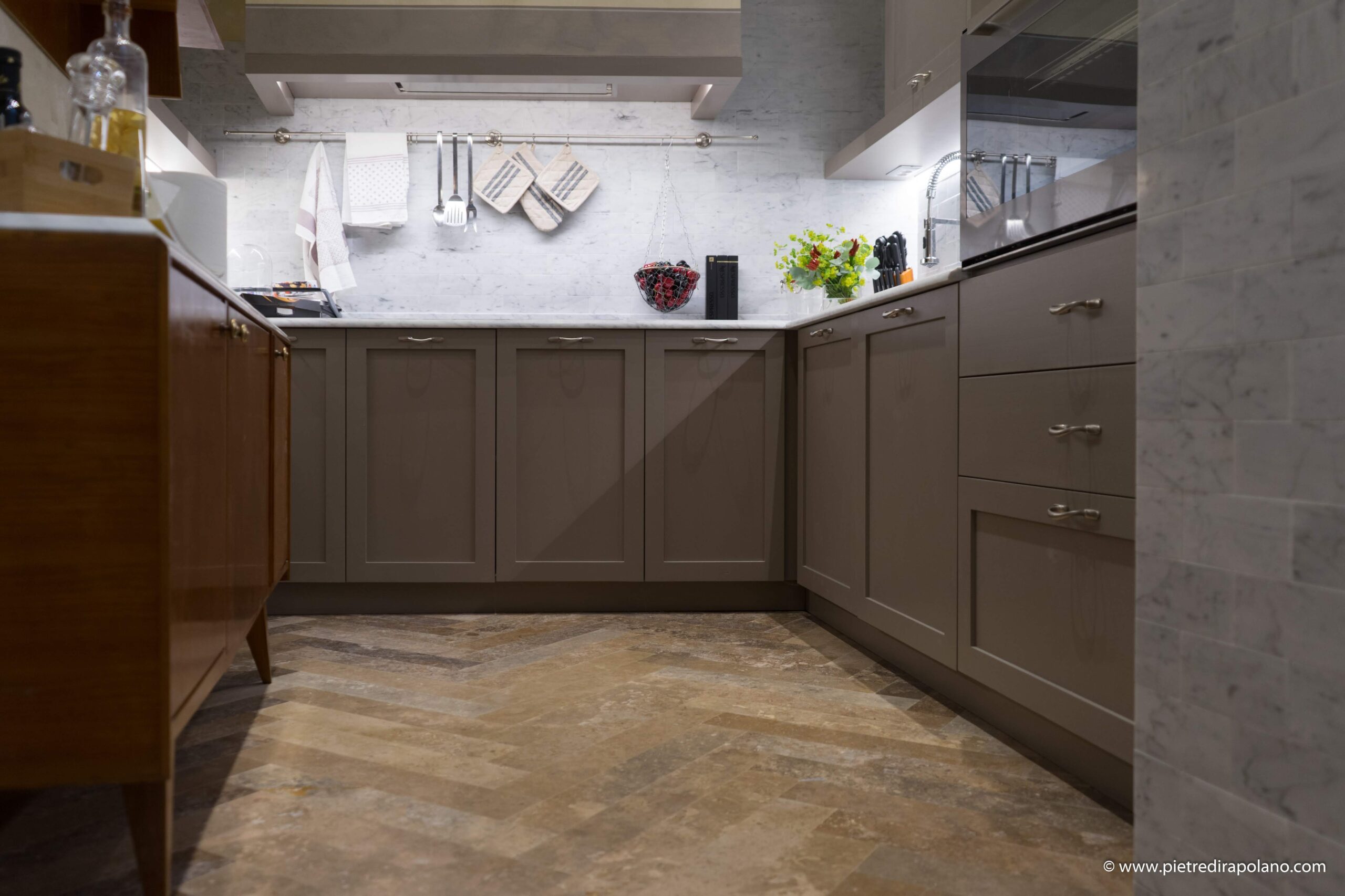 Accostiamo il calore del legno alla forza della pietra naturale per creare composizioni eleganti e senza tempo. I piani di lavoro possono essere realizzati in travertino, marmo o pietra serena, con lavelli integrati e soluzioni progettate su misura; ogni superficie dialoga con il legno con naturalezza, esaltandone le venature, le cromie, la matericità.