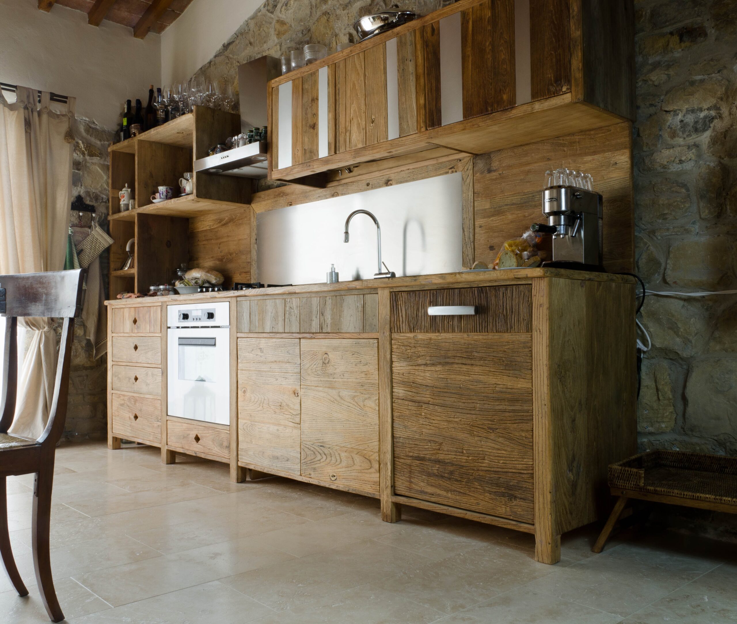 I progetti Pietre di Rapolano nascono da una visione precisa: usare il legno in modo autentico, con lavorazioni artigianali capaci di esaltare le sue caratteristiche: che si tratti di strutture imponenti o dettagli minuti, ogni componente – dai piani ai frontali, dalle boiserie alle mensole – viene progettato su misura, combinando legni diversi come rovere, noce, frassino o castagno, scelti per adattarsi a ogni contesto.