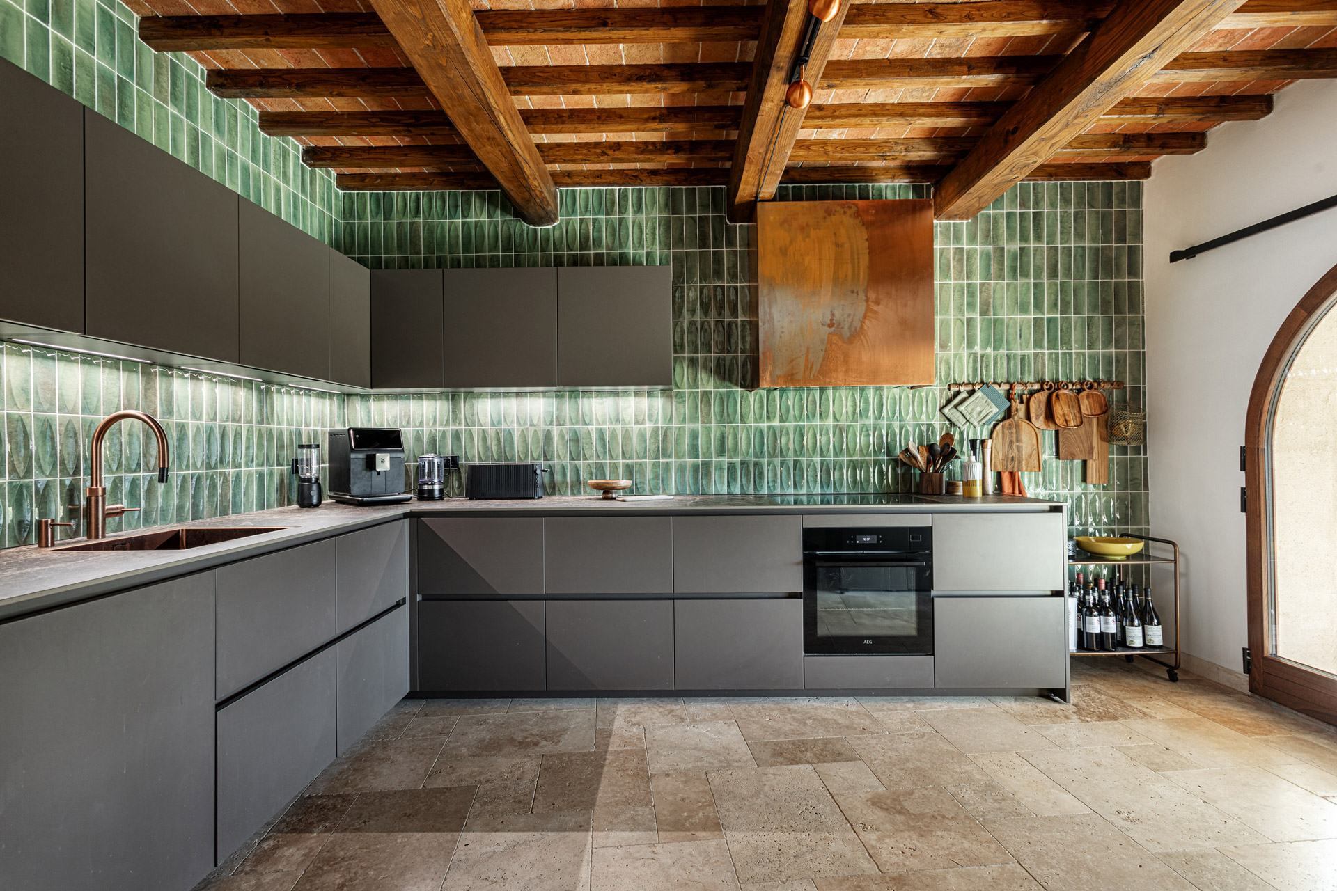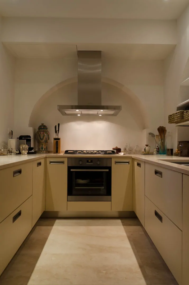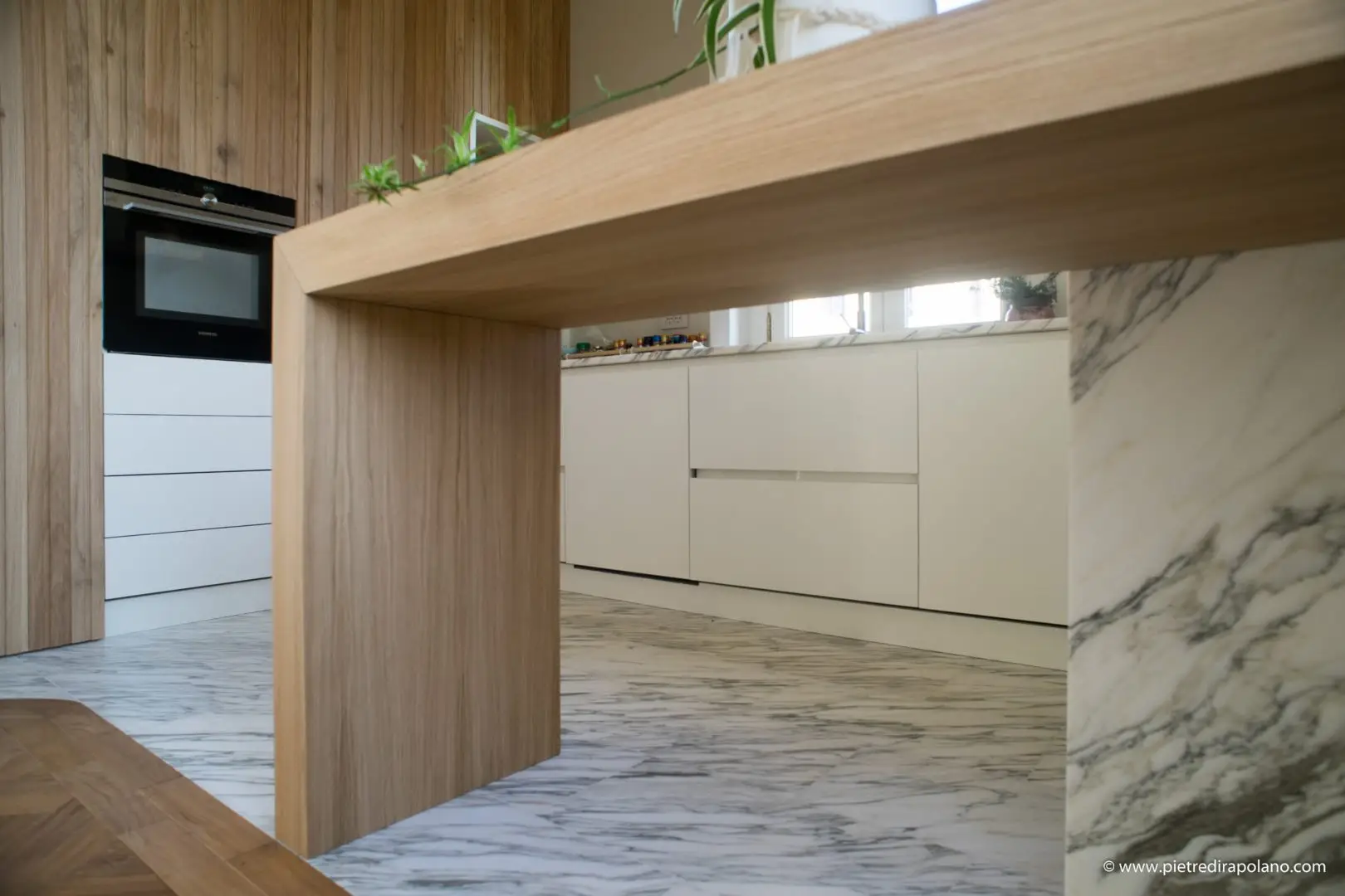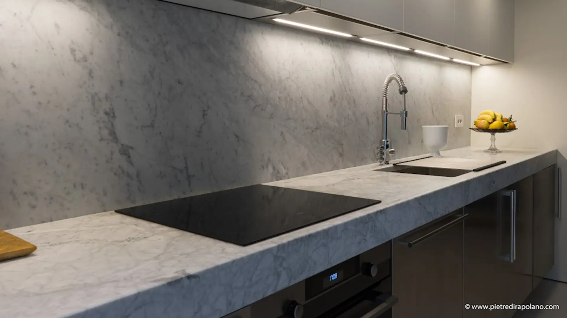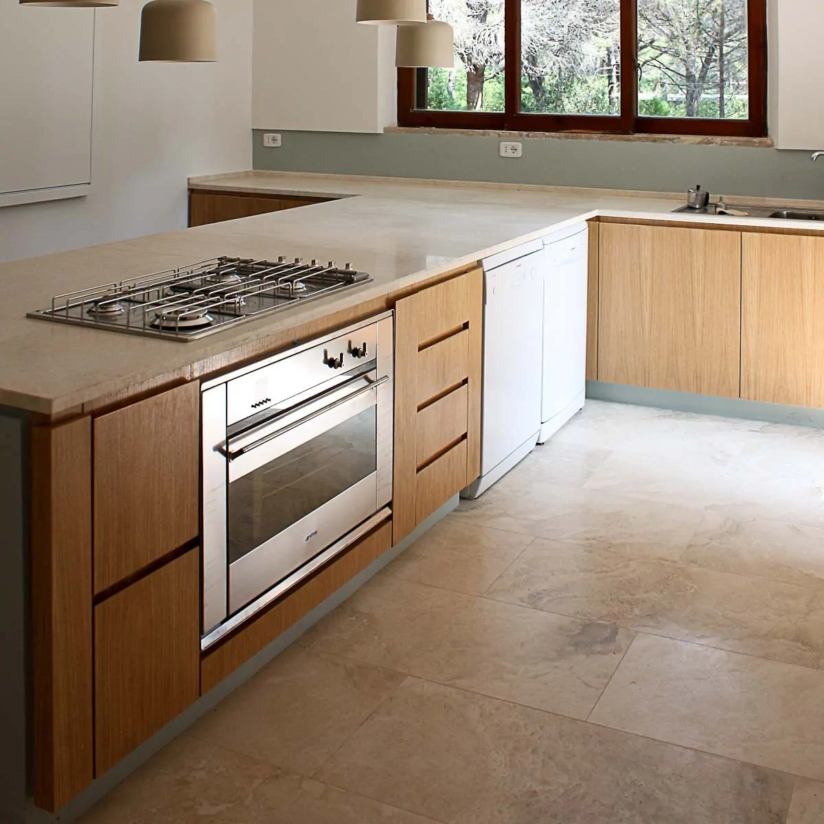 Anche per il rivestimento dello schienale da parete – la zona retrostante i fornelli e il lavabo – può essere impiegata la stessa selezione di travertino scelta per la pavimentazione.