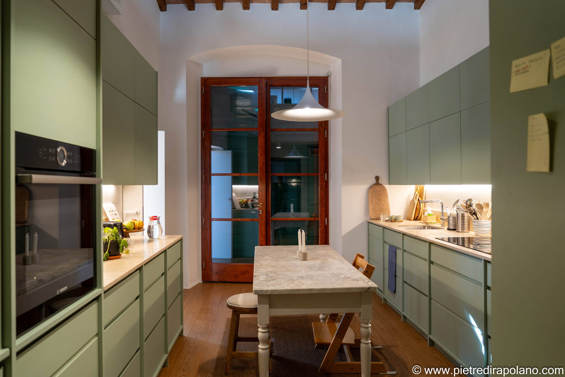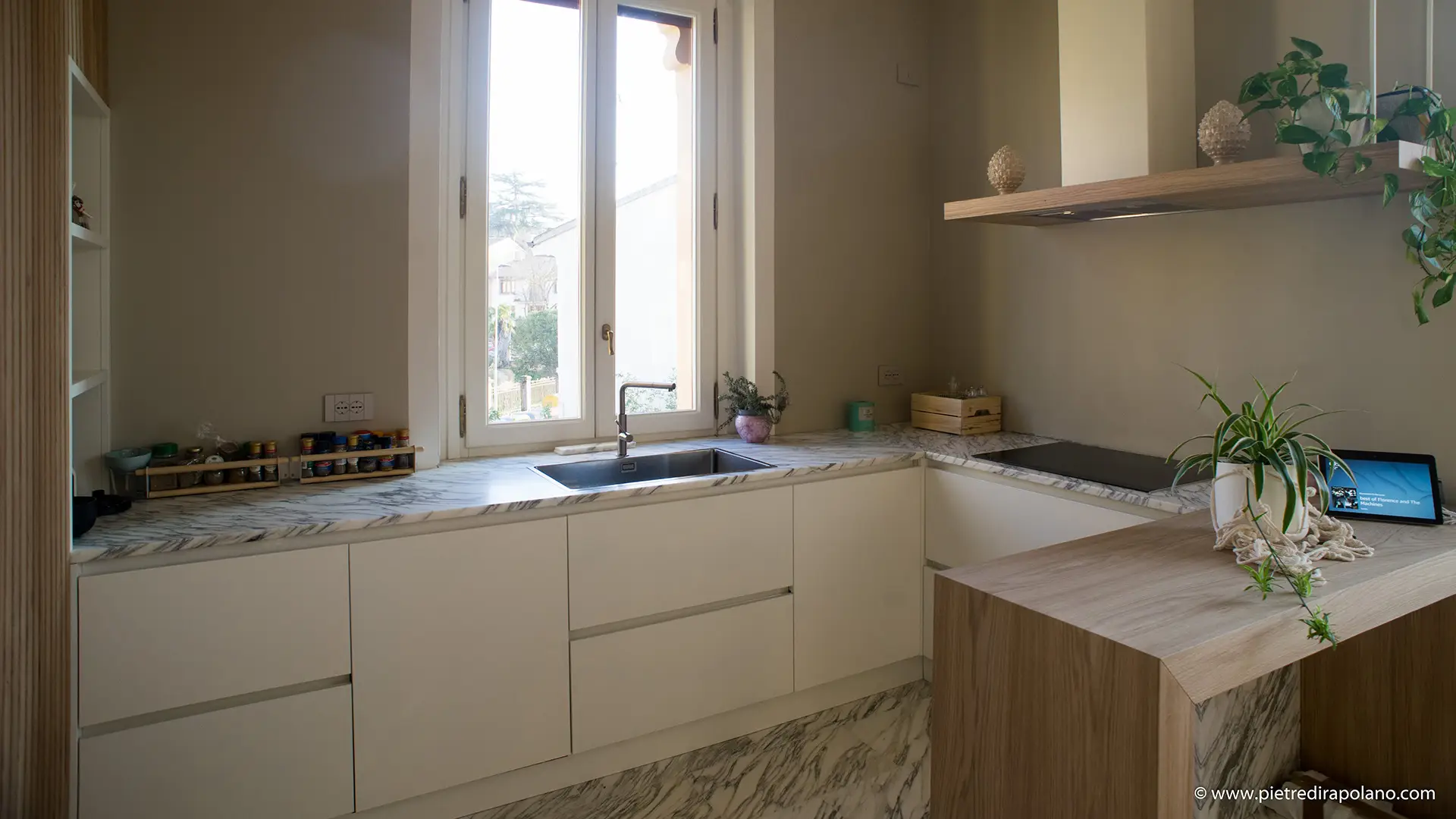 Il piano in marmo può essere utilizzato anche per rivestire un vecchio tavolo di legno o la penisola, un modo semplice ed intelligente per avere un piano di lavoro in più, resistente e durevole.