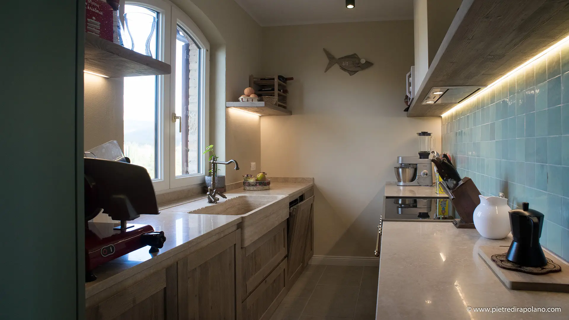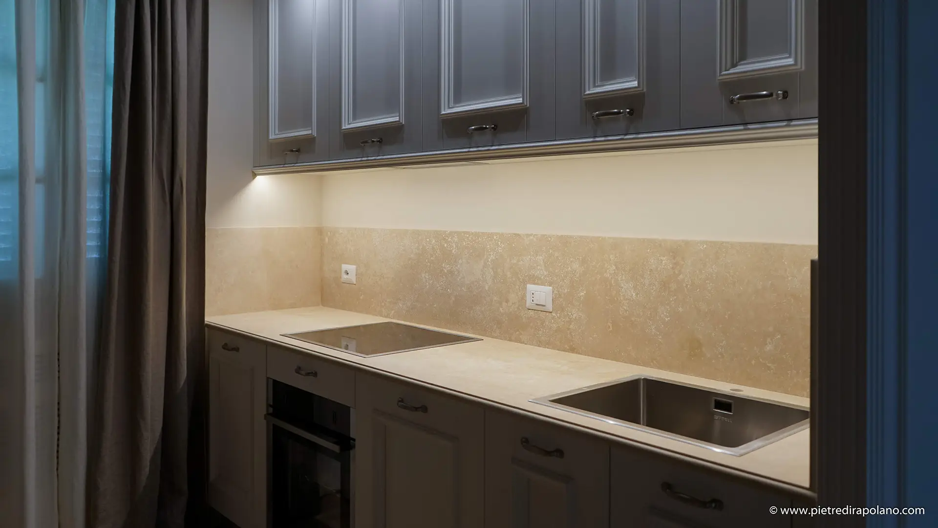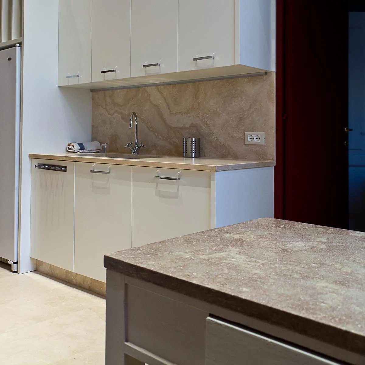 Il piano cucina in travertino assicura grande resistenza e un forte impatto estetico, motivo per cui spesso viene scelto per dare risalto anche alla cucina più semplice.
