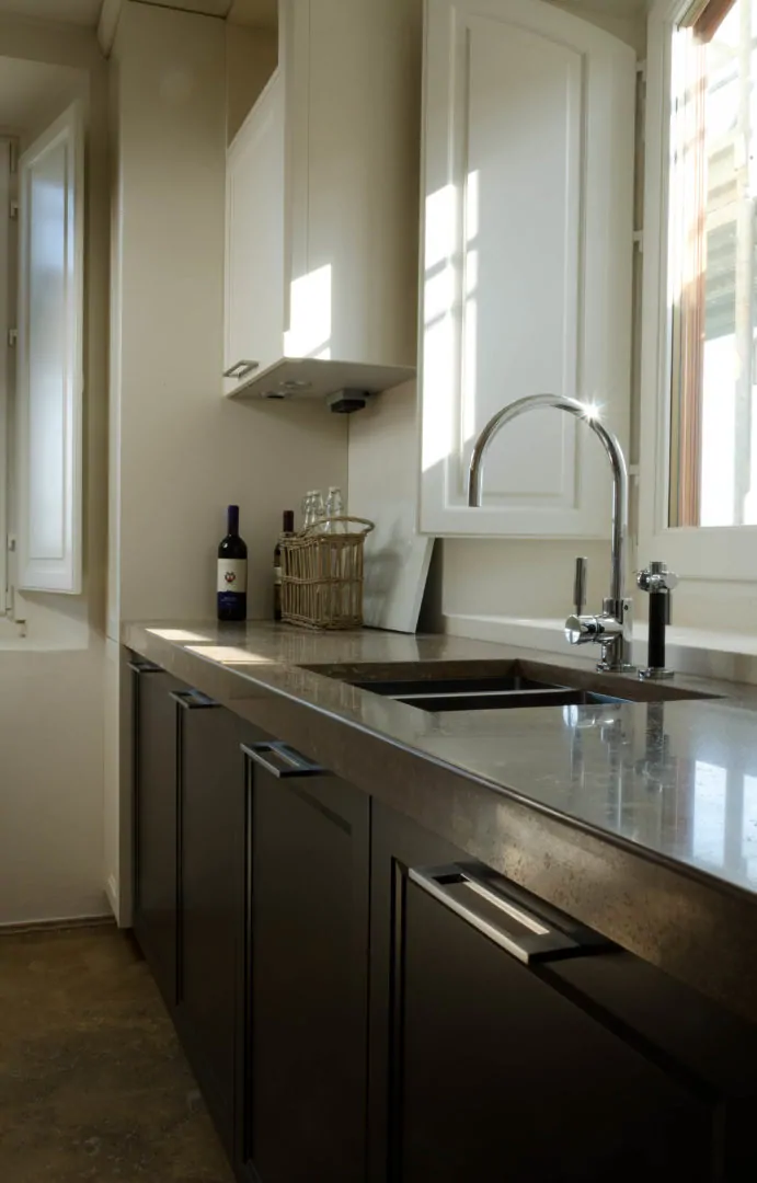 I bordi del piano cucina in pietra potranno essere retti, a toro, o a becco di civetta, a seconda dello stile della cucina; anche lo spessore del piano potrà essere oggetto di scelta.