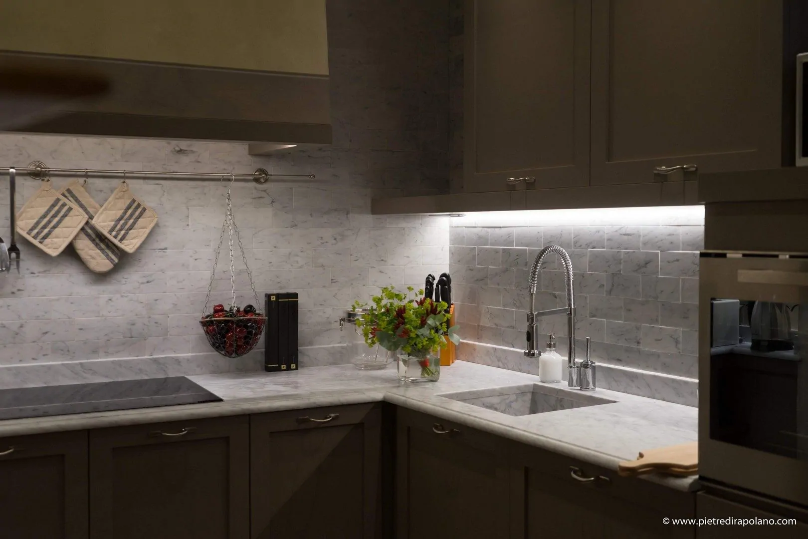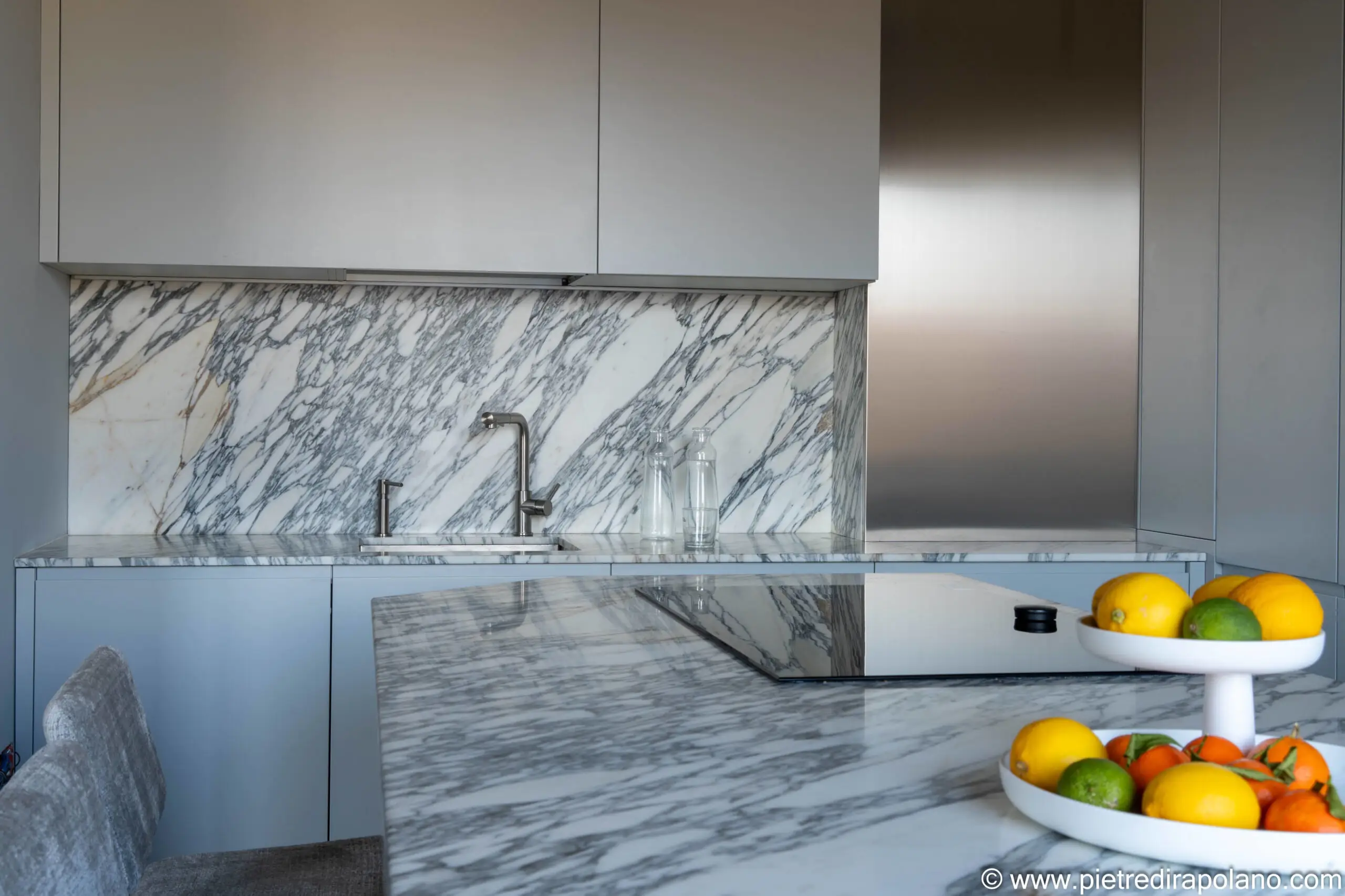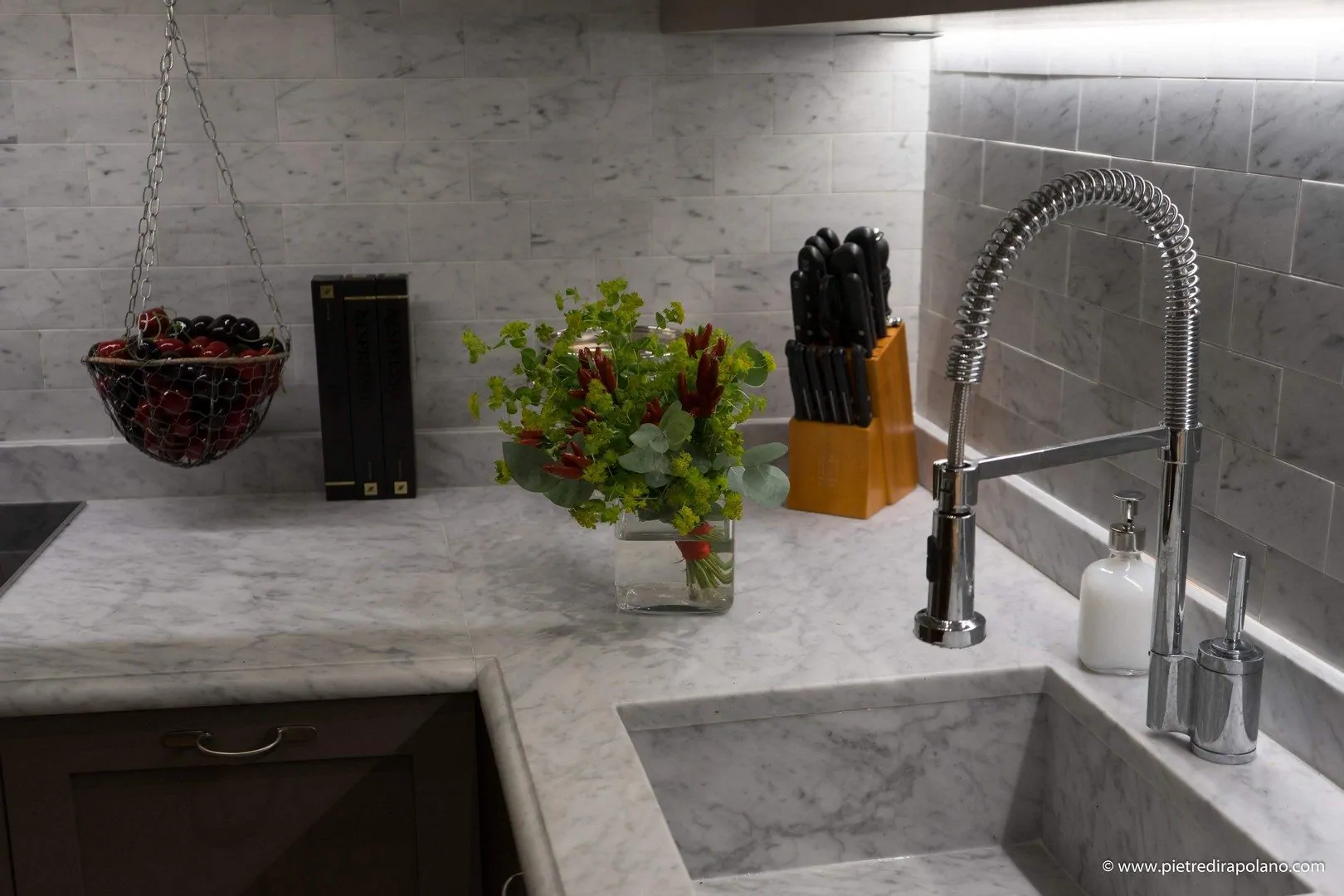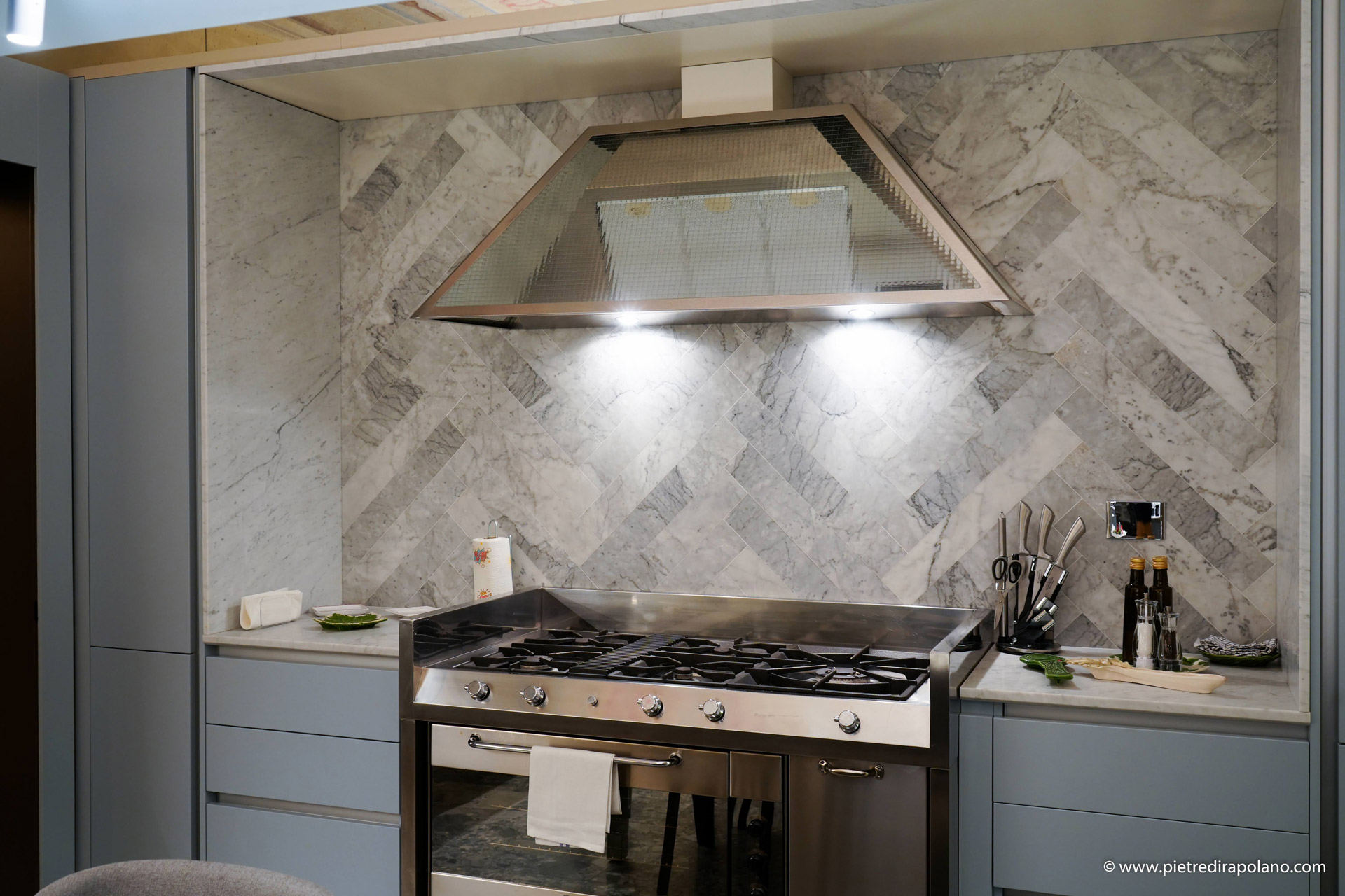 Anche la Pietra del Cardoso, con i suoi colori grigi venati, si presta molto bene alla realizzazione di un piano da cucina in marmo.