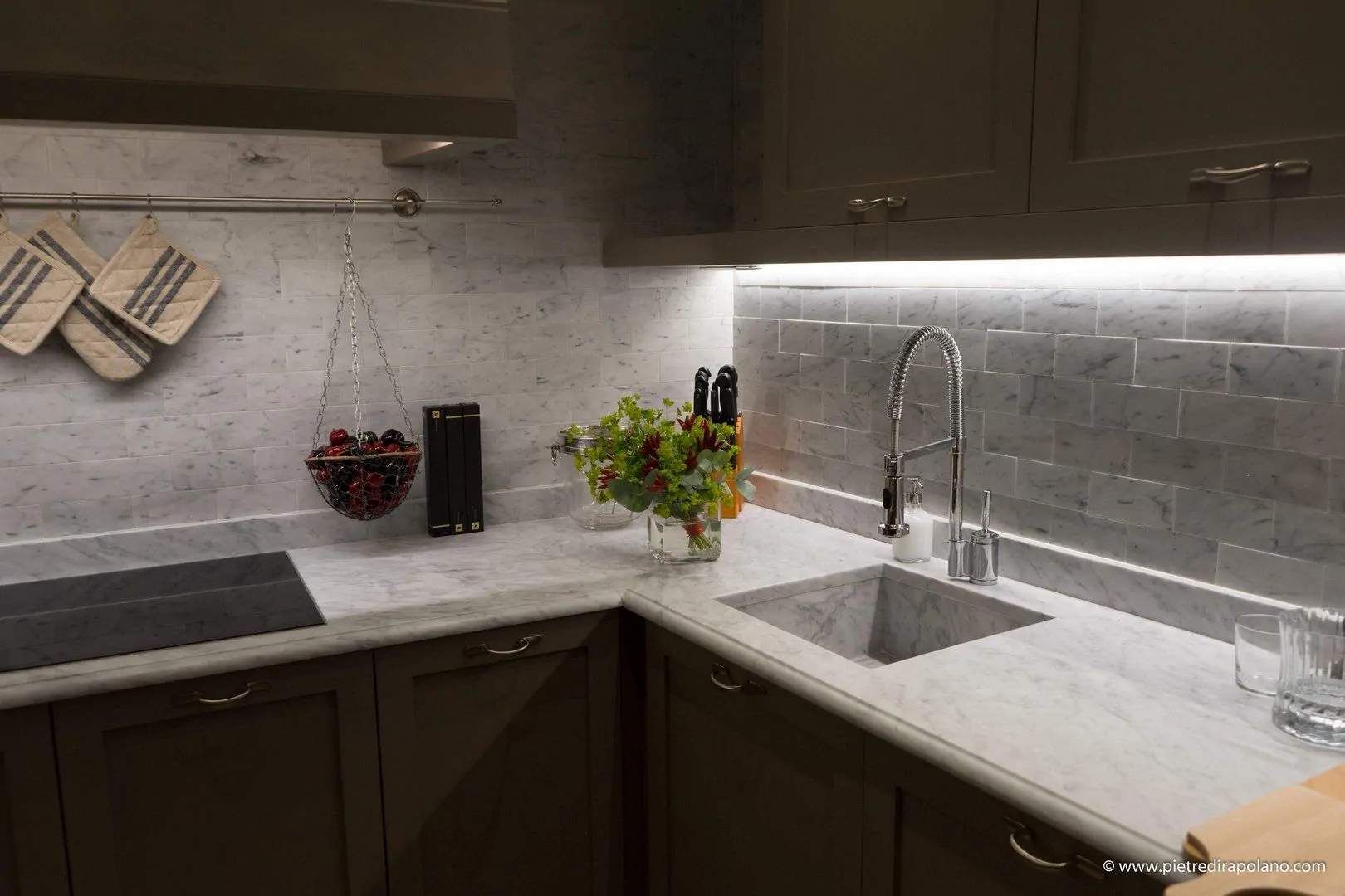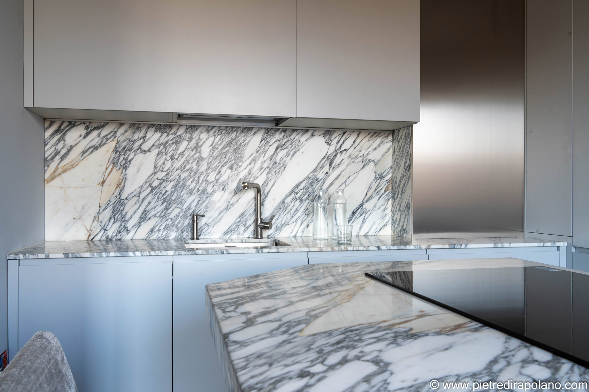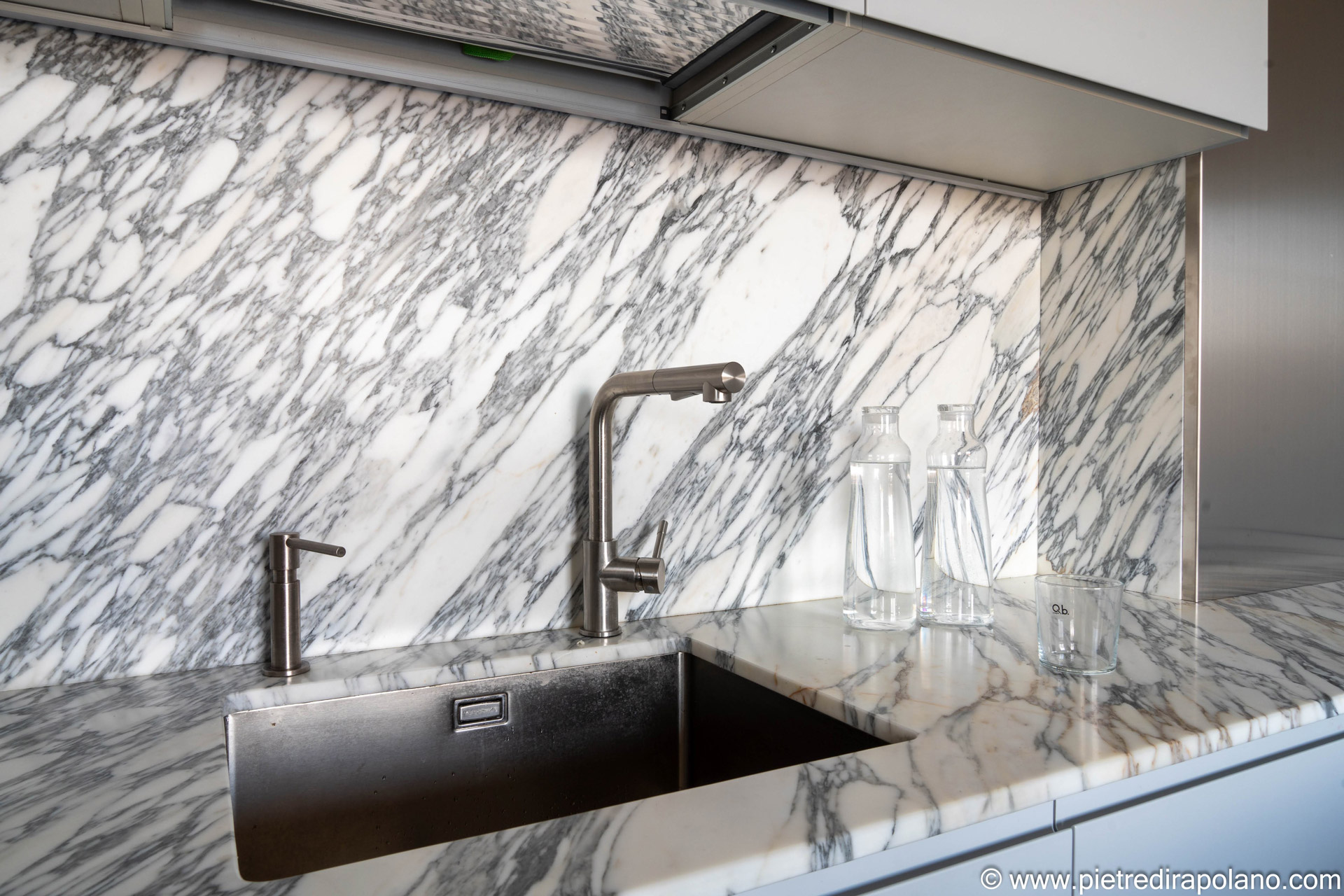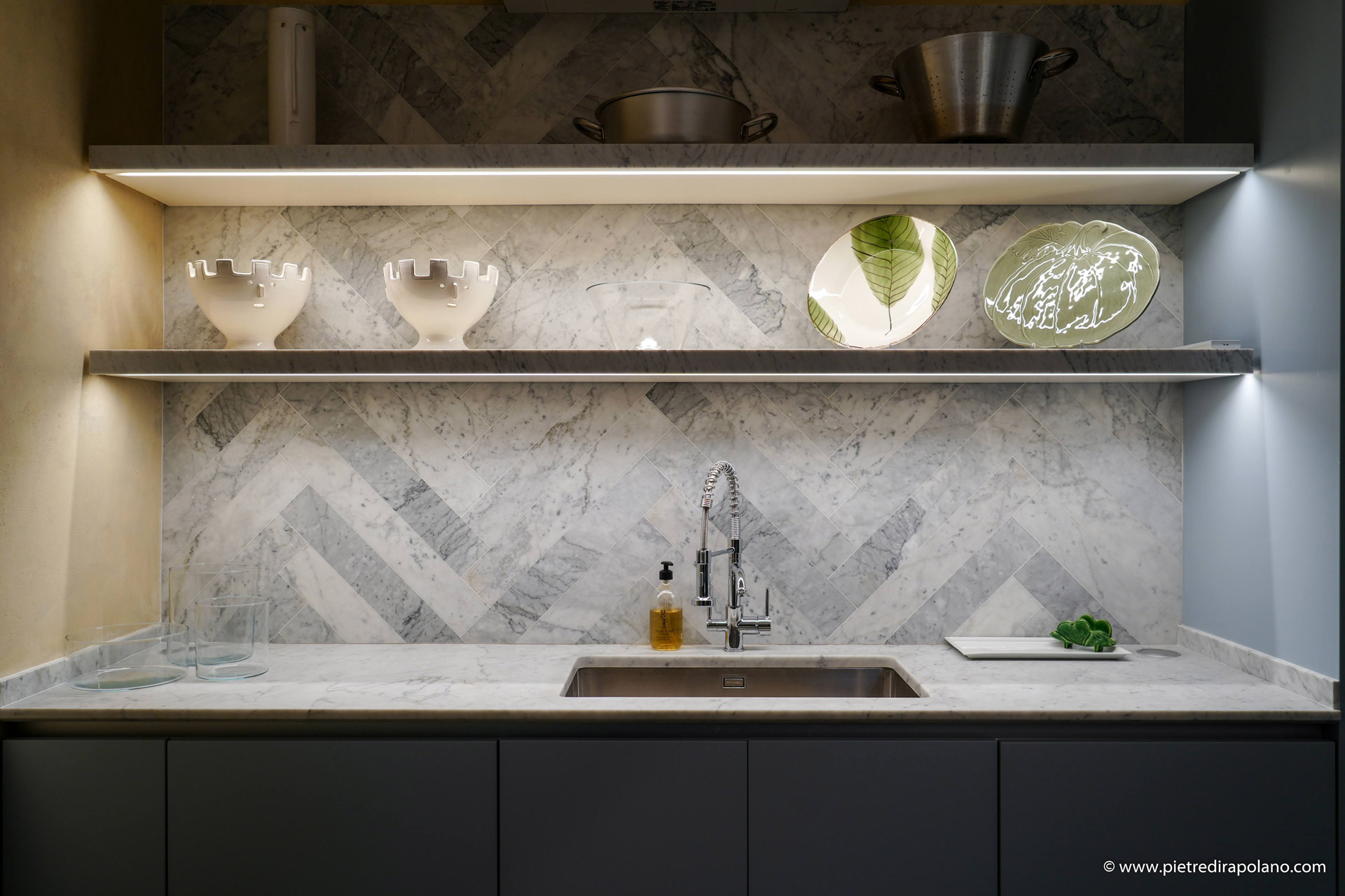 Anche la Pietra del Cardoso, con i suoi colori grigi venati, si presta molto bene alla realizzazione di un piano da cucina in marmo.