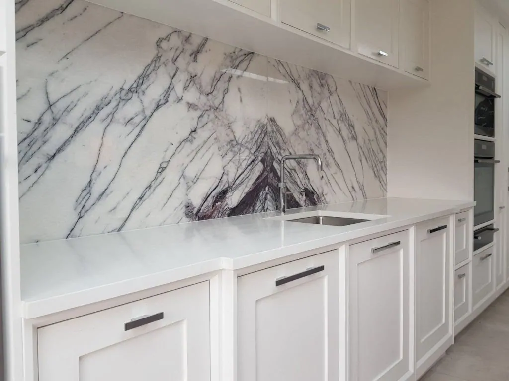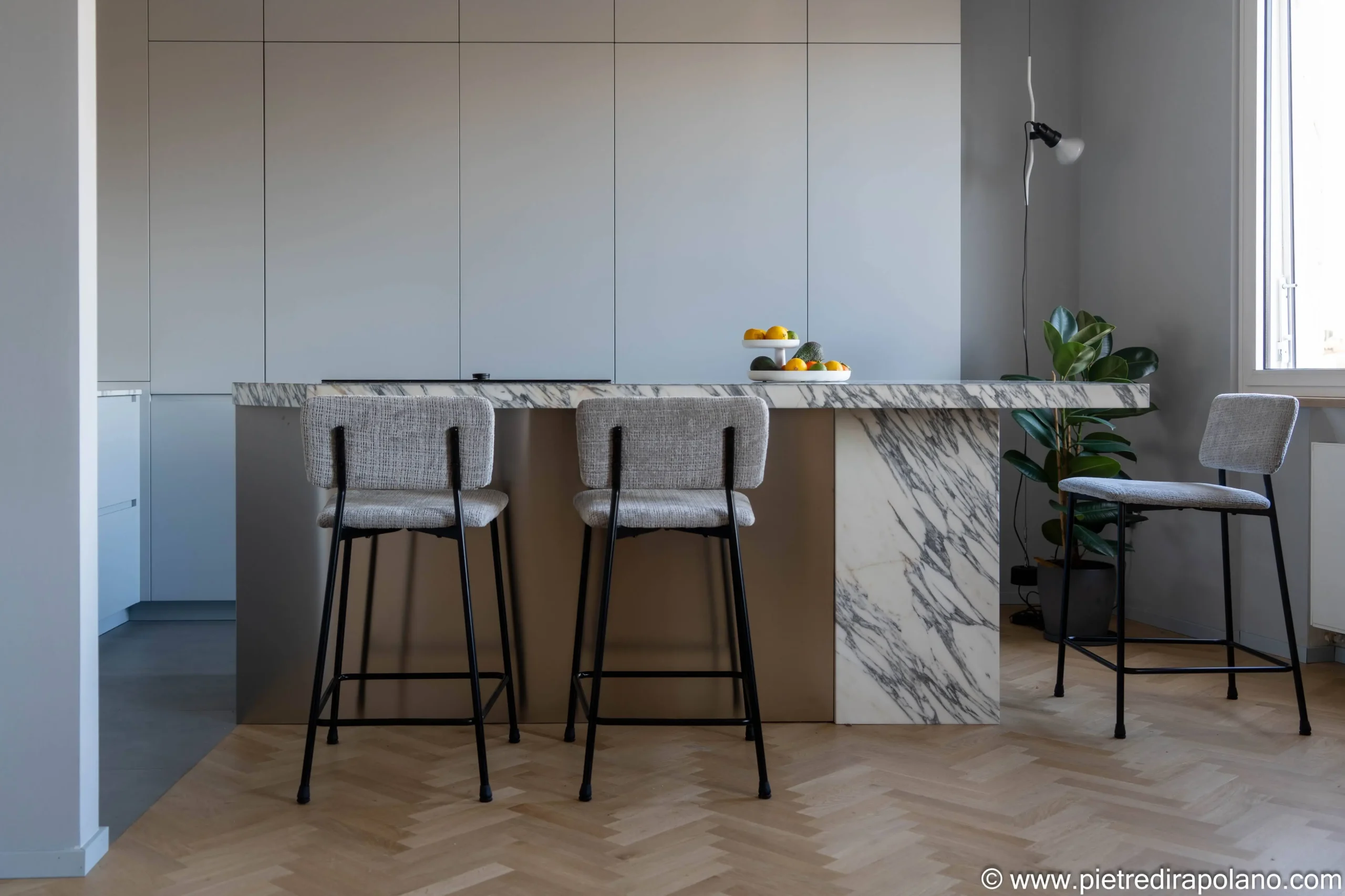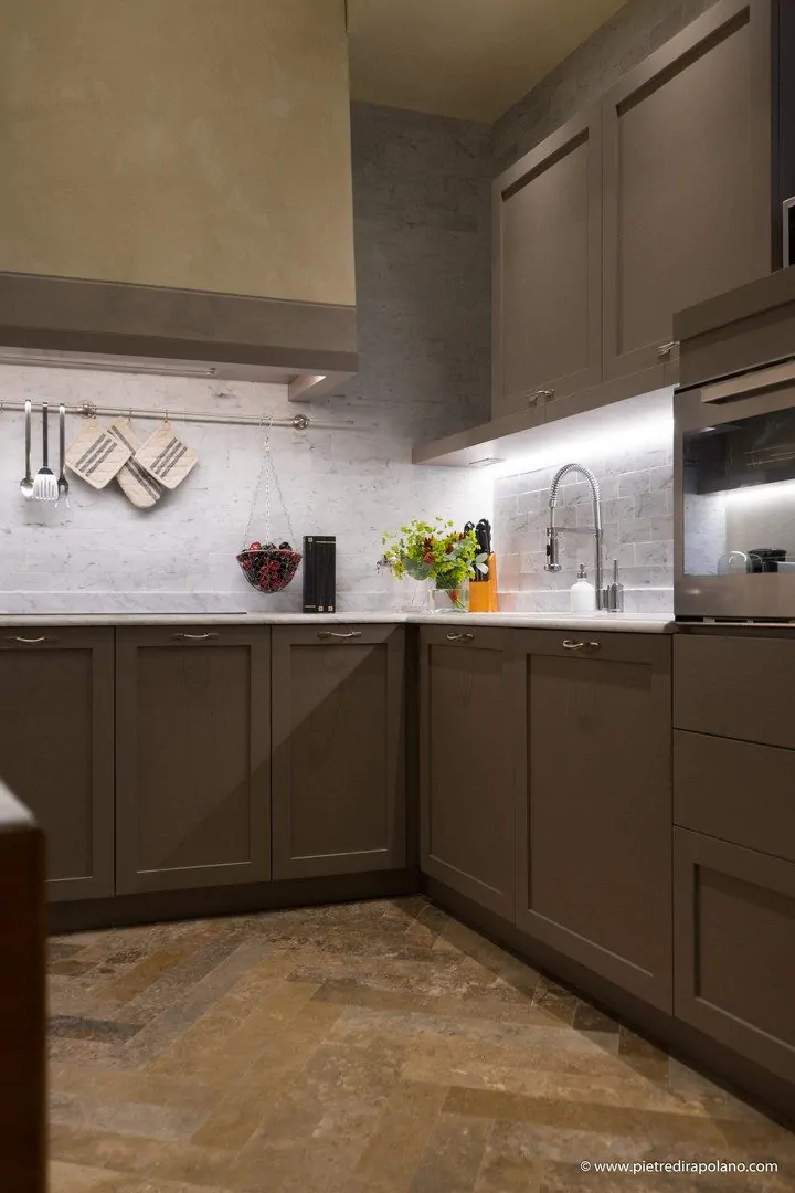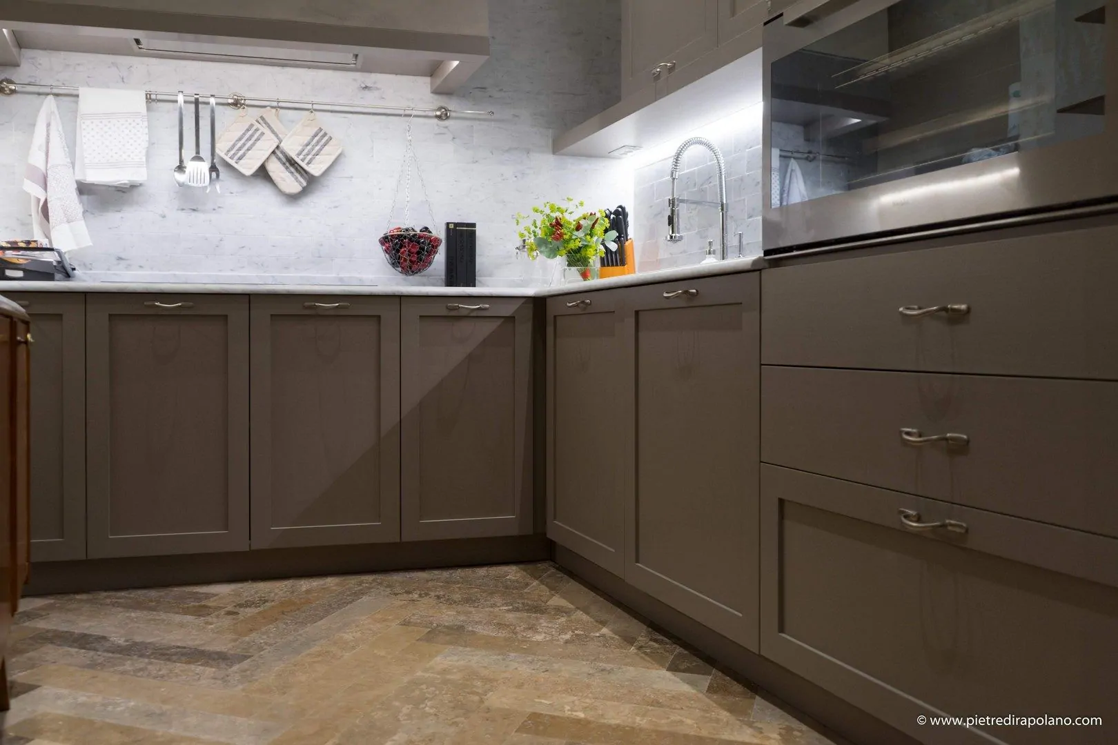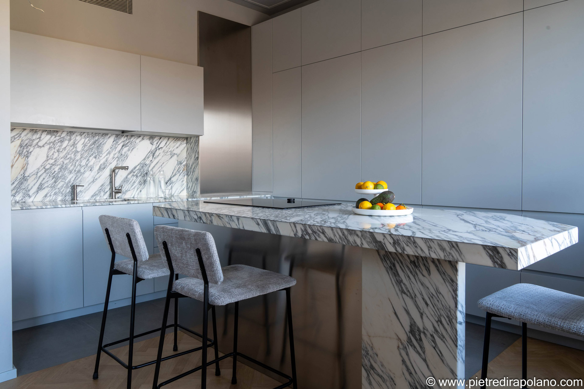 Anche la Pietra del Cardoso, con i suoi colori grigi venati, si presta molto bene alla realizzazione di un piano da cucina in marmo.