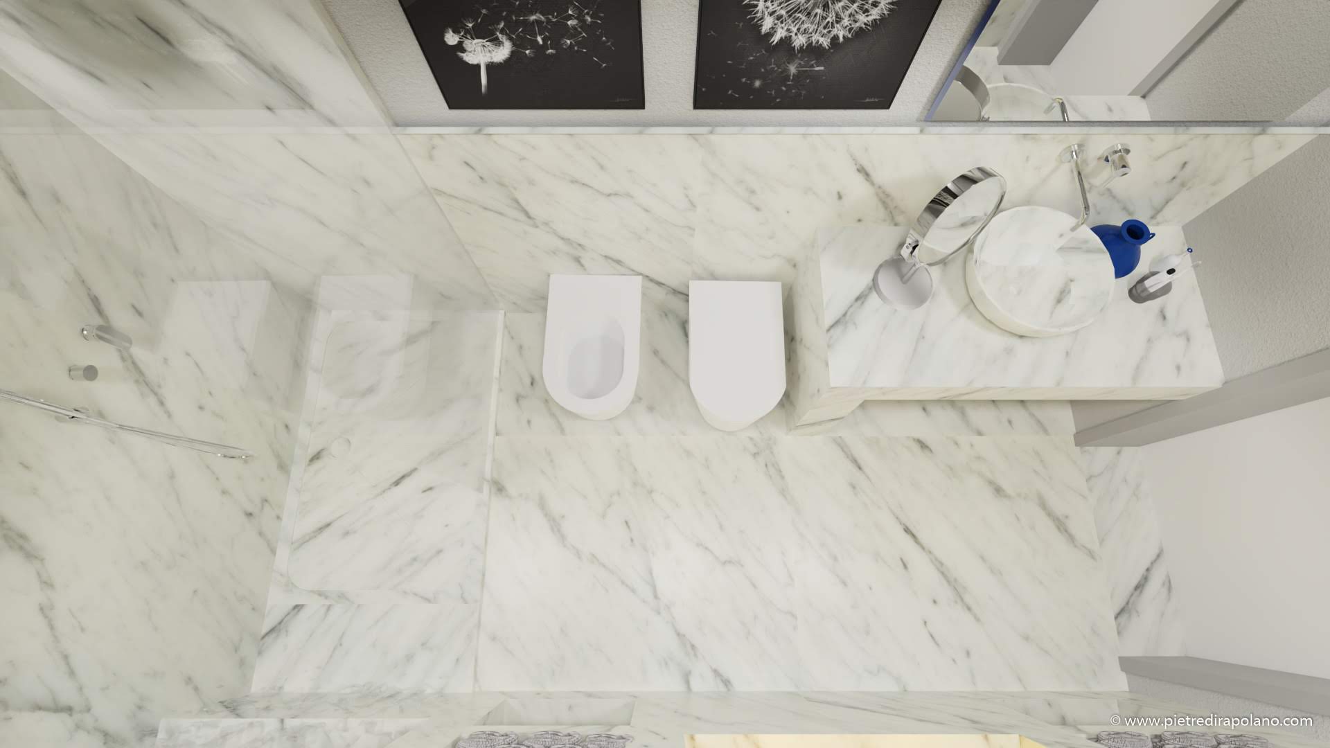 Senden Sie uns den Grundriss Ihres Badezimmers. Wir prüfen diese Möglichkeit gerne für Sie. Unten finden Sie einige Vorschläge: Die verwendeten Materialien sind Travertin Zebra Terra Chiaro, Travertin Light Blend und Bianco di Carrara. Welche Lösung gefällt Ihnen am besten?