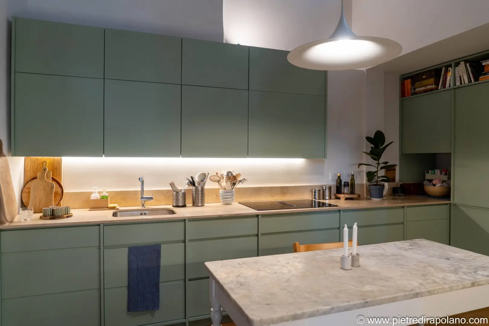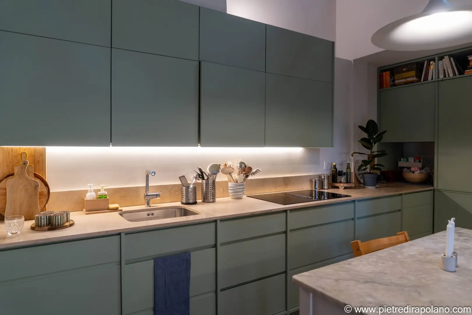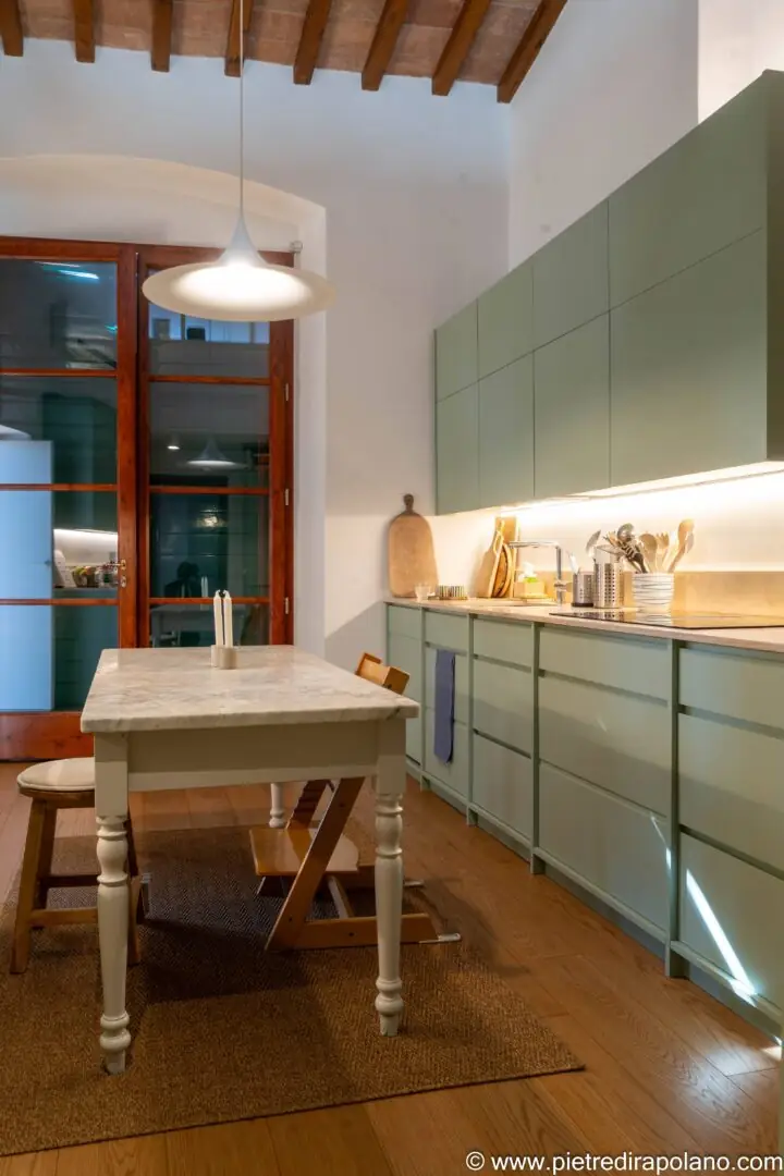 - Beleuchtung und Arbeitsplatten: Die unter den Oberschränken integrierte LED-Beleuchtung hebt die Arbeitsplatten hervor, schafft eine warme Atmosphäre und betont die Textur des hellen Travertins in Falda mit Moderno-Finish, der für die Arbeitsplatte und die Rückwand verwendet wurde. Der zentrale Tisch mit seiner Platte aus Carrara-Marmor und der klassischen Struktur dient als geselliger Mittelpunkt und steht in harmonischem Kontrast zum Minimalismus der Linien der neuen Schränke.