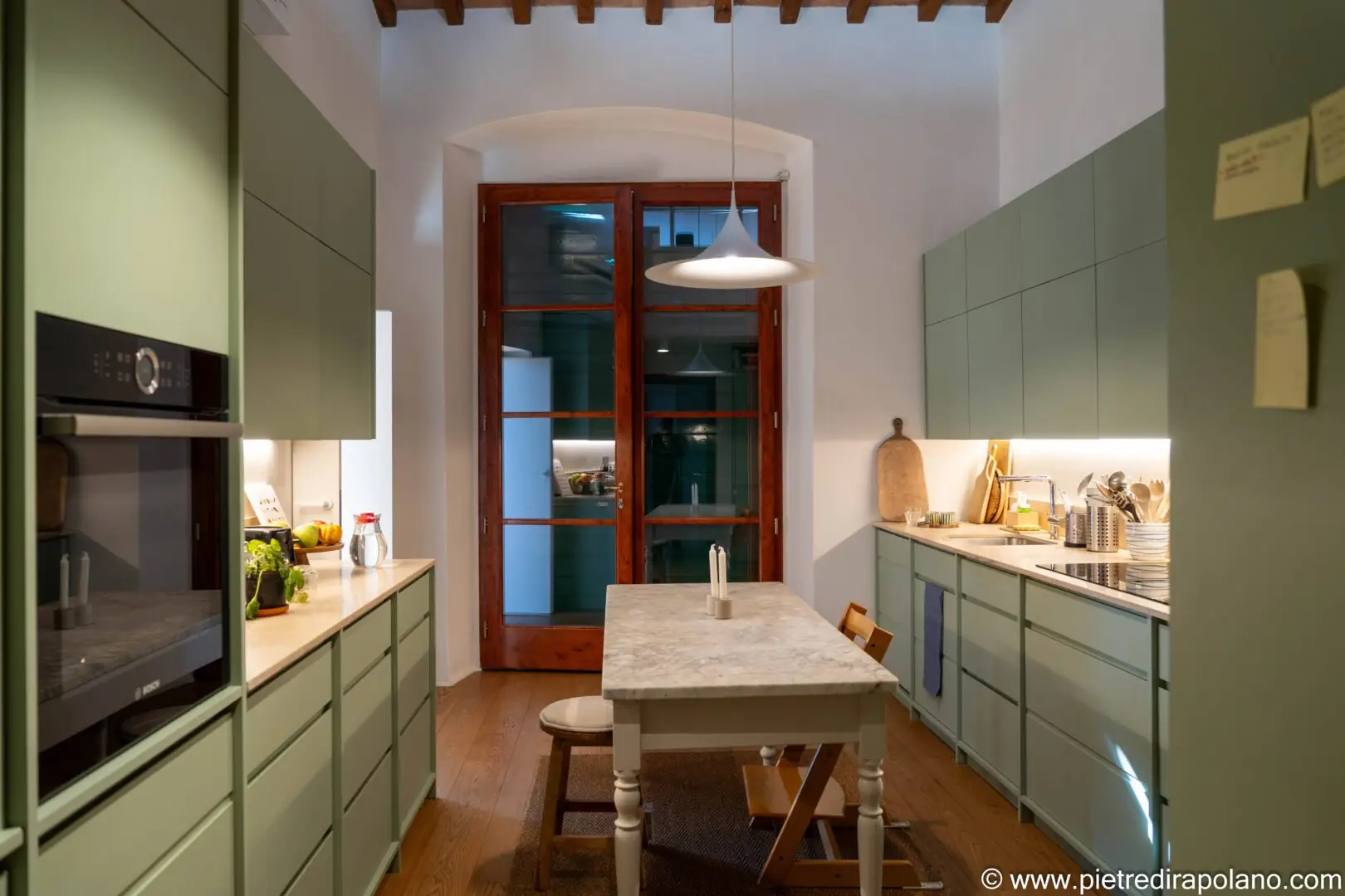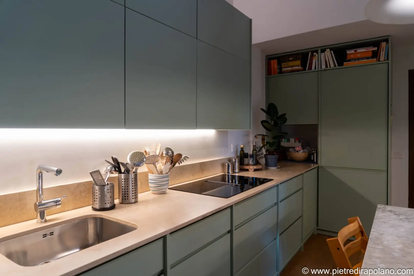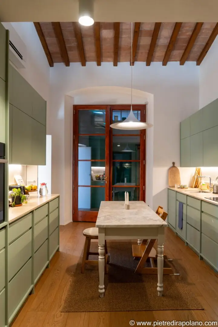 - Beleuchtung und Arbeitsplatten: Die unter den Oberschränken integrierte LED-Beleuchtung hebt die Arbeitsplatten hervor, schafft eine warme Atmosphäre und betont die Textur des hellen Travertins in Falda mit Moderno-Finish, der für die Arbeitsplatte und die Rückwand verwendet wurde. Der zentrale Tisch mit seiner Platte aus Carrara-Marmor und der klassischen Struktur dient als geselliger Mittelpunkt und steht in harmonischem Kontrast zum Minimalismus der Linien der neuen Schränke.