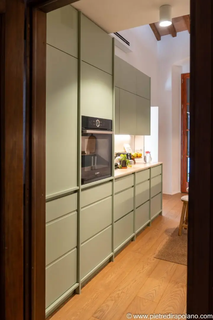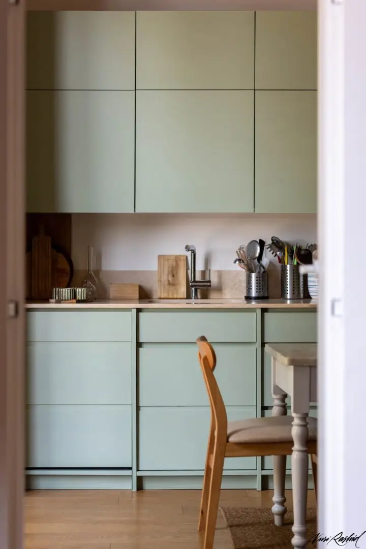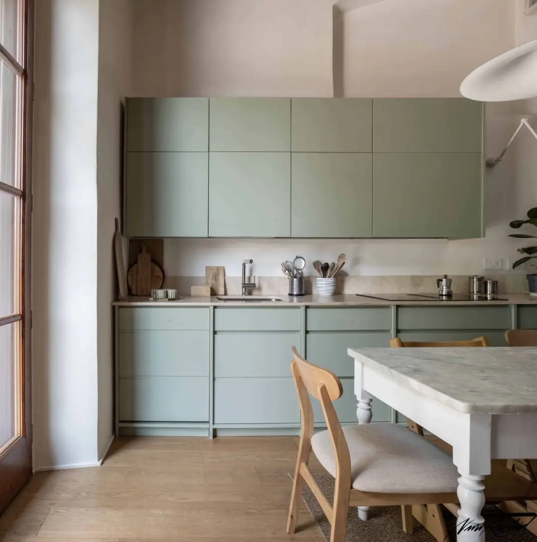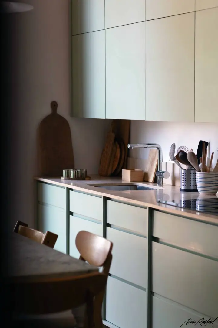 Die Küche wurde als heller und einladender Raum konzipiert, der sich durch die Wahl eines Salbeigrün-/Minttons für die Fronten auszeichnet – eine Farbe, die Frische und ein Gefühl der Ruhe vermittelt.
