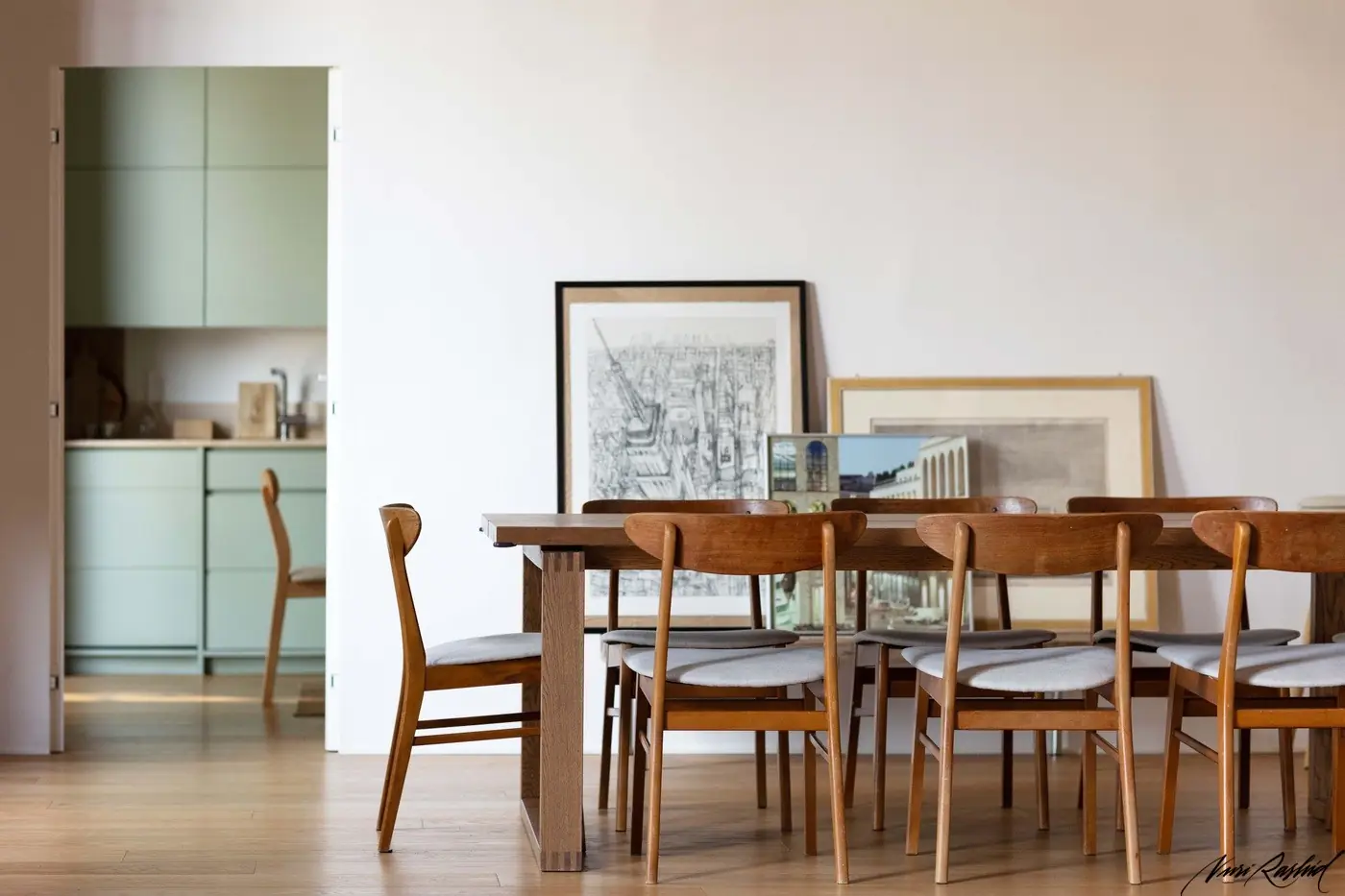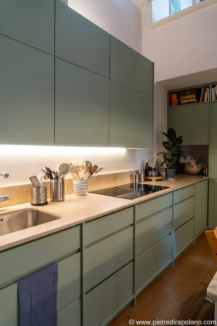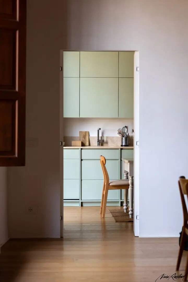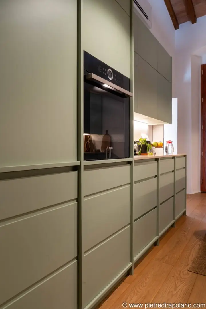 Die Küche wurde als heller und einladender Raum konzipiert, der sich durch die Wahl eines Salbeigrün-/Minttons für die Fronten auszeichnet – eine Farbe, die Frische und ein Gefühl der Ruhe vermittelt.