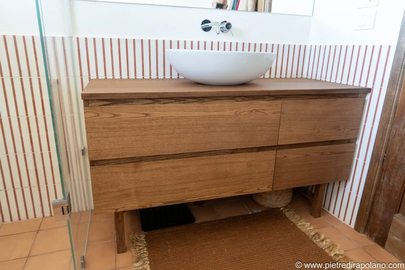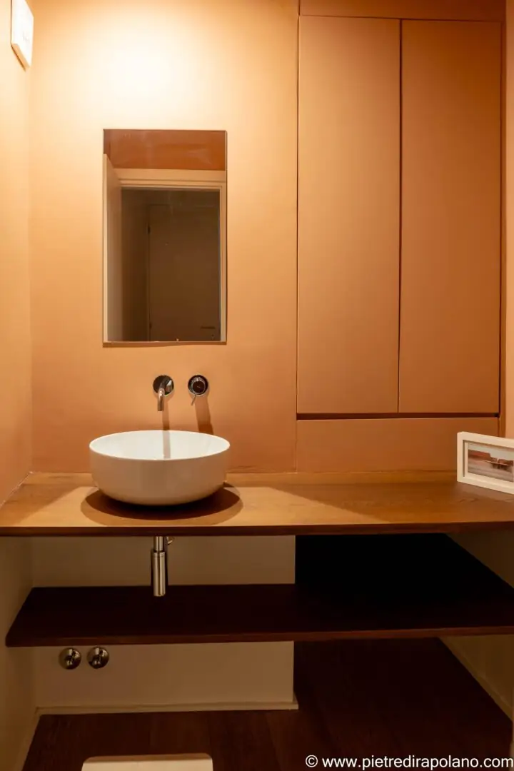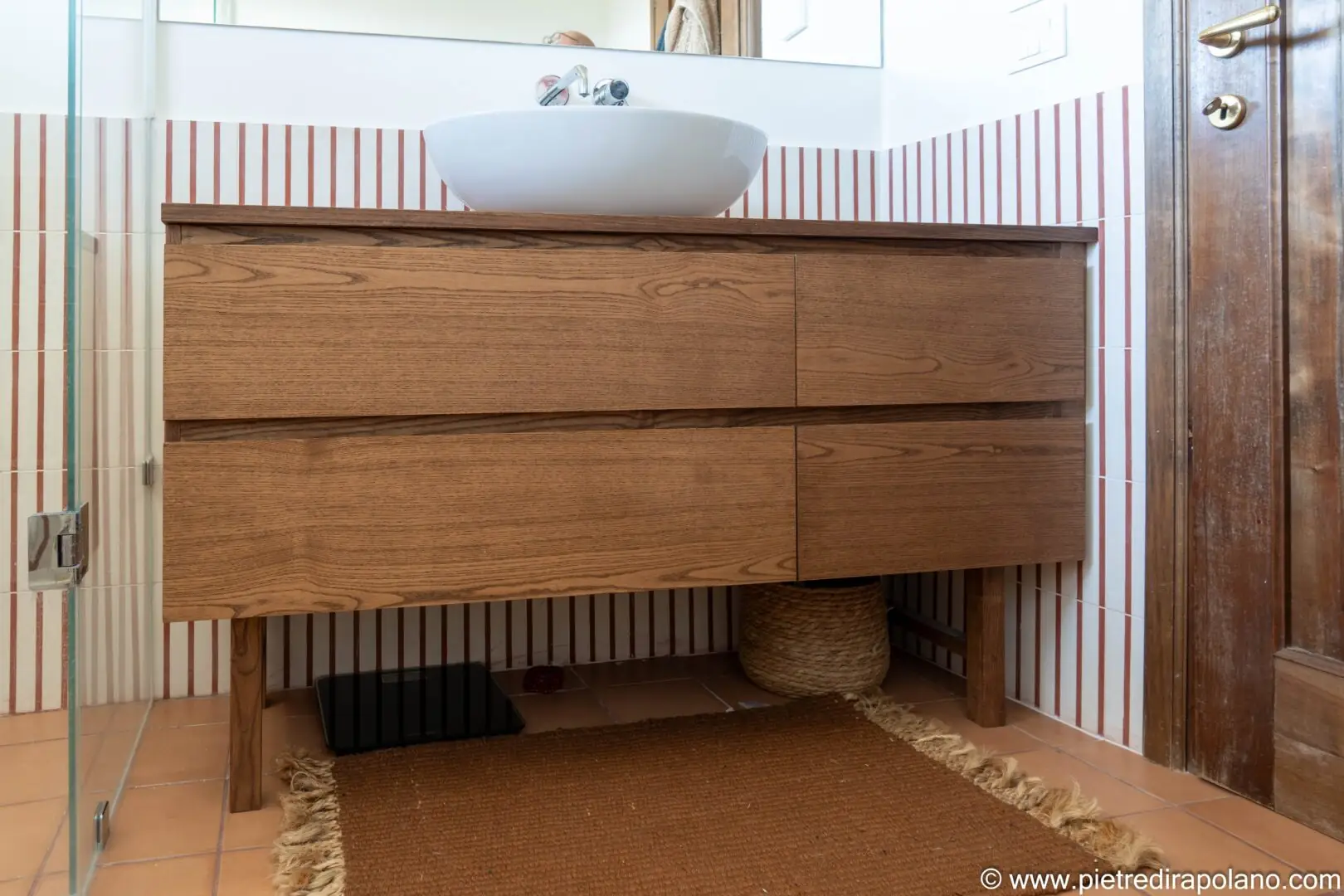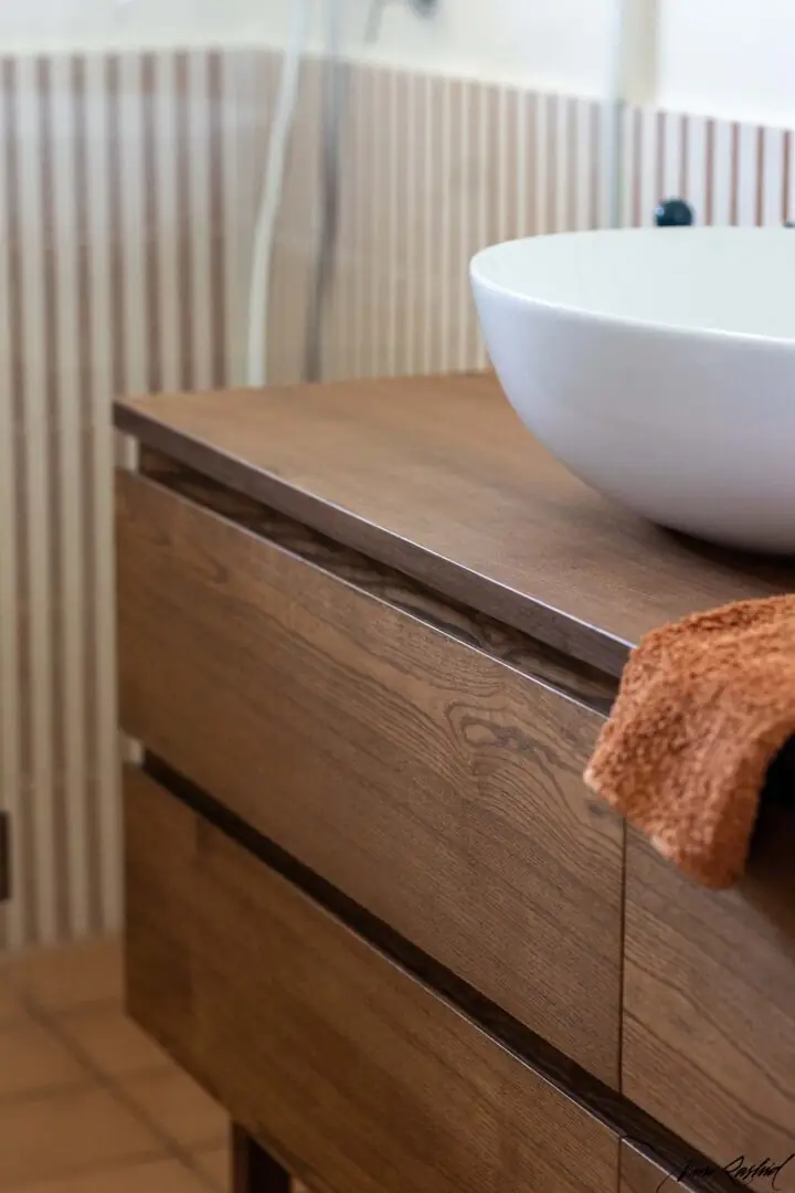 - Hängeschrank auf Beinen: Wir haben einen beeindruckenden Waschtischunterschrank mit einer Oberfläche aus dunklem, gemasertem Eichenholz gefertigt. Die Struktur zeichnet sich durch breite, durchgehende Schubladen aus und ruht auf minimalistischen Beinen, was die visuelle Wirkung auflockert und die Reinigung des Terrakottabodens erleichtert.