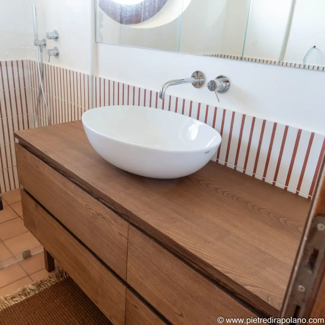 - Materialkontraste: Die horizontalen Linien des Holzmöbels treten in Dialog mit der Wandverkleidung aus vertikalen Fliesen (weiß mit braunen/roten Streifen) und schaffen so ein ausgewogenes und raffiniertes visuelles Spiel.