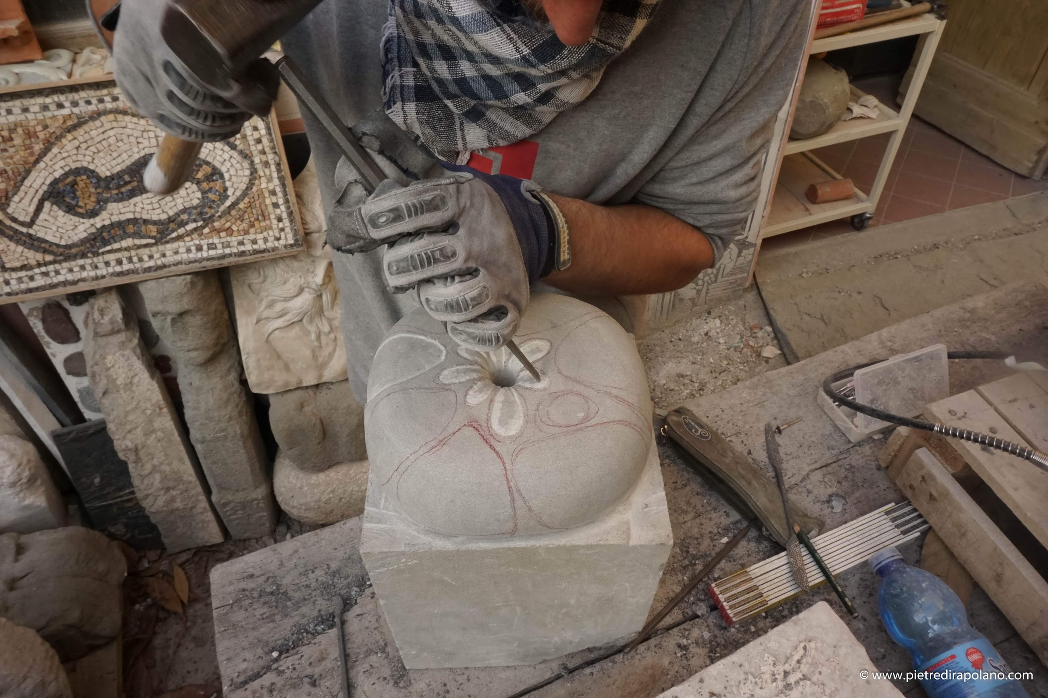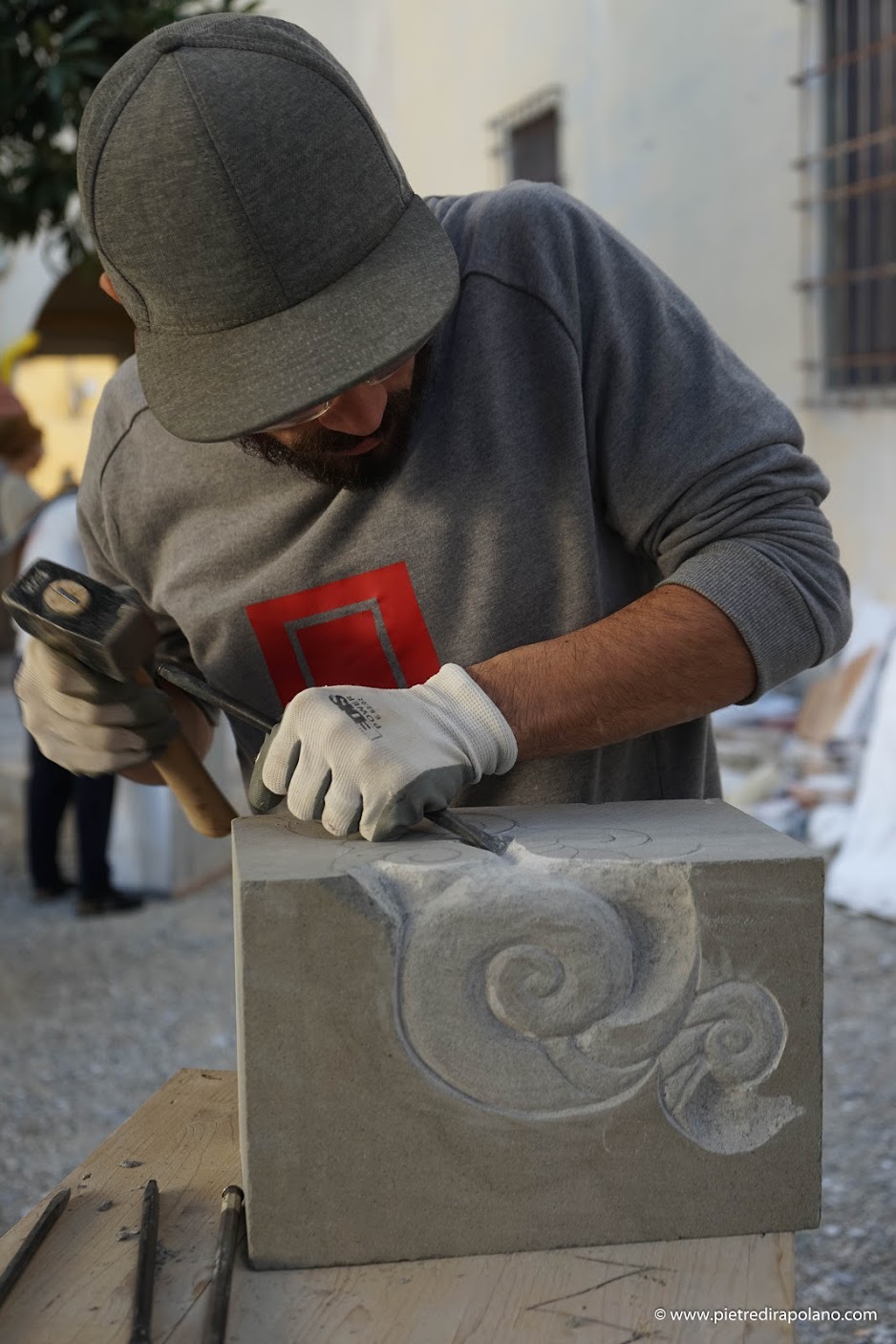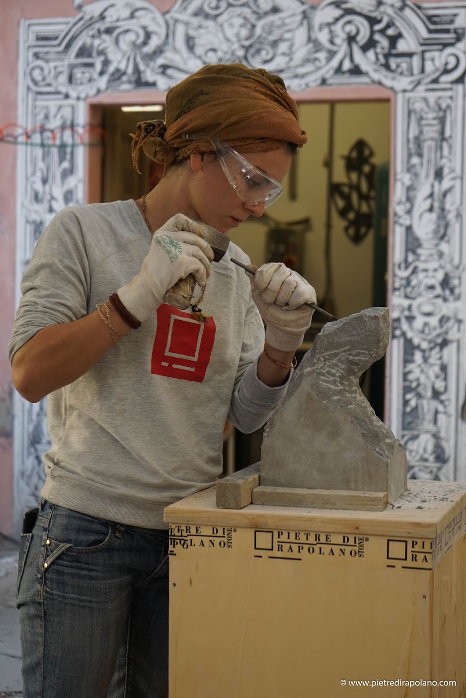 Drei Tage lang bearbeiteten vom Prof. Francesco Roviello, Dozent für Steinskulptur, ausgewählte Studenten einen Steinblock, um ihn in ihr Kunstwerk zu verwandeln.