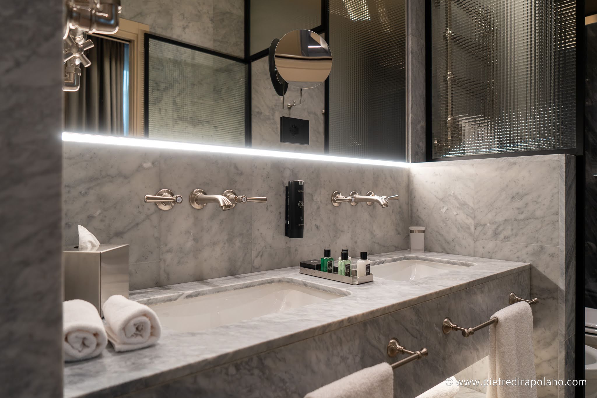 A departure from the once-dominant basic palette, with warmer colors making a comeback: this change includes a revival of materials like antique marble and travertines, reminiscent of 90s styles.