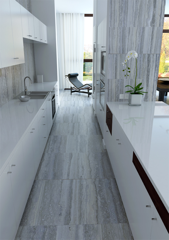 This travertine, suitable for floors and coverings, especially in the bathroom and kitchen areas, is part of the Woodline collection, special selections of travertine from the Rapolano quarries cut against the grain, with sharp horizontal veins reminiscent of wooden parquet planks. It is a highly tactile material with shades ranging from beige to dark brown. To view all products in the Woodline collection click here
