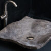 Rectangular countertop sink made of dark marble in shades of brown and black (dark emperador type). The innovative design with a crafted edge gives it a contemporary and elegant look.