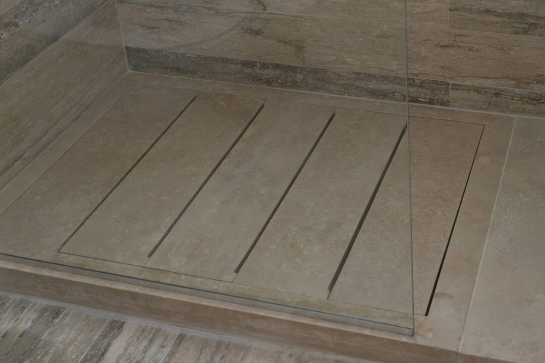 We designed the shower tray “Doghe” with a robust perimeter frame that outlines the shower tray itself and two different variants of slats: in travertine or solid wood.
