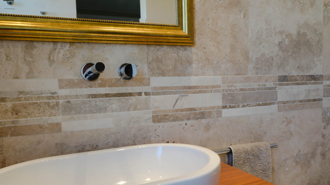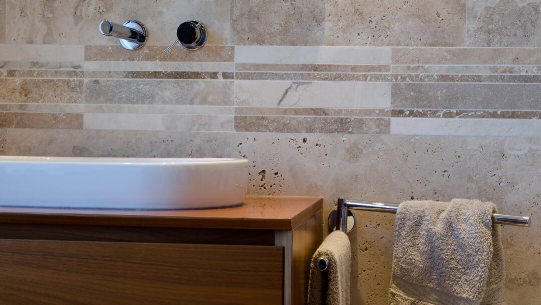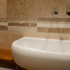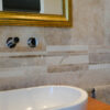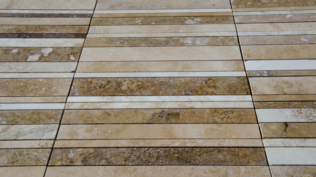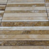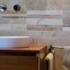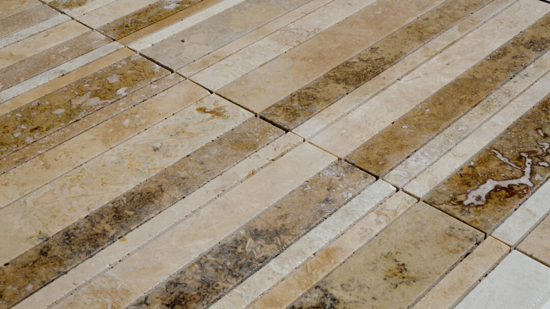 The Bars HF Tuscany Mix mosaic is made of travertine strips selected in various colors from light beige to brown, provided assembled on a mesh for easy installation. The strips are 30.5 cm long and have widths ranging from 1.5 to 5 cm; the surface finish of the pieces is “Modern”, filled and polished, making the product easy to clean and maintain.