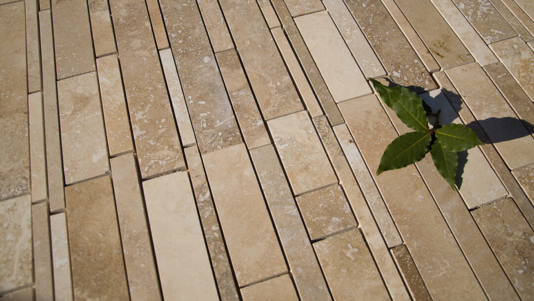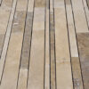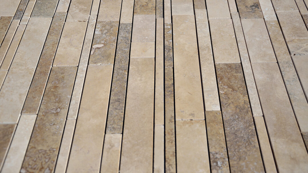 Mosaic with travertine strips of various sizes combined to form an “antique” surface. These strips are selected in various shades of travertine and then assembled on a mesh for easy installation.
