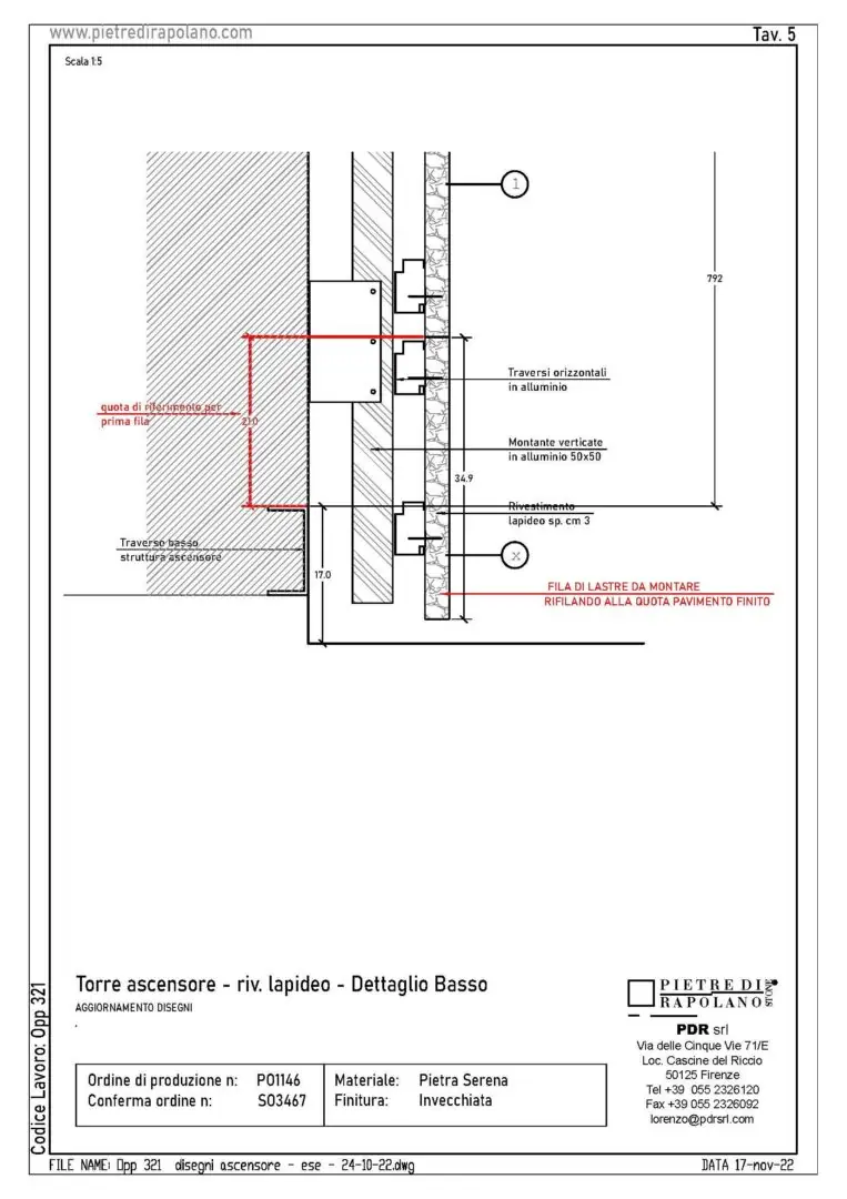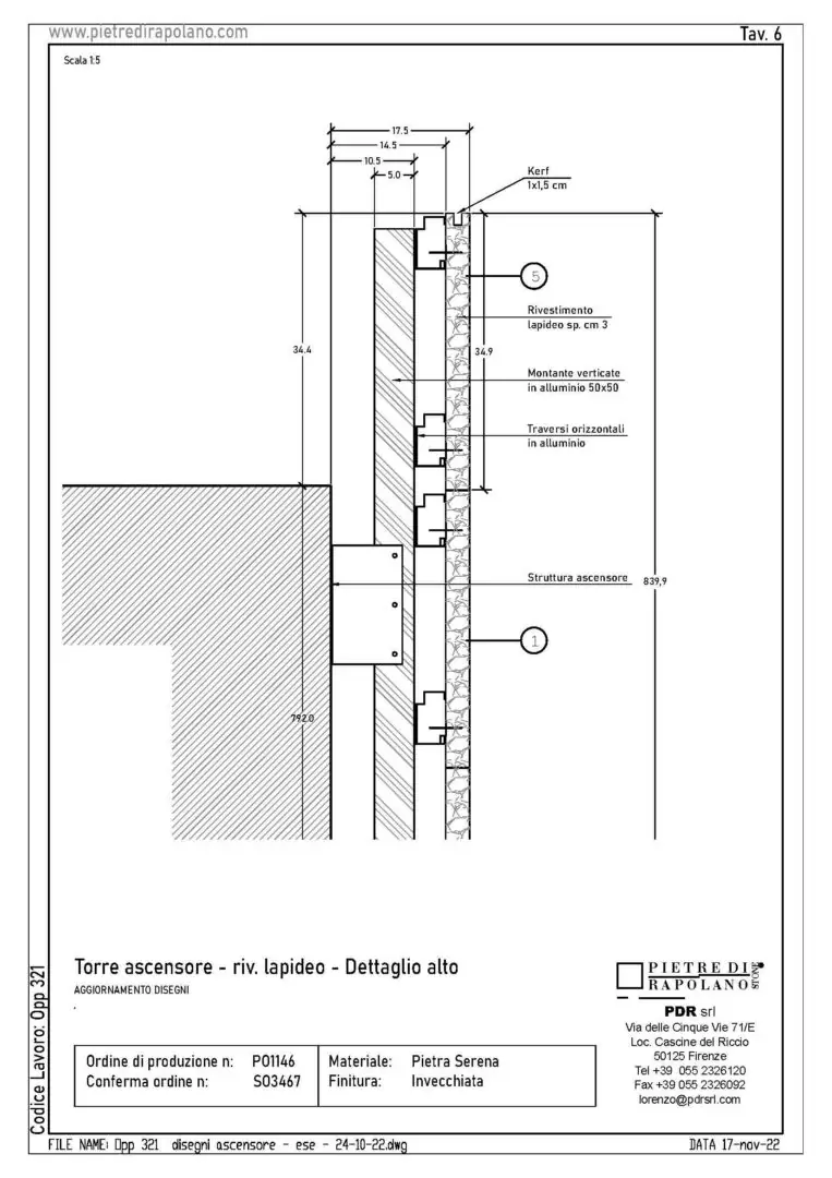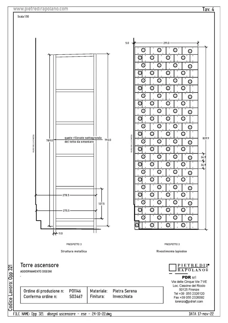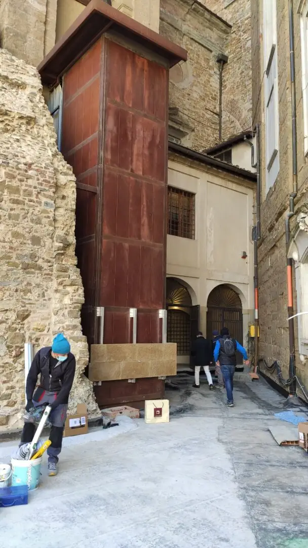 For the cladding of the existing steel elevator, the requirement was to find a solution that would mediate between the modernity of the structure and the historicity of the surrounding walls. The choice fell on aged and oxidized Pietra Serena.