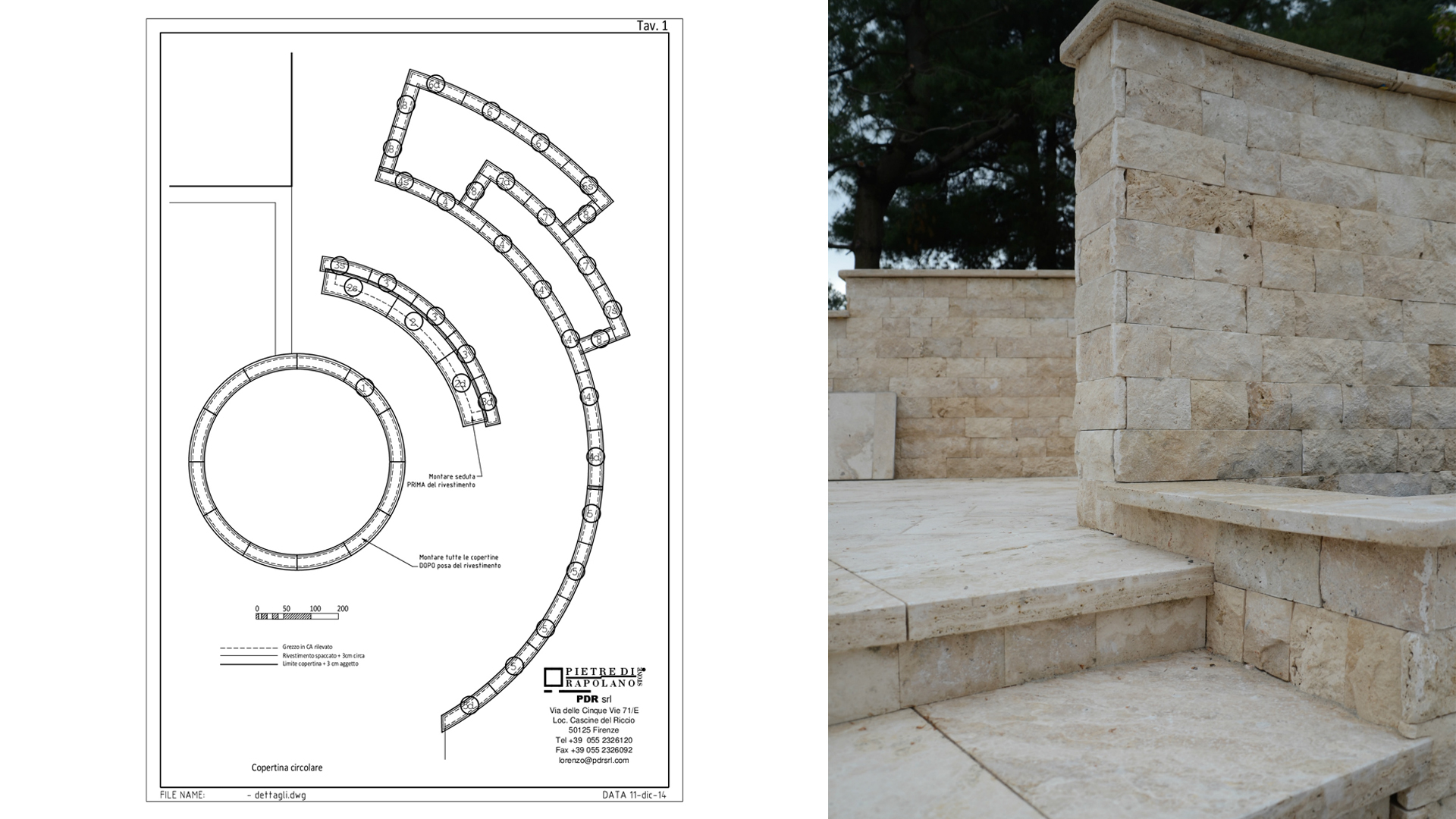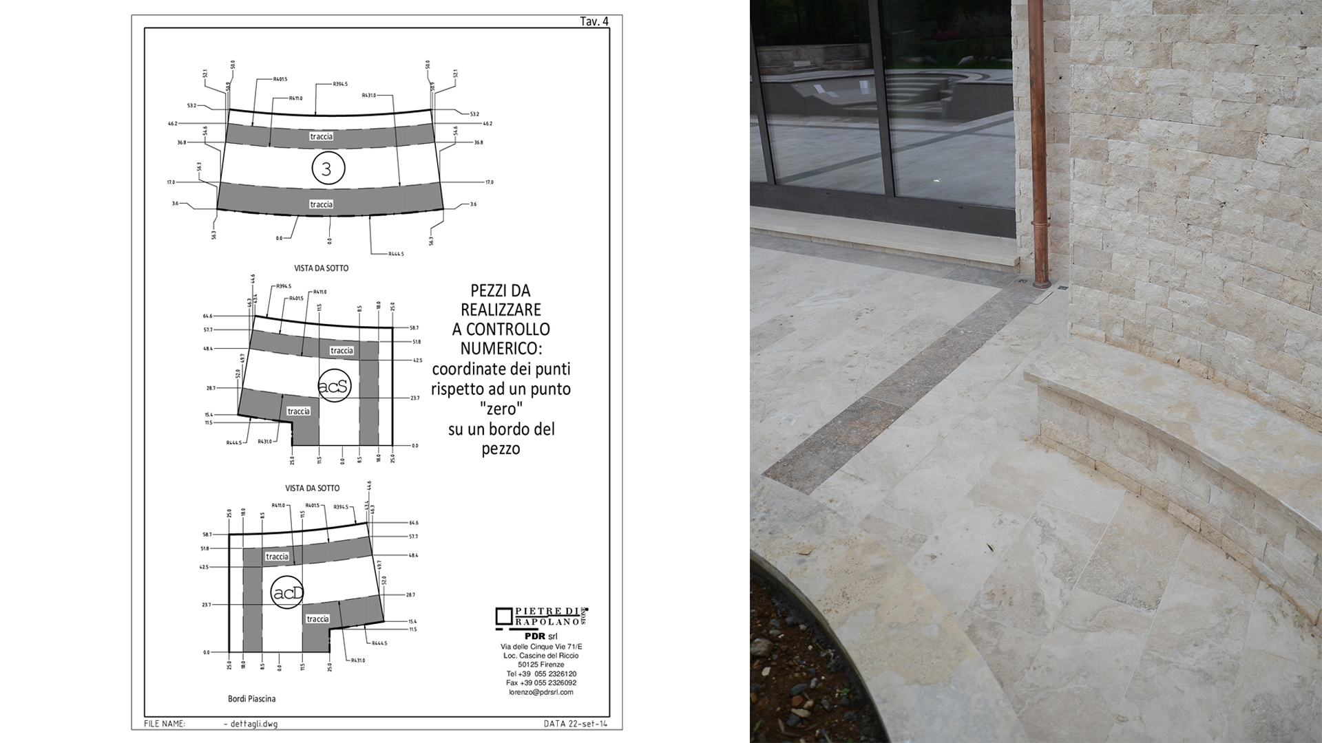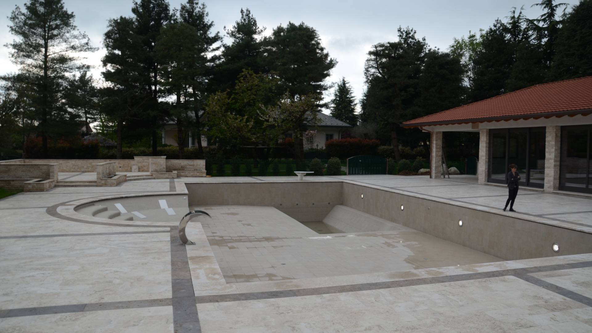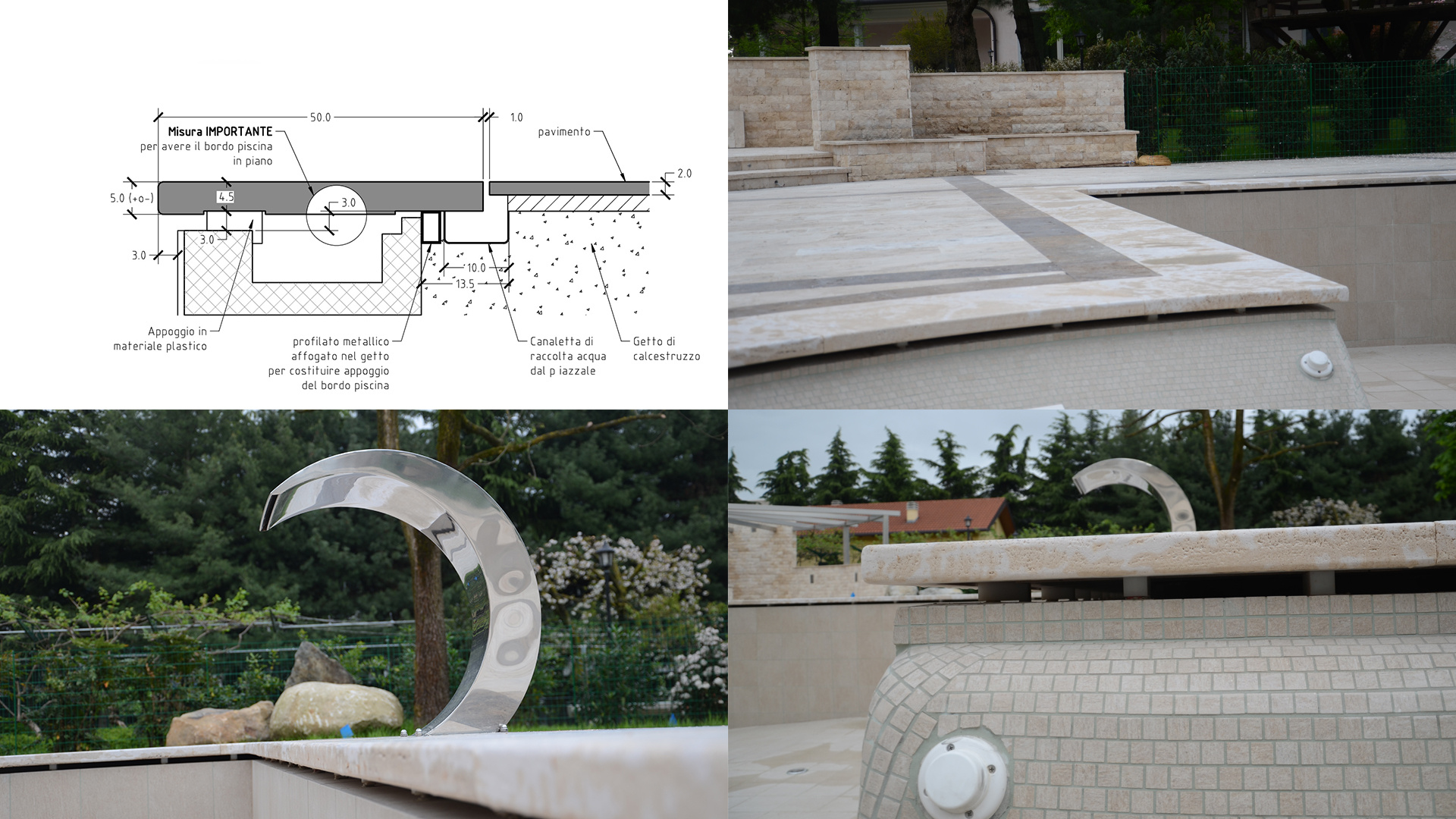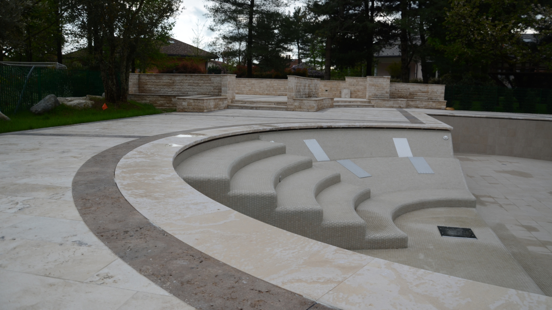 The various curved pieces, stairs, walls, and pool edges were custom-made to measure, after a careful survey conducted on site, to provide a perfect match between these and the actual site conditions.