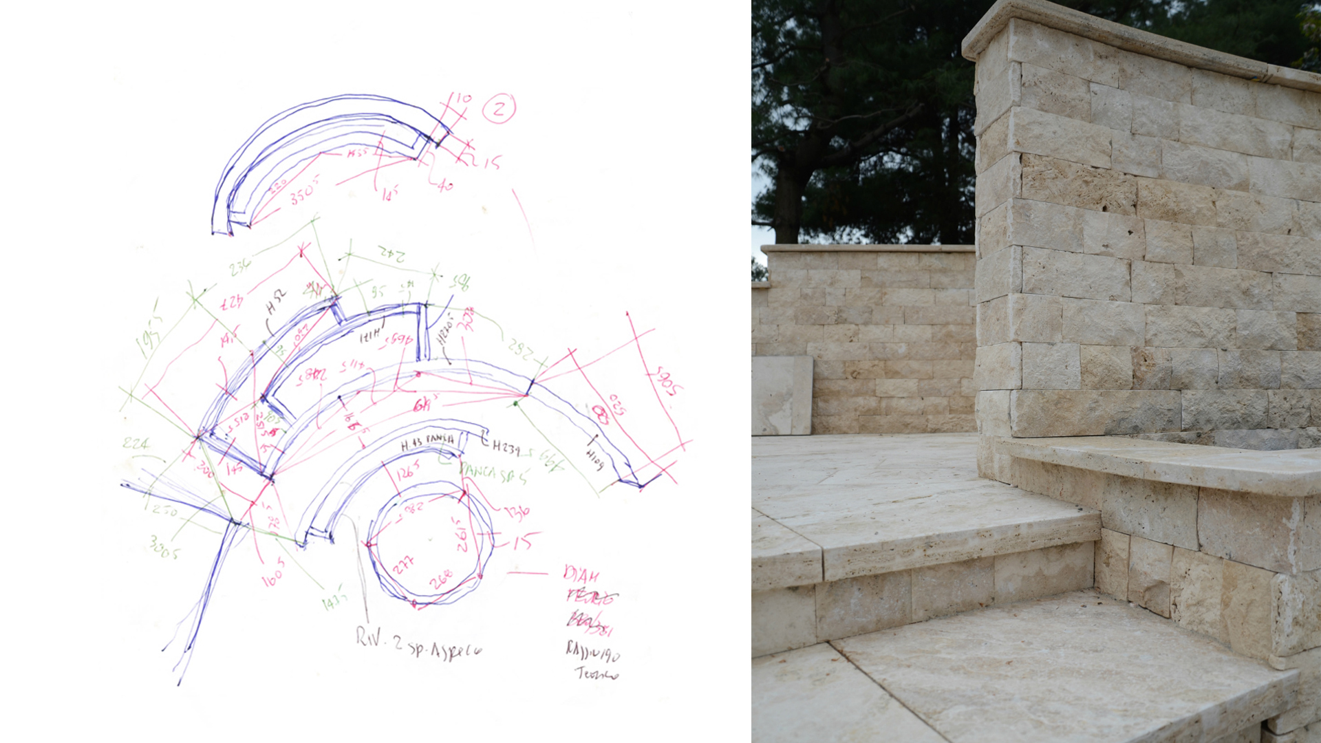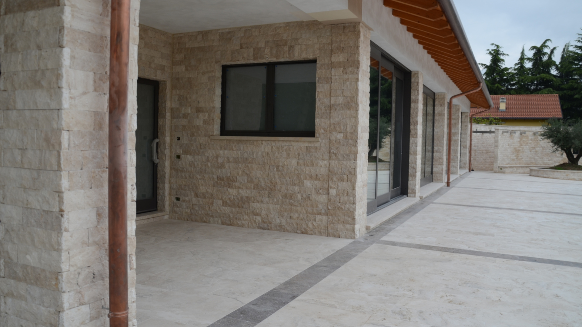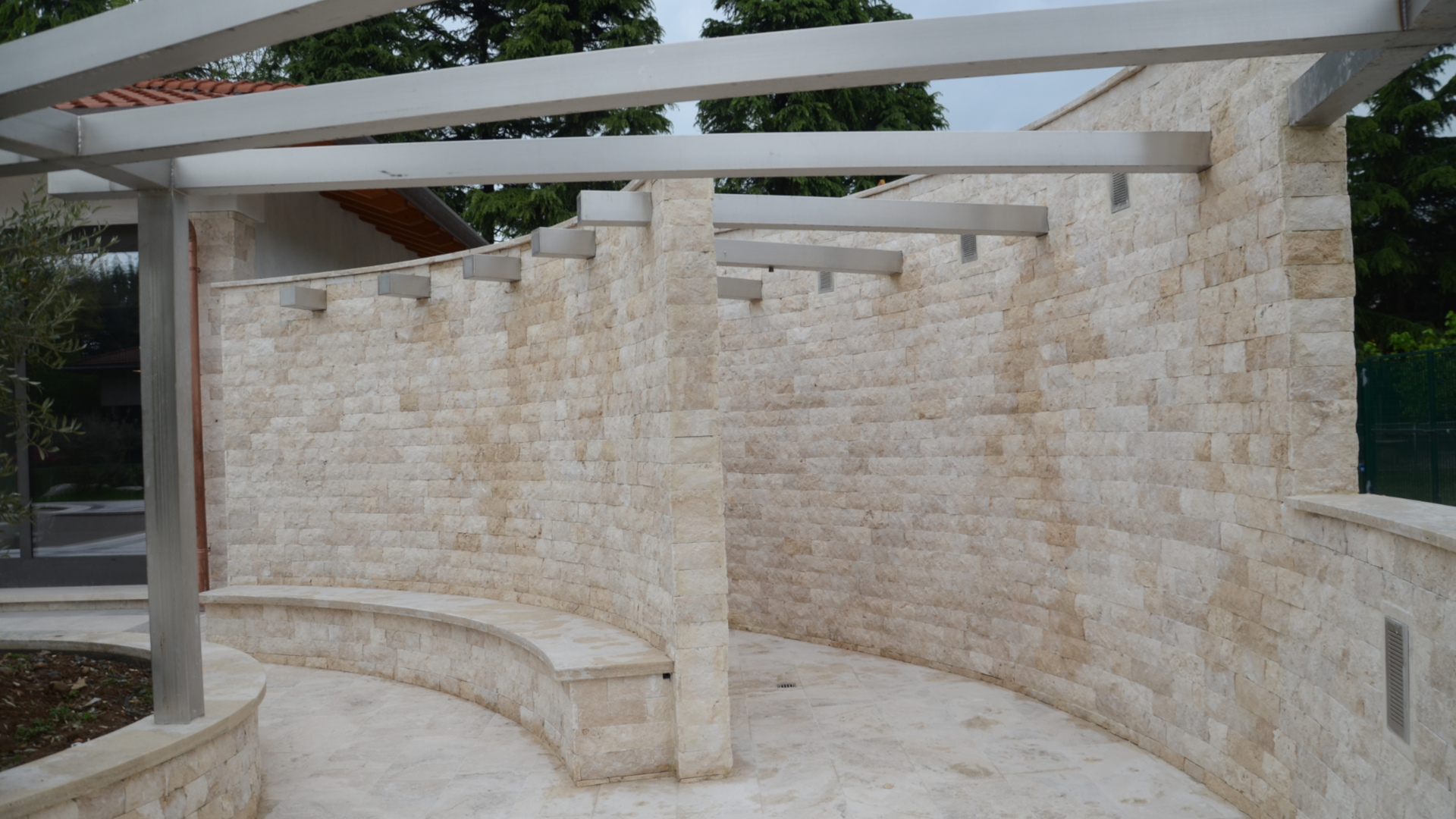 The project also included the supply of all the cladding for the boundary walls of the spaces with quarry-split travertine.