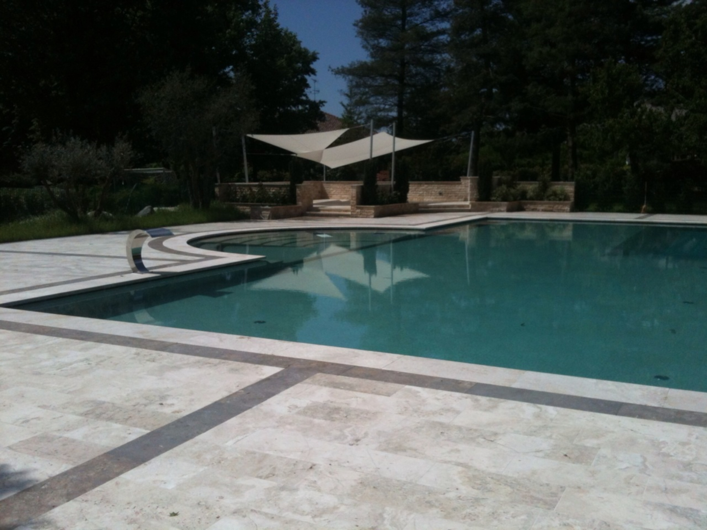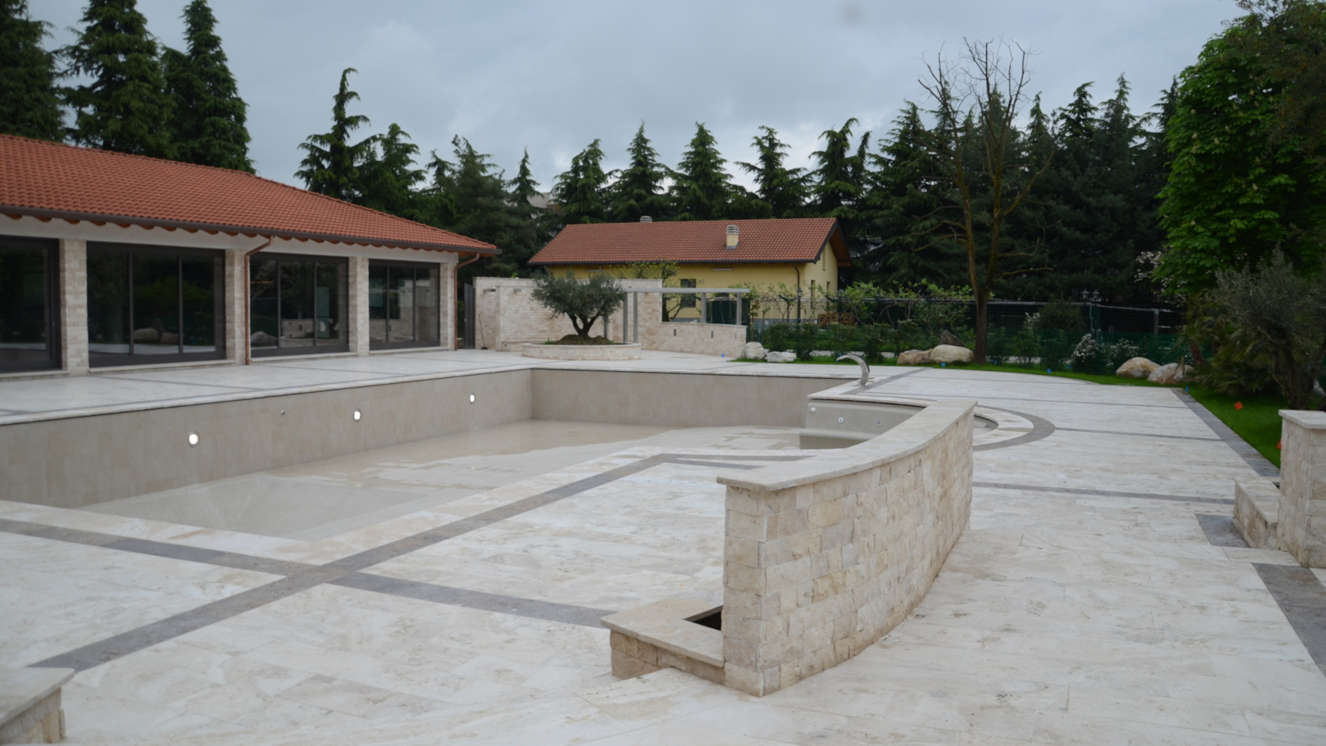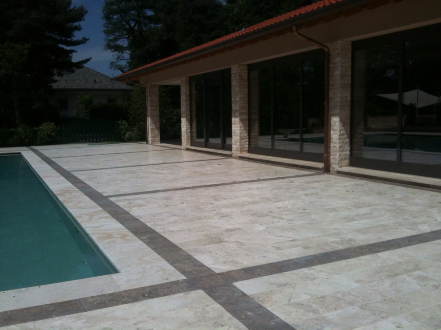 The choice of travertine for defining pools is particularly suitable. This material indeed is born in water, withstands outdoor use very well (even in cold contexts, where temperatures can drop below zero) thanks to the non-frost susceptibility of travertine and ensures adequate non-slip properties due to the intrinsic characteristics of the material.