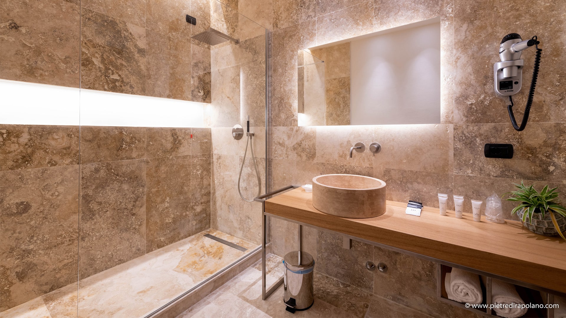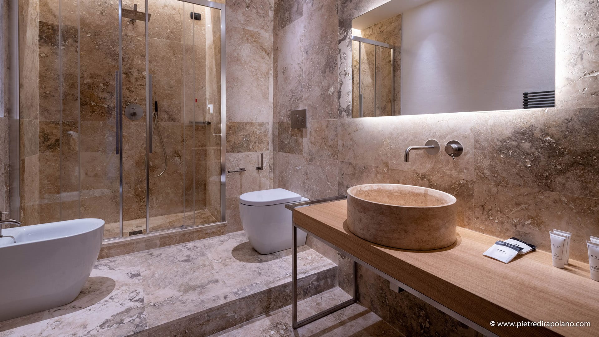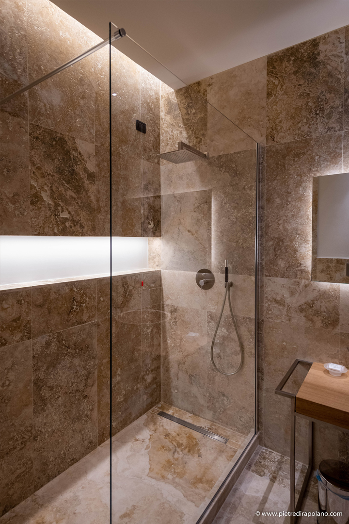 The floors and wall coverings of the bathrooms were made with PDR013 light earth travertine in the Rural finish (unstuccoed polished), a choice made in harmony with local traditions and the surrounding landscape.