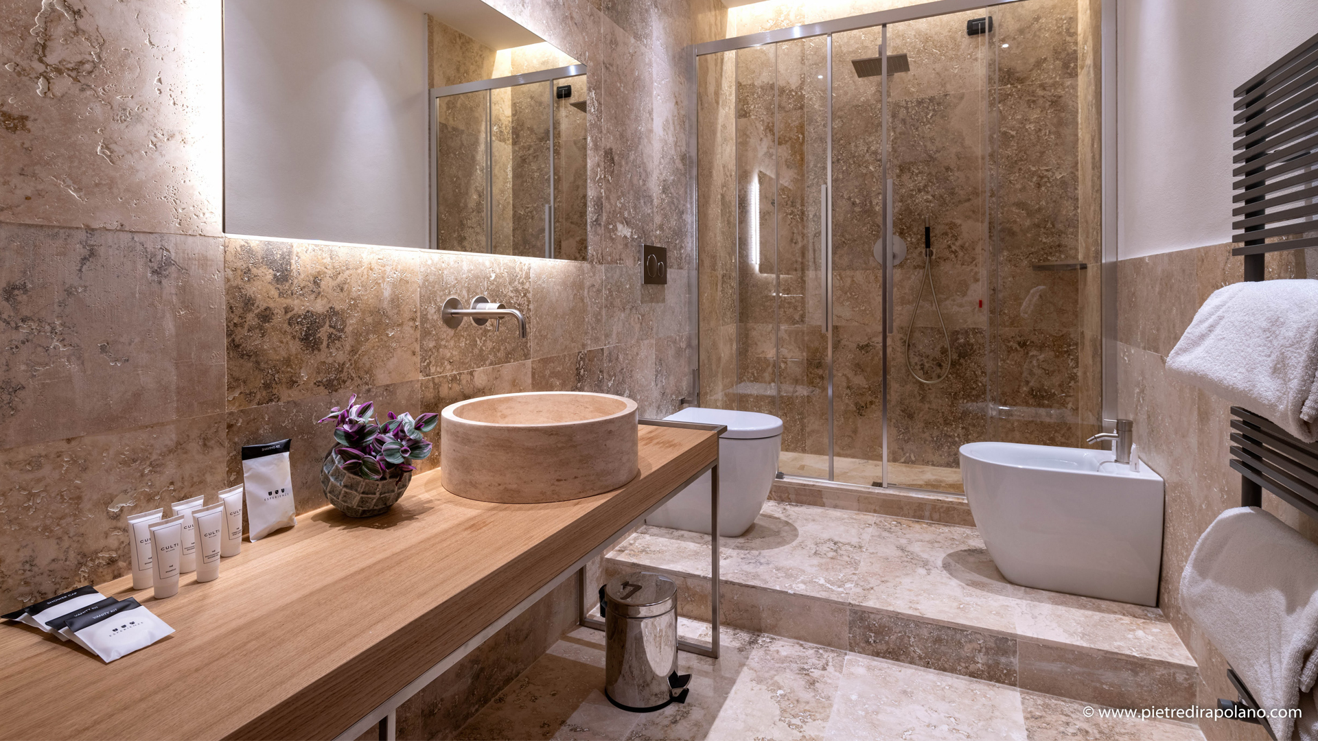 The supply also included bathroom furniture: boxwood tops mounted on a stainless steel structure with an integrated towel rack. For all the furniture, solid travertine bowl sinks (models Tonda, Tonda slim, Fiano) were used, and in one of the rooms, the freestanding sink Cono.
