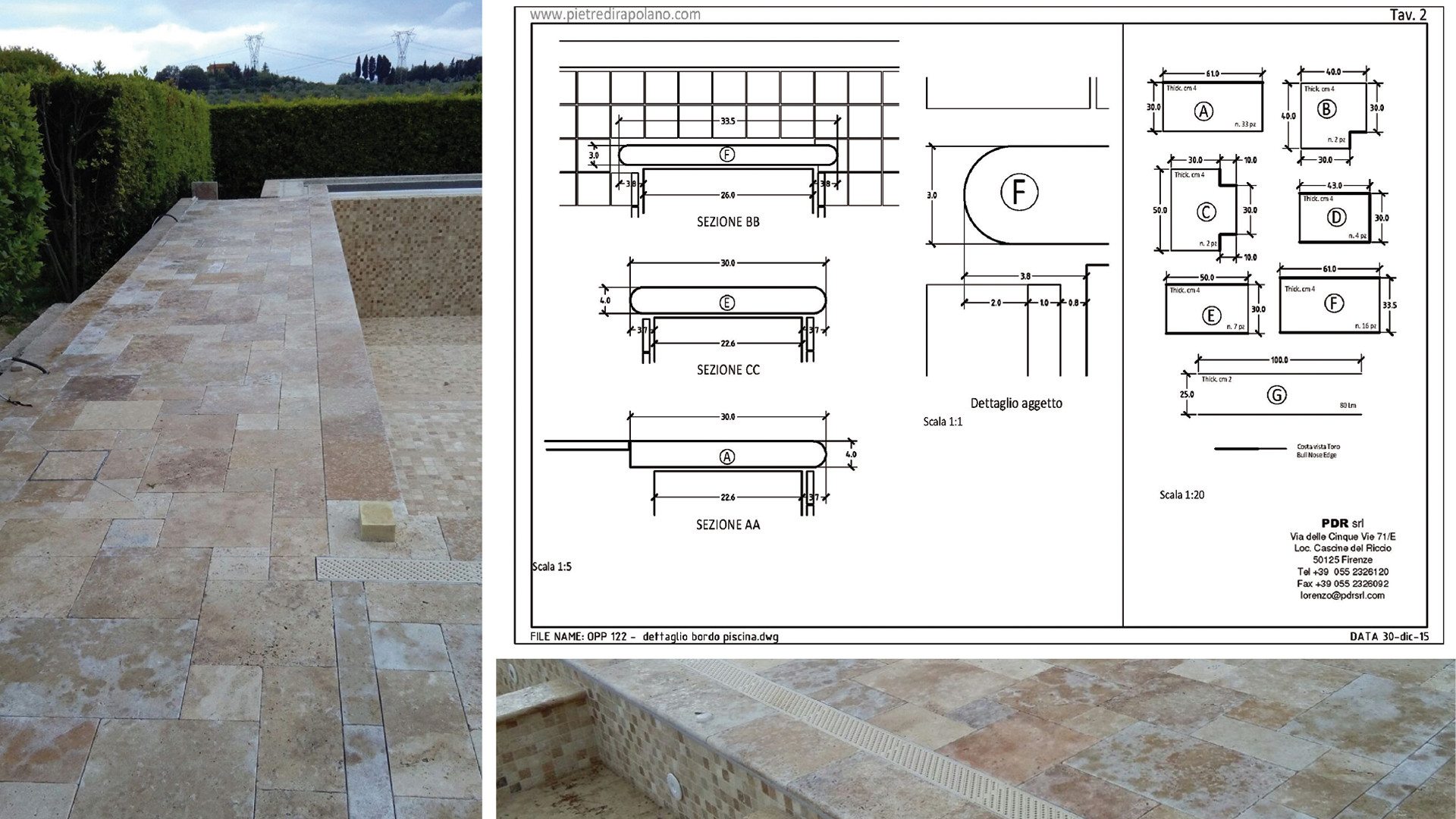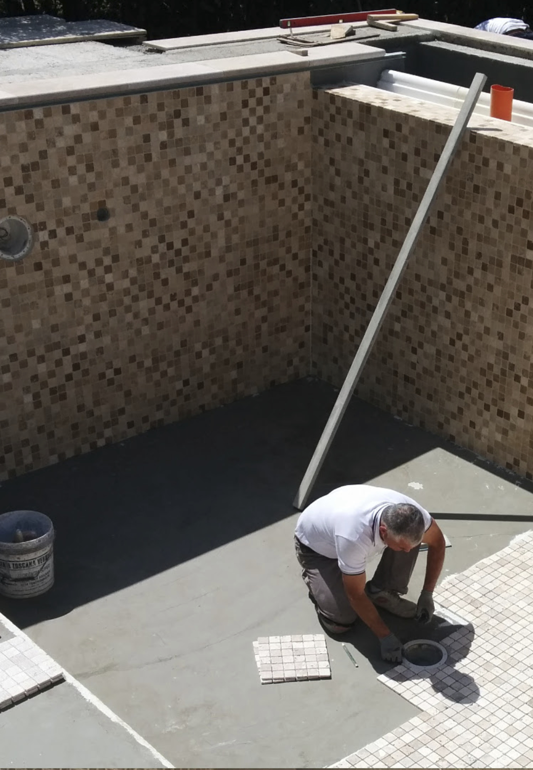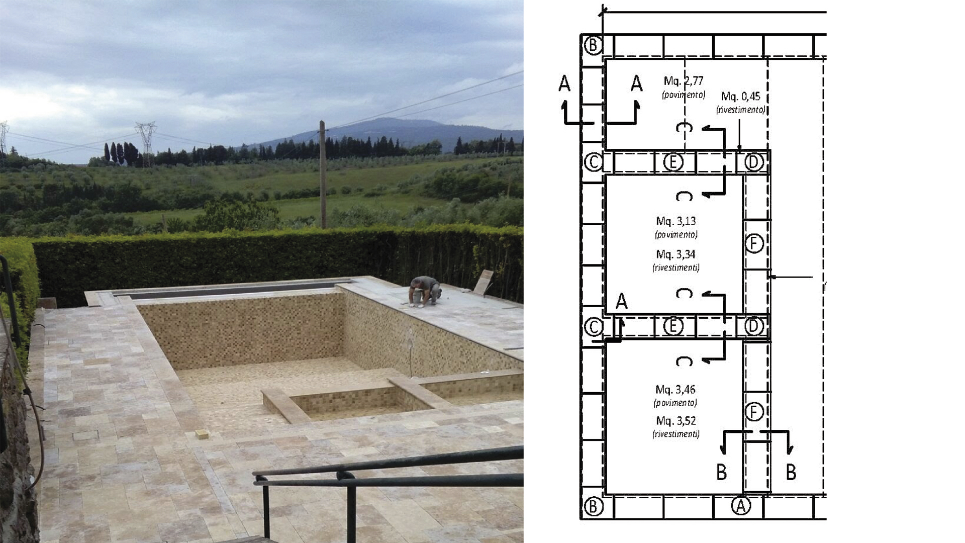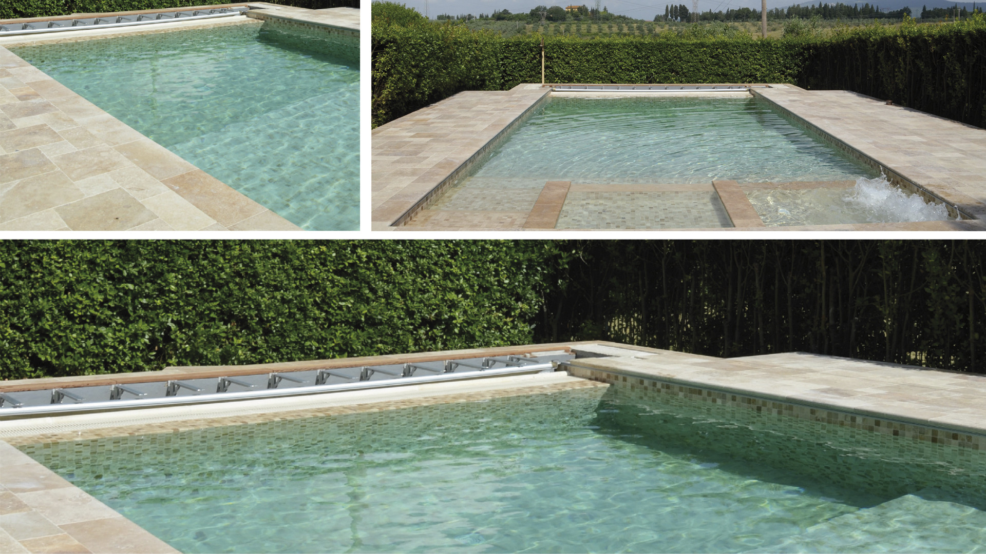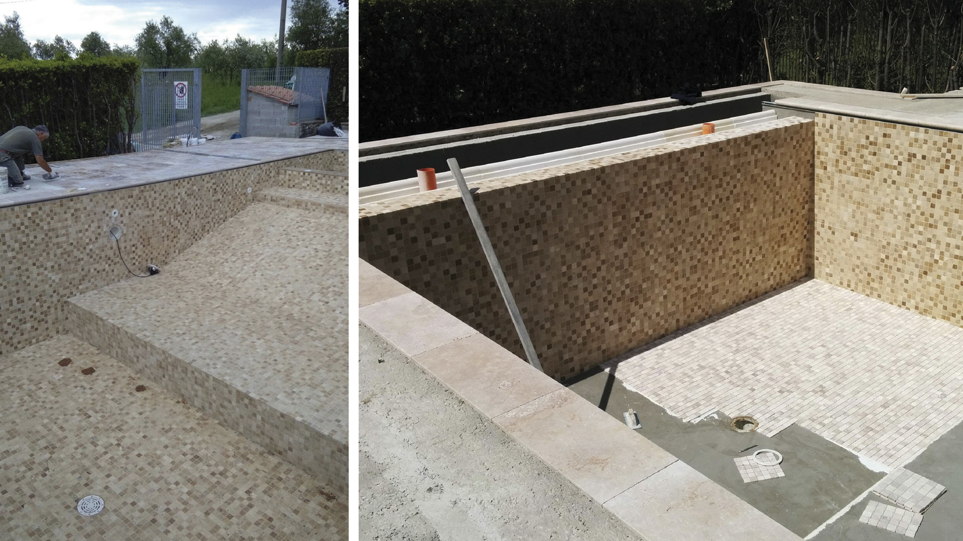 Initially, the work plan included the creation in travertine of only the edges and surrounding areas, while the interior was planned in PVC: this was decided due to concerns about using stone in contact with water treatment products.
