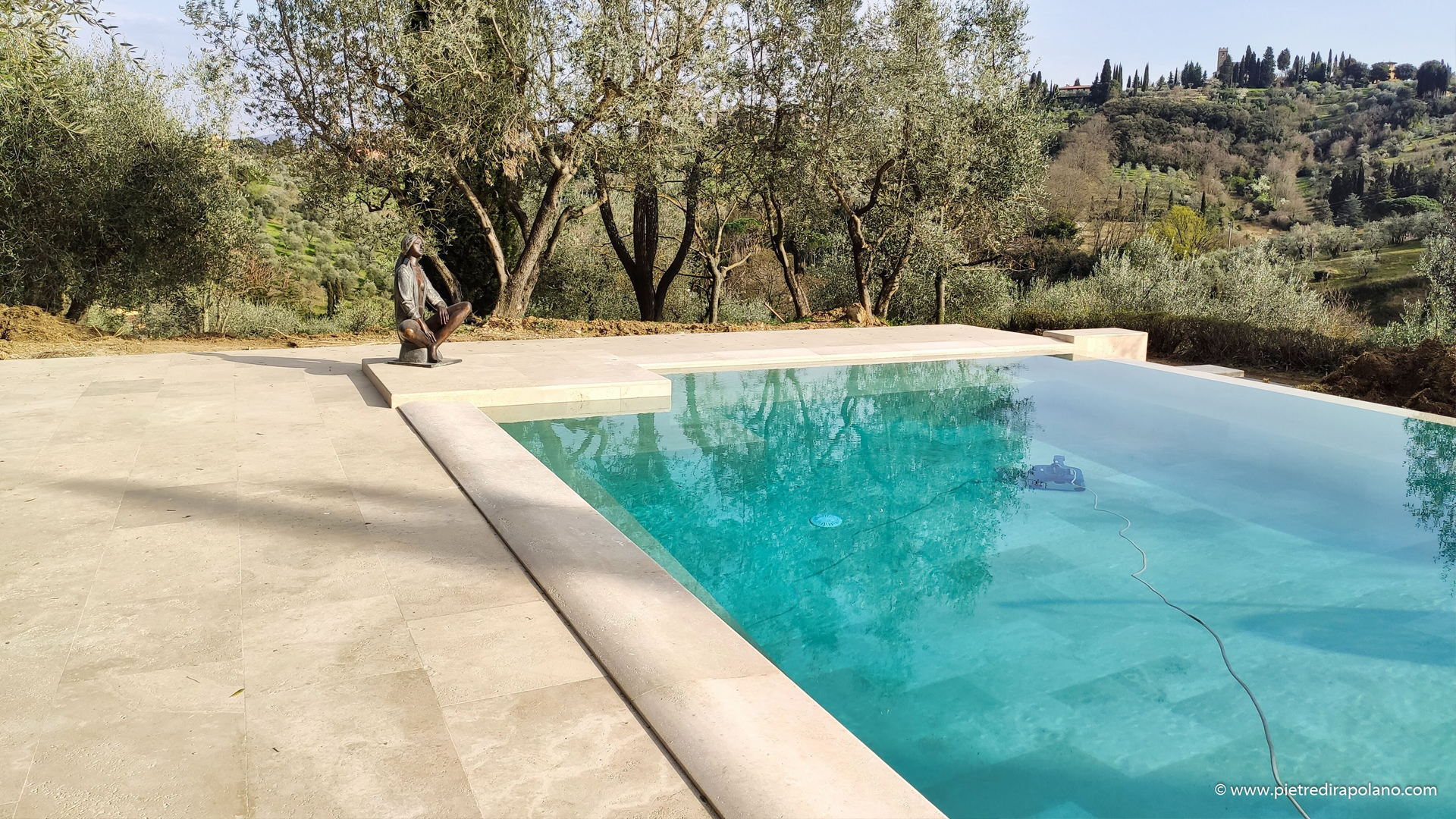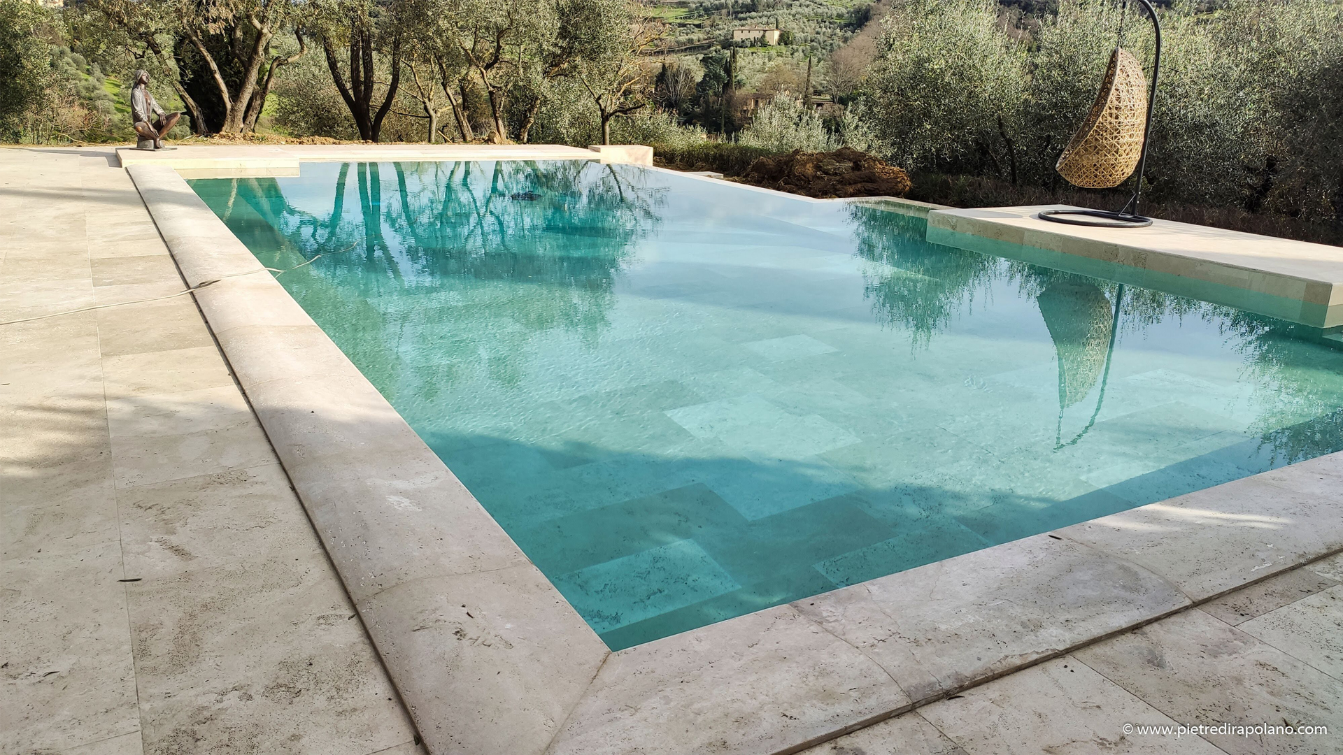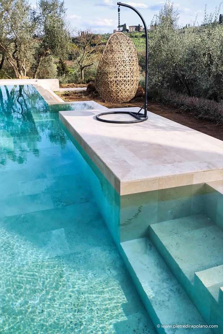 Travertine in pools is confirmed once again as the most suitable choice, both for its slip resistance characteristics and its compatibility with water, being a material that geologically originates in water.