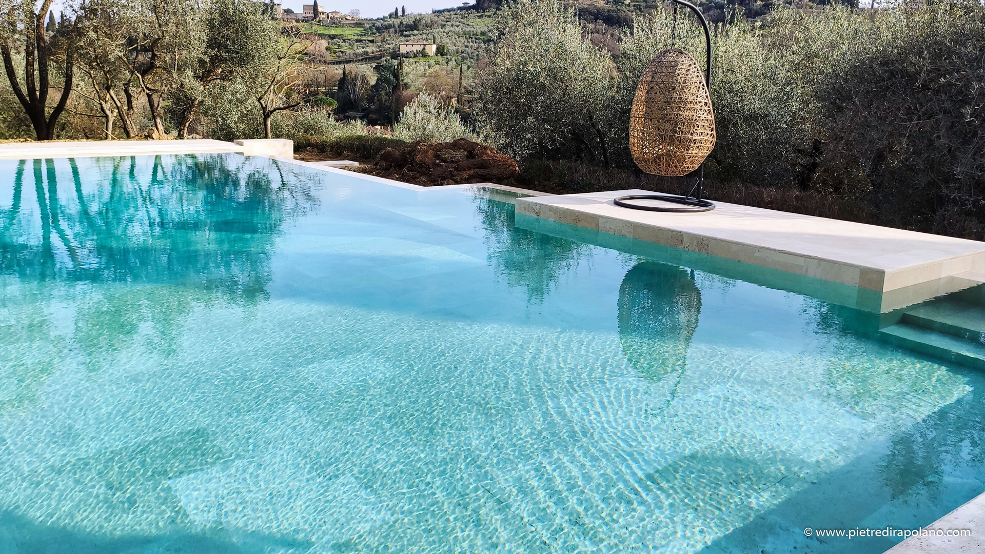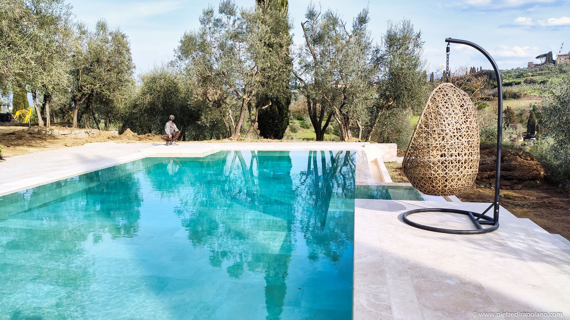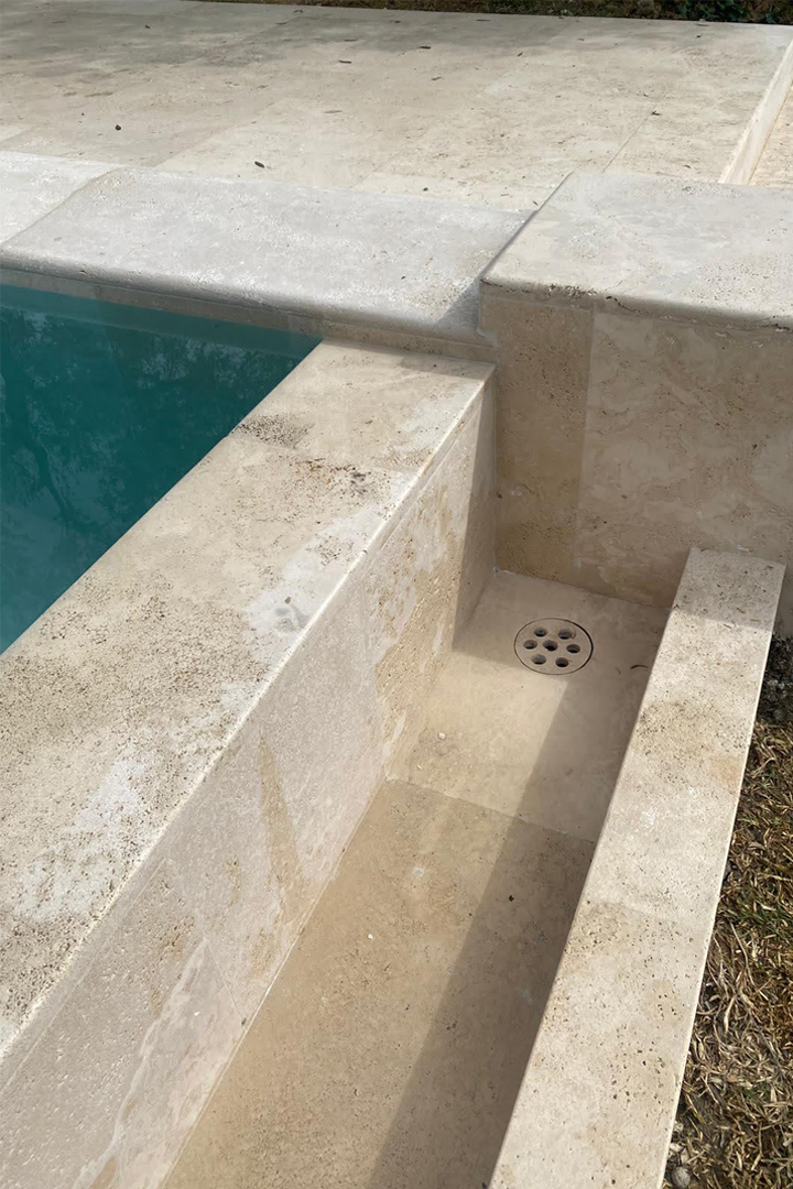 Travertine in pools is confirmed once again as the most suitable choice, both for its slip resistance characteristics and its compatibility with water, being a material that geologically originates in water.