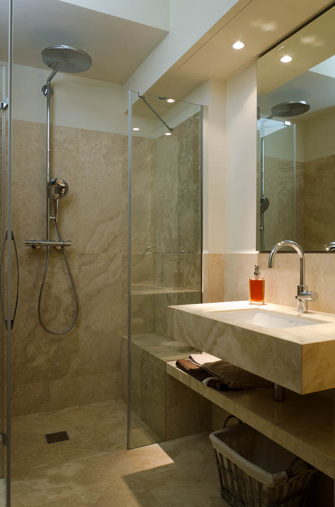 To give uniformity to the bathroom, the same travertine was also used for the recessed sink countertop.
