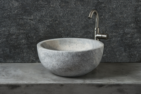 Ideal is a sink like FIANO, round-shaped and made of grey travertine with a soft and simple design, or a rustic-looking sink like TONDOZZO in light travertine with a chiseled surface.