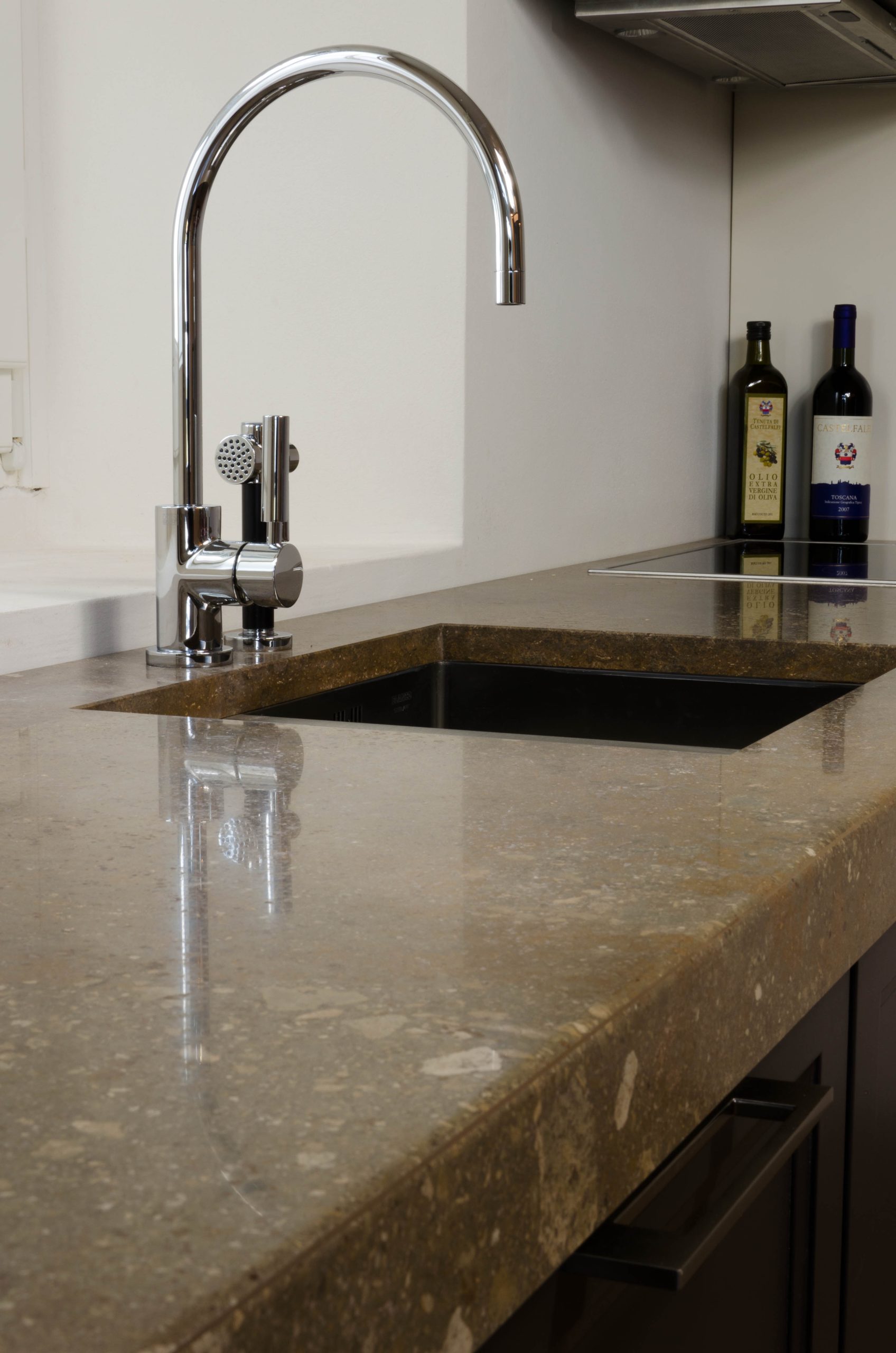 Even in the bathrooms of the residence, Pietre di Rapolano travertine is present, both for the coverings of some walls and for the countertop sinks. Among the available sinks, three different models were chosen: Guscio, with a characteristic shape reminiscent of a hard-boiled egg without the yolk, Sphera, semi-spherical and light-colored, and Fonterutoli, flat-shaped but with a wide diameter.