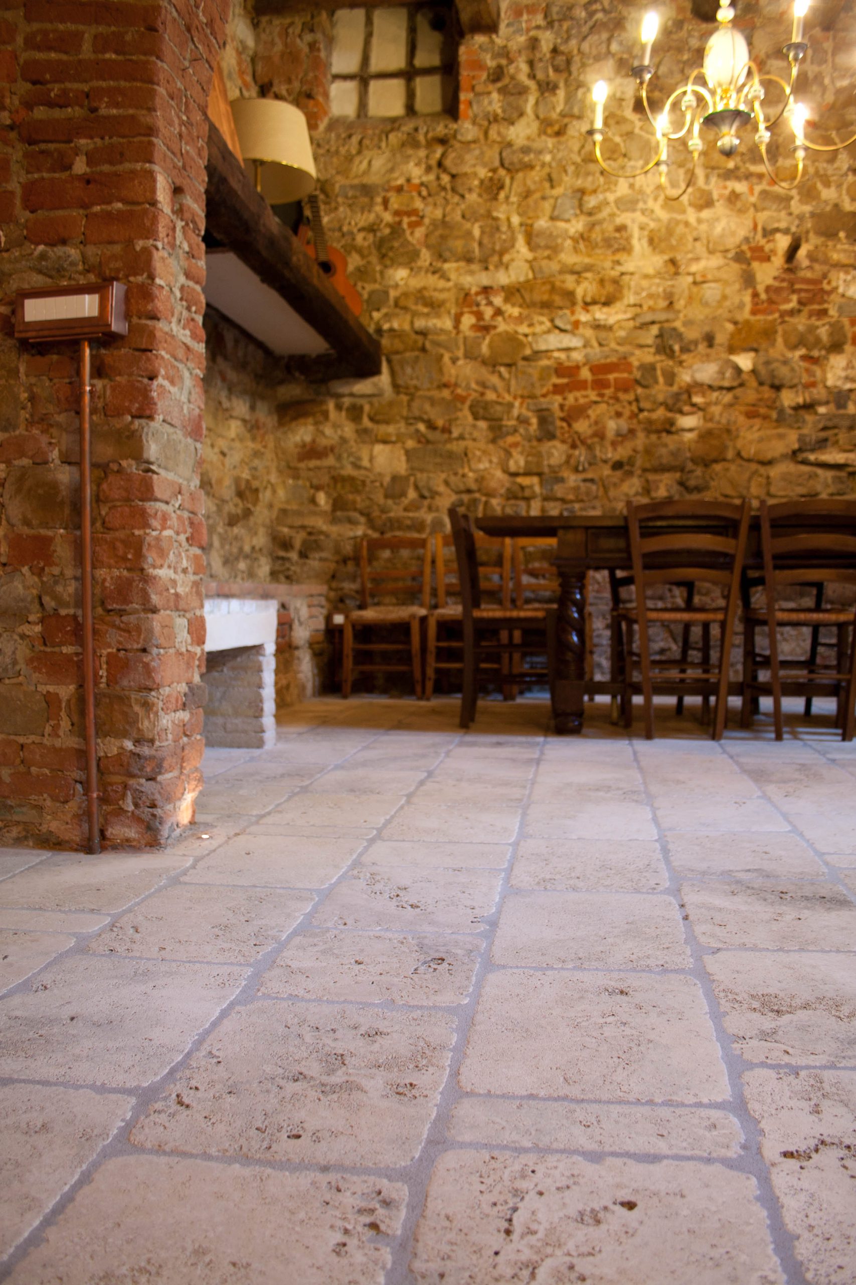 Per l’ampio ed elegante soggiorno e per l’esterno sono state utilizzate mattonelle in travertino Nuvolato Gold, una selezione di colore dai toni tipici della Toscana. Questo tipo di travertino toscano ha infatti variazioni cromatiche molto particolari con un fondo chiaro e tipiche macchie e venature di colore giallo oro.