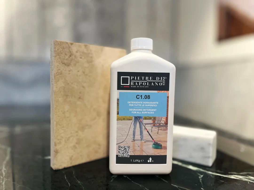 C1.08 – Detergente Sgrassante (1 Litro): Un detergente alcalino concentrato ad altissima efficacia. È fondamentale per la pulizia di “fine cantiere” o per sgrassare a fondo superfici molto sporche prima del trattamento protettivo. Elimina residui organici, cere e sporco ostinato senza danneggiare la struttura della pietra.