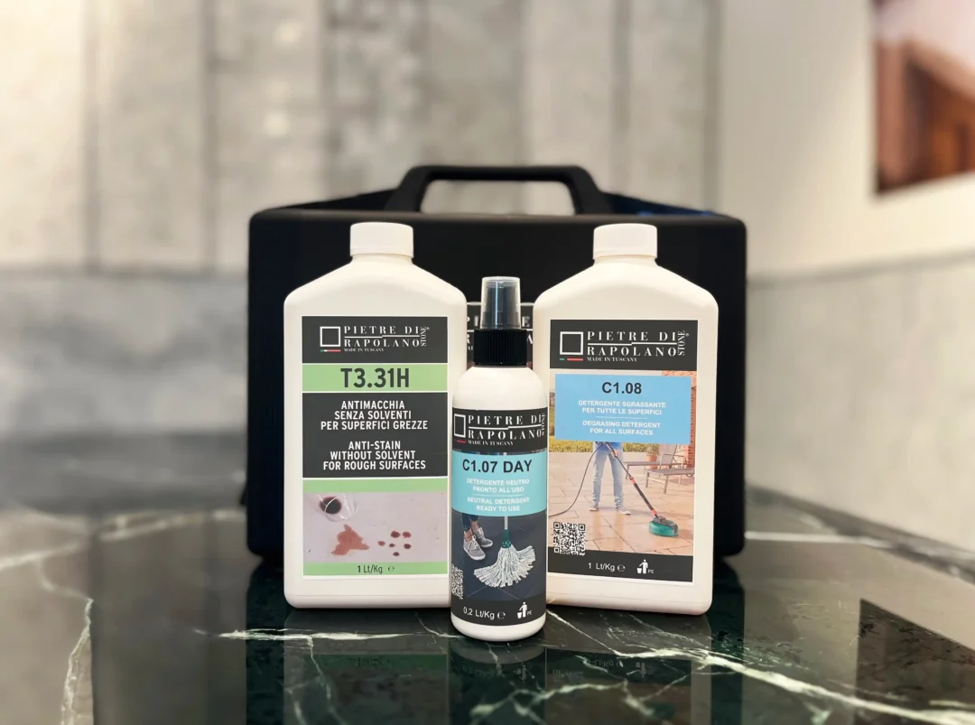 Il Kit Primo Splendore di Pietre di Rapolano è il sistema professionale definitivo per chi deve affrontare il primo trattamento o il ripristino profondo di pavimenti e rivestimenti in pietra naturale, travertino o marmo.