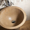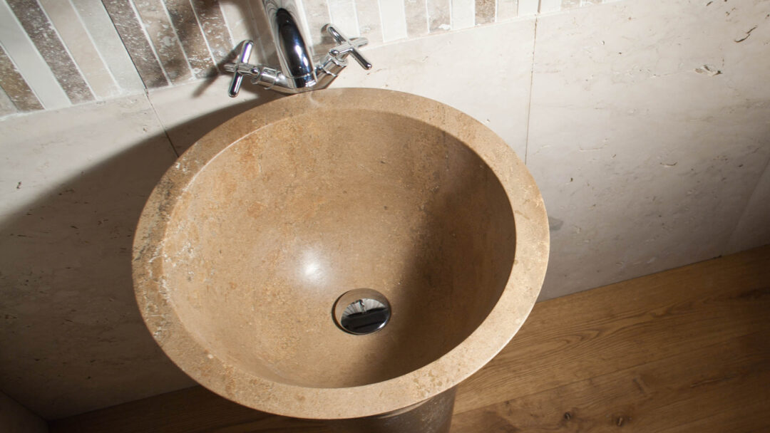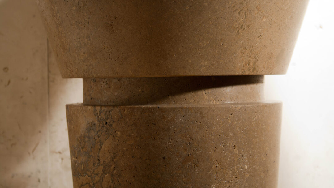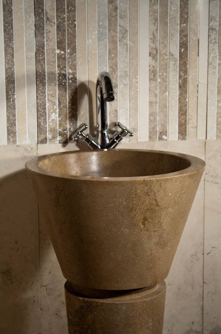 Lavandino dalle linee semplici e pulite, realizzato da due blocchi di travertino noce scuro, è adatto per donare al bagno un aspetto contemporaneo: molte volte viene installato inserendo un cristallo fra il lavello e la base per creare un piano d’appoggio.