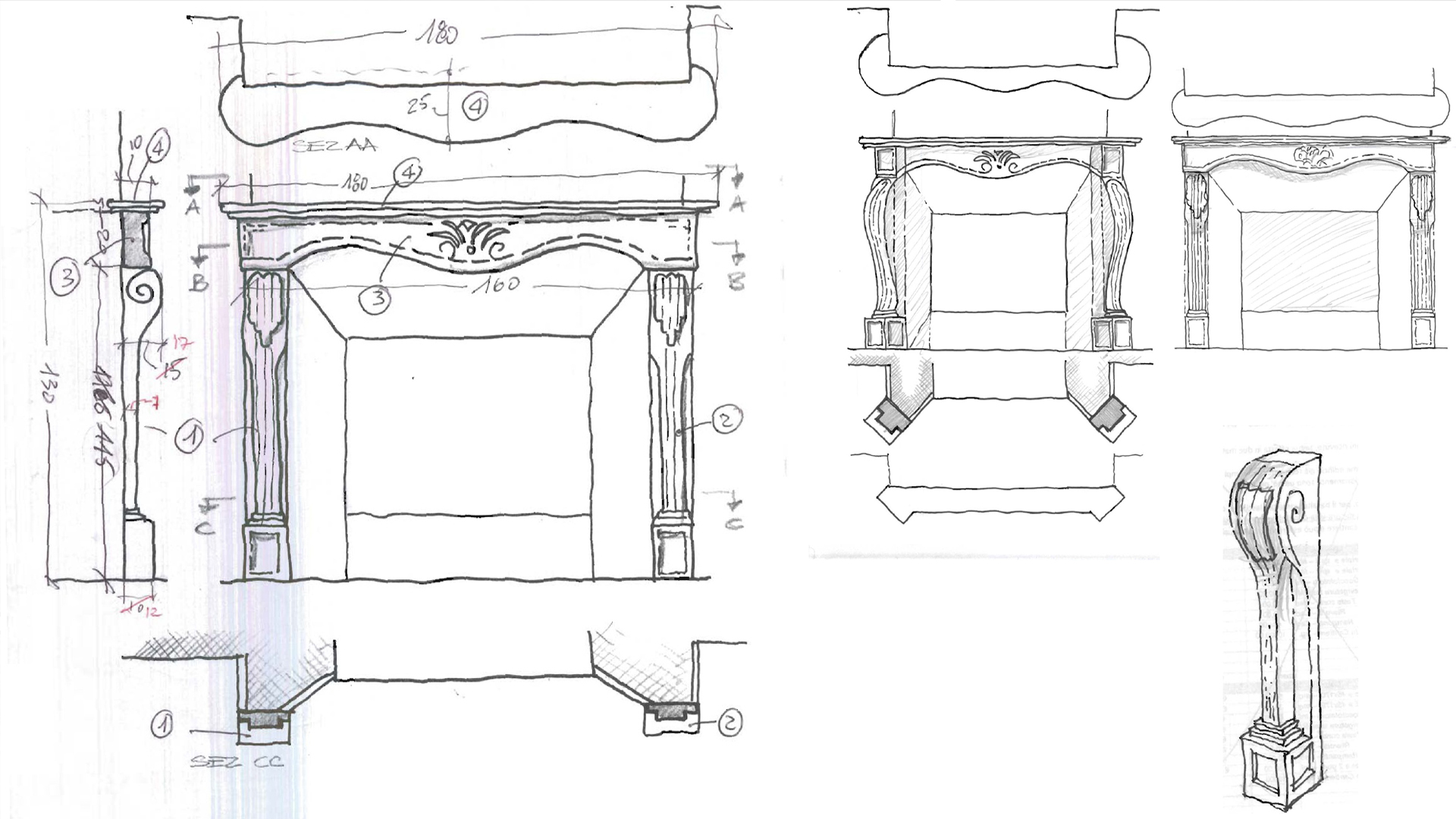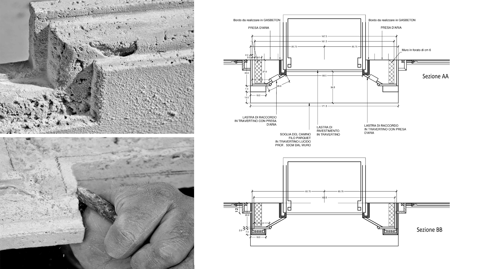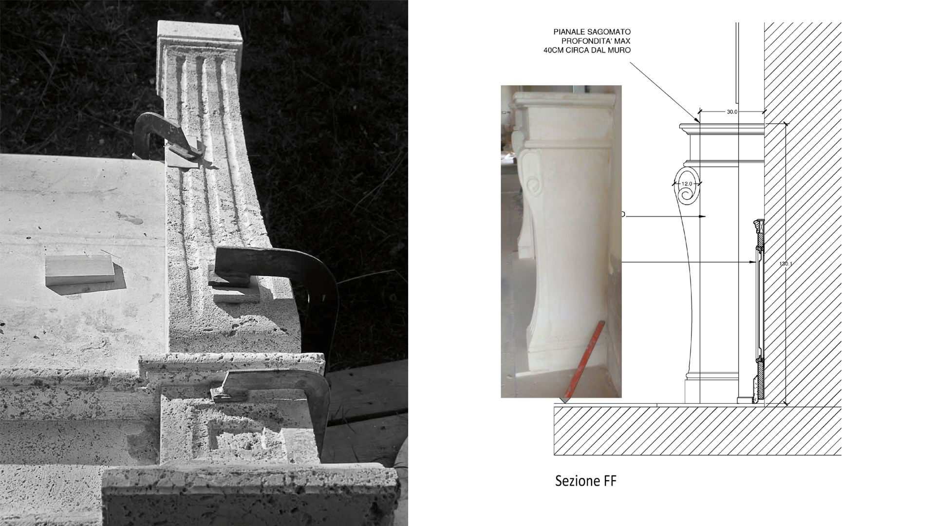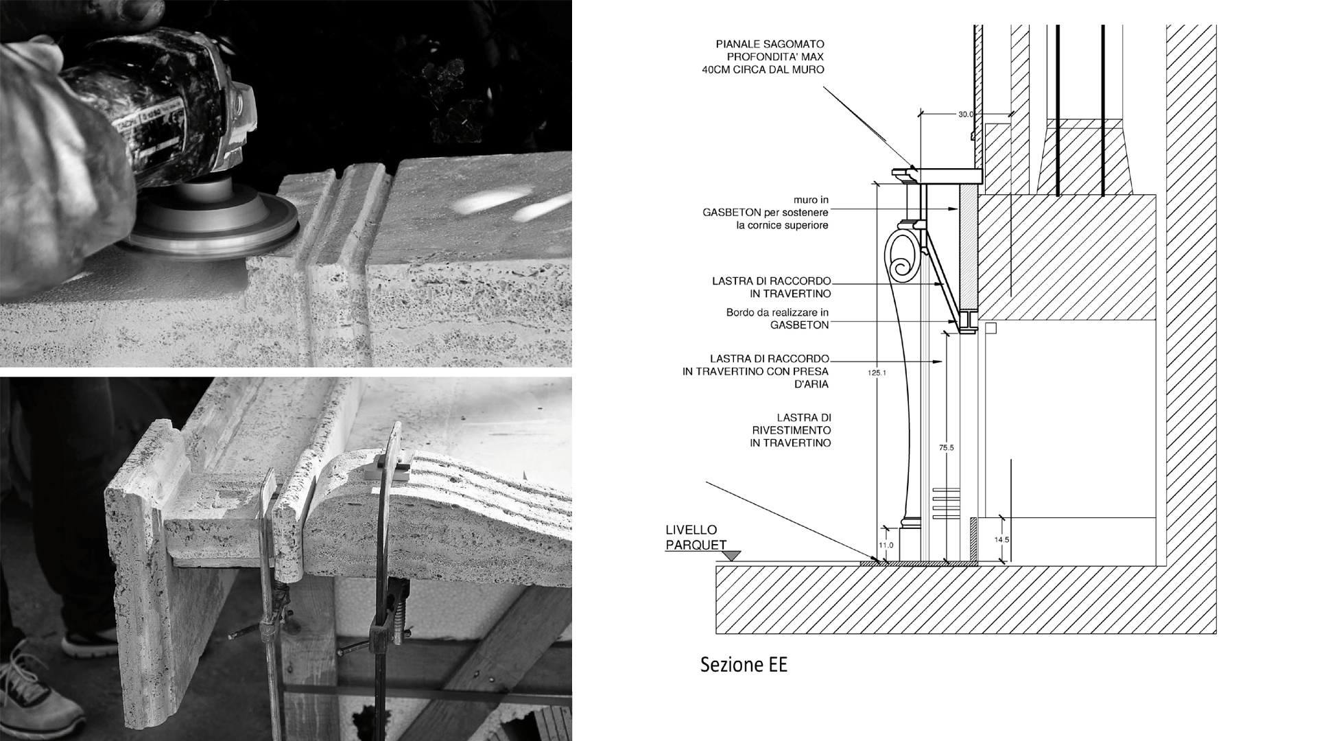Il lavoro manuale ha seguito scrupolosamente il nostro disegno esecutivo realizzato su suggerimenti formali dei progettisti: passo dopo passo la pietra ha acquistato forma con scanalature e motivi decorativi.