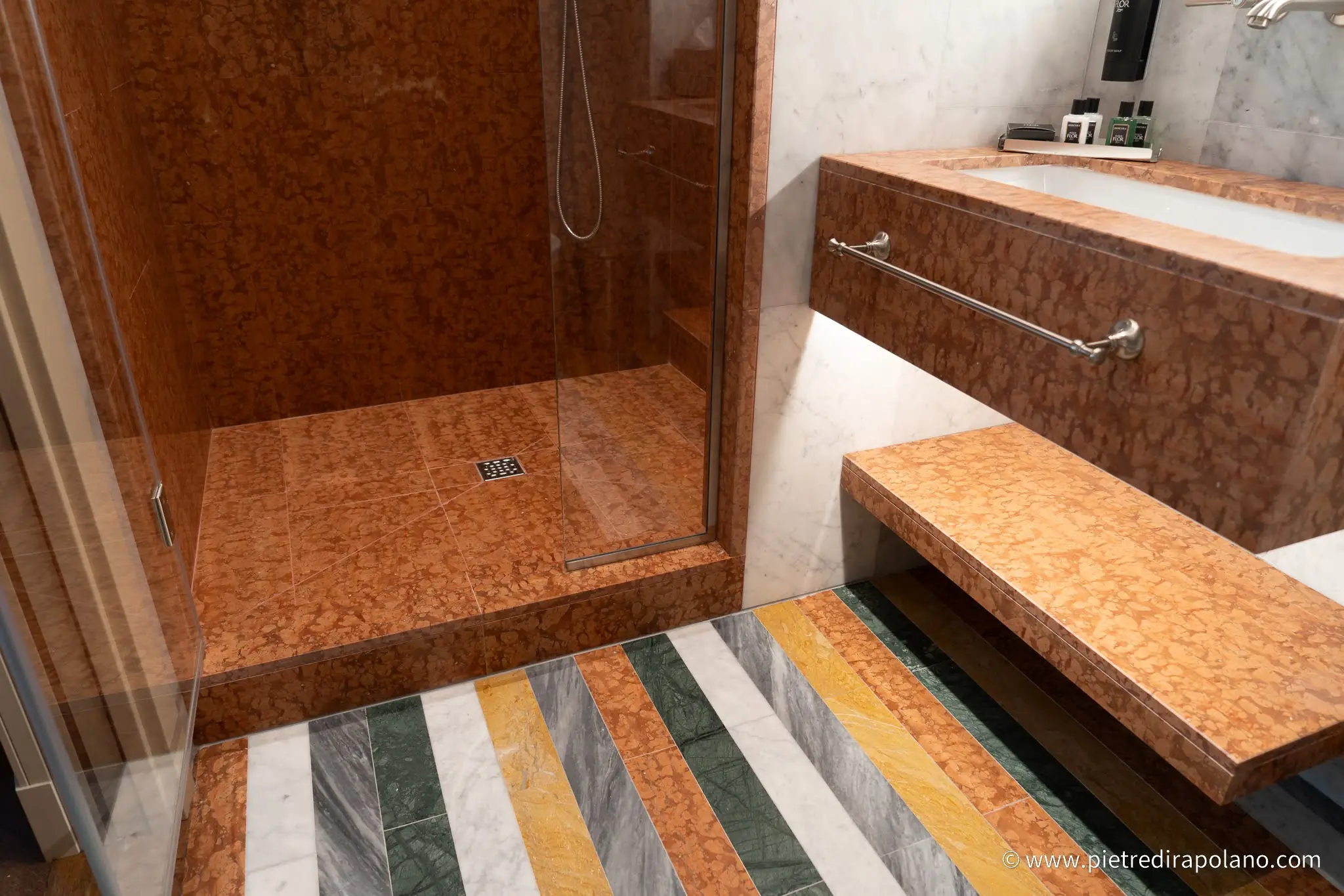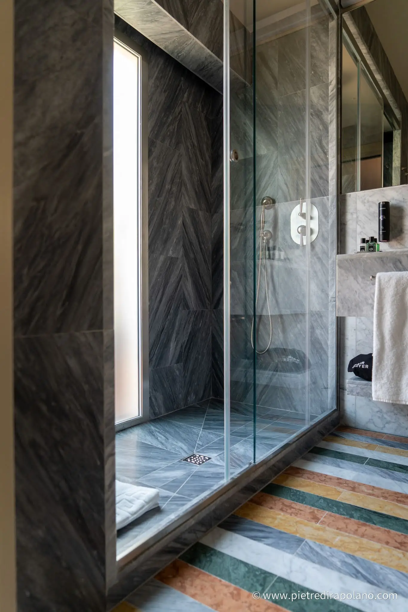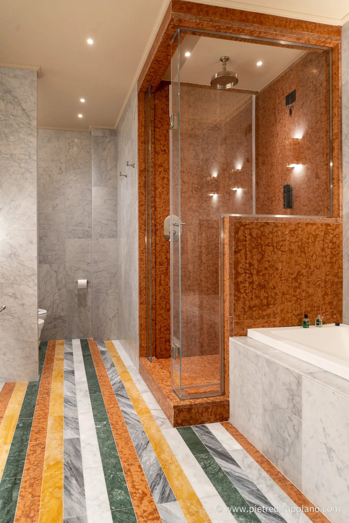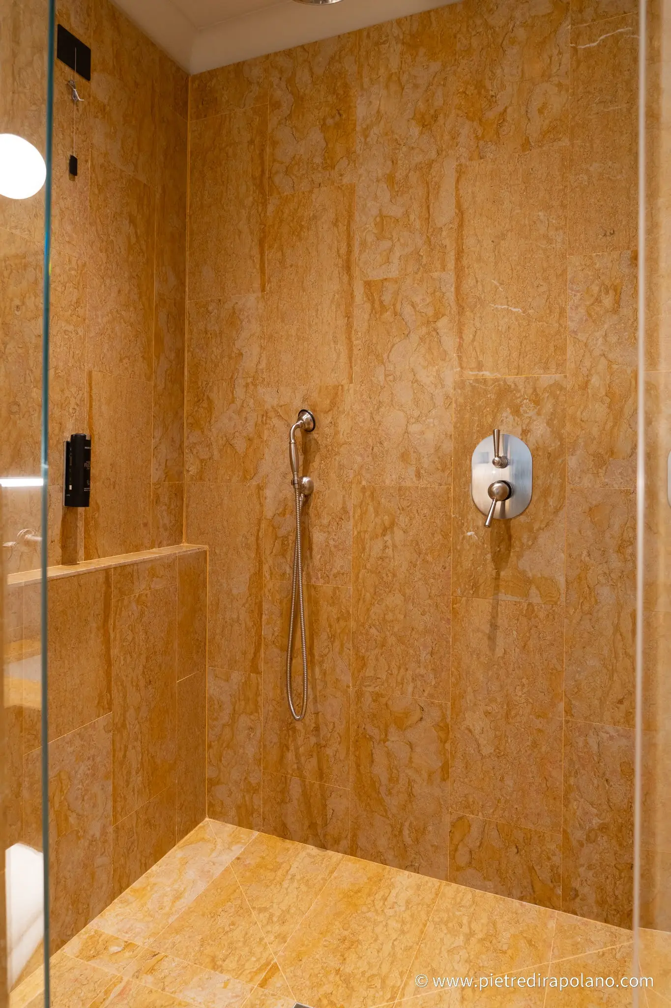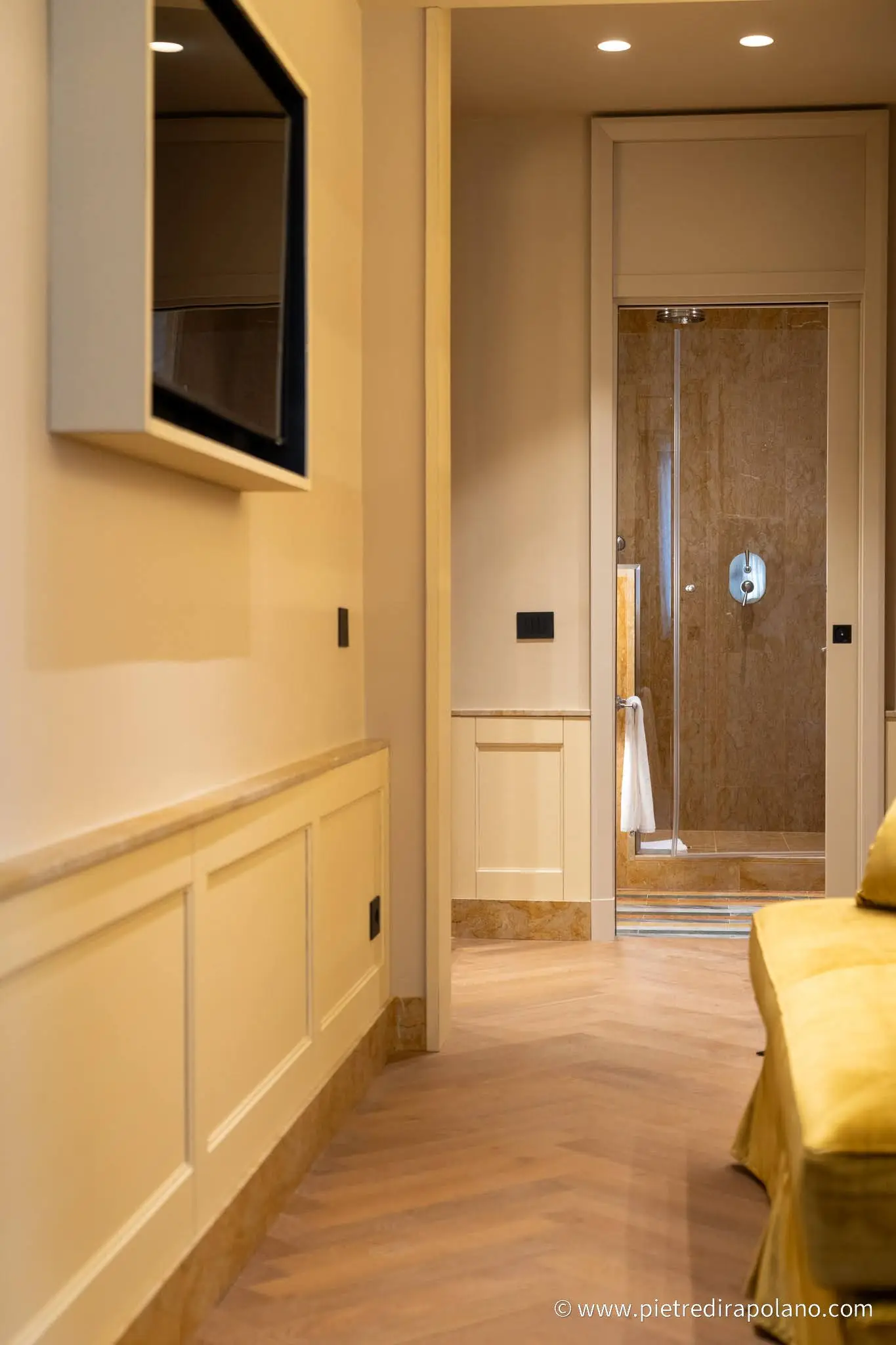 L’utilizzo del Travertino “Avana Mix” in falda per i pavimenti, con le sue tonalità calde e il pattern di posa, crea un’atmosfera di autentica eleganza e valorizza l’ampiezza degli spazi.