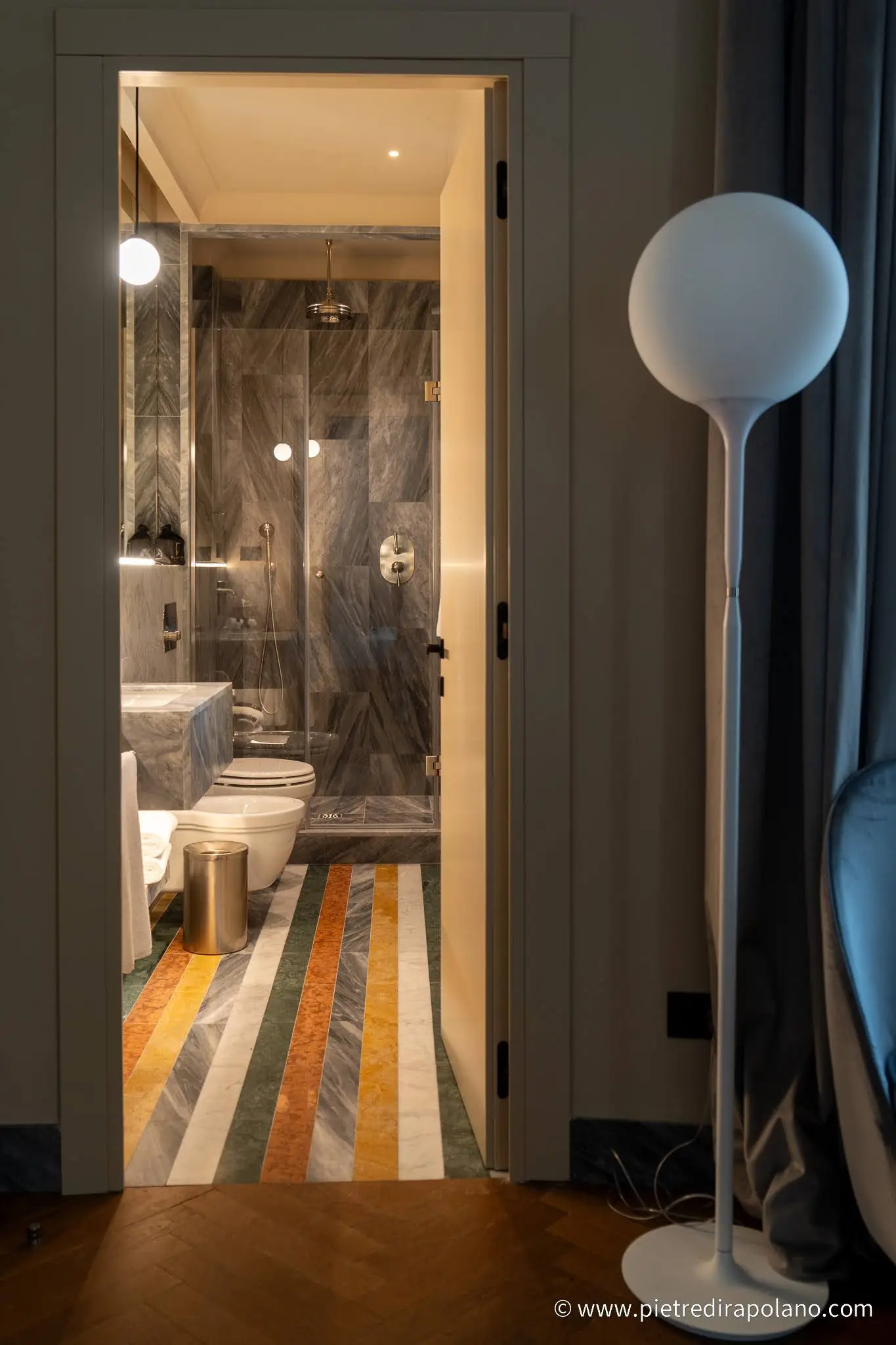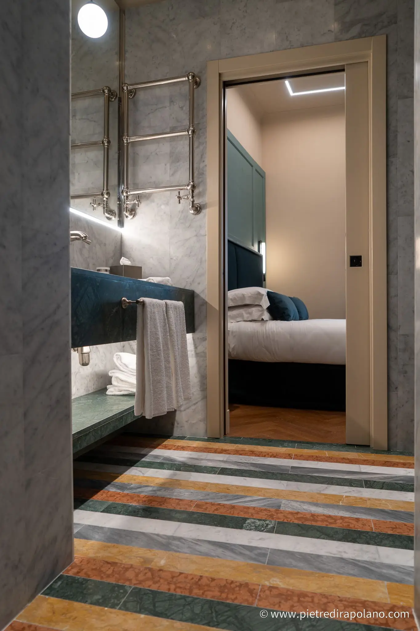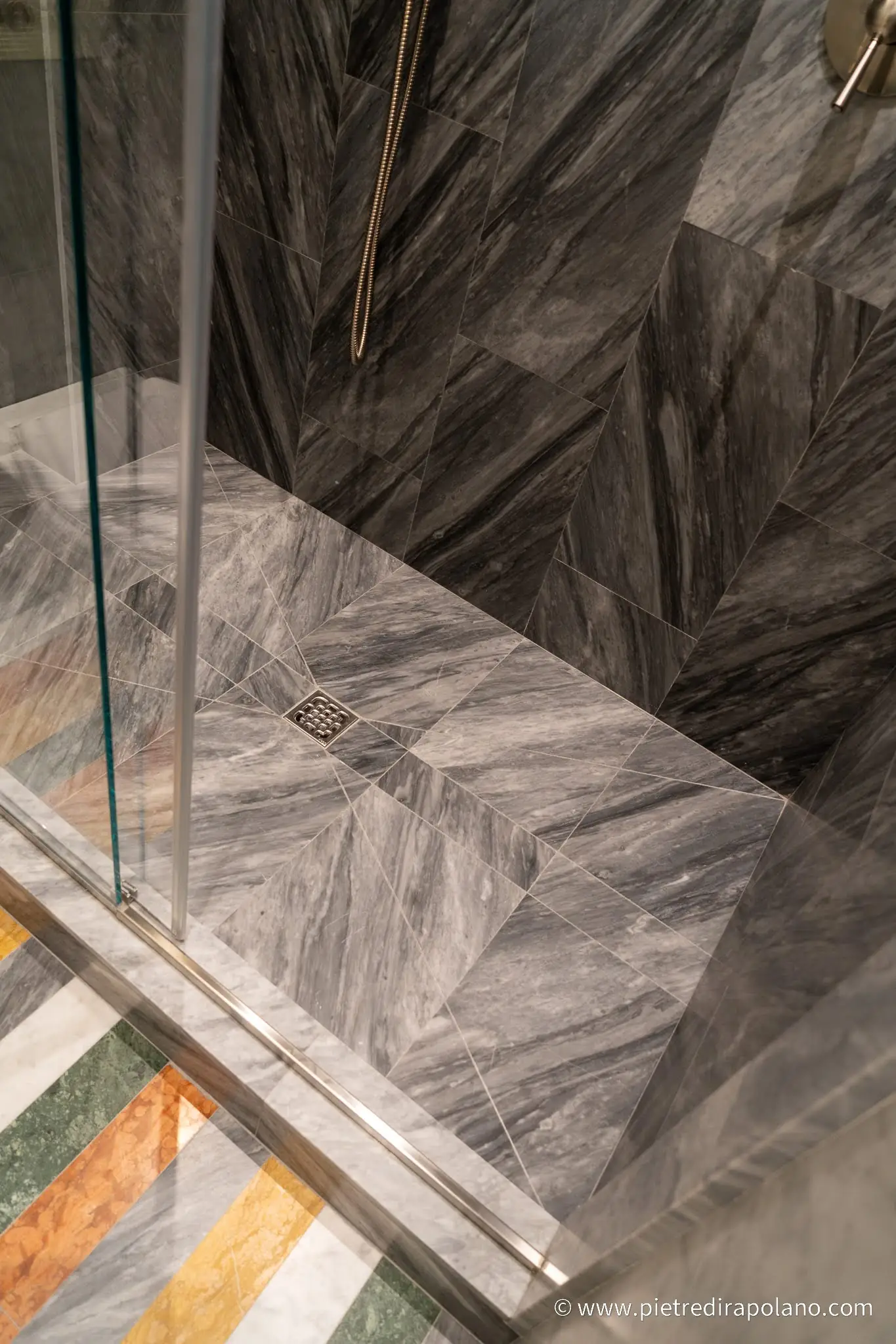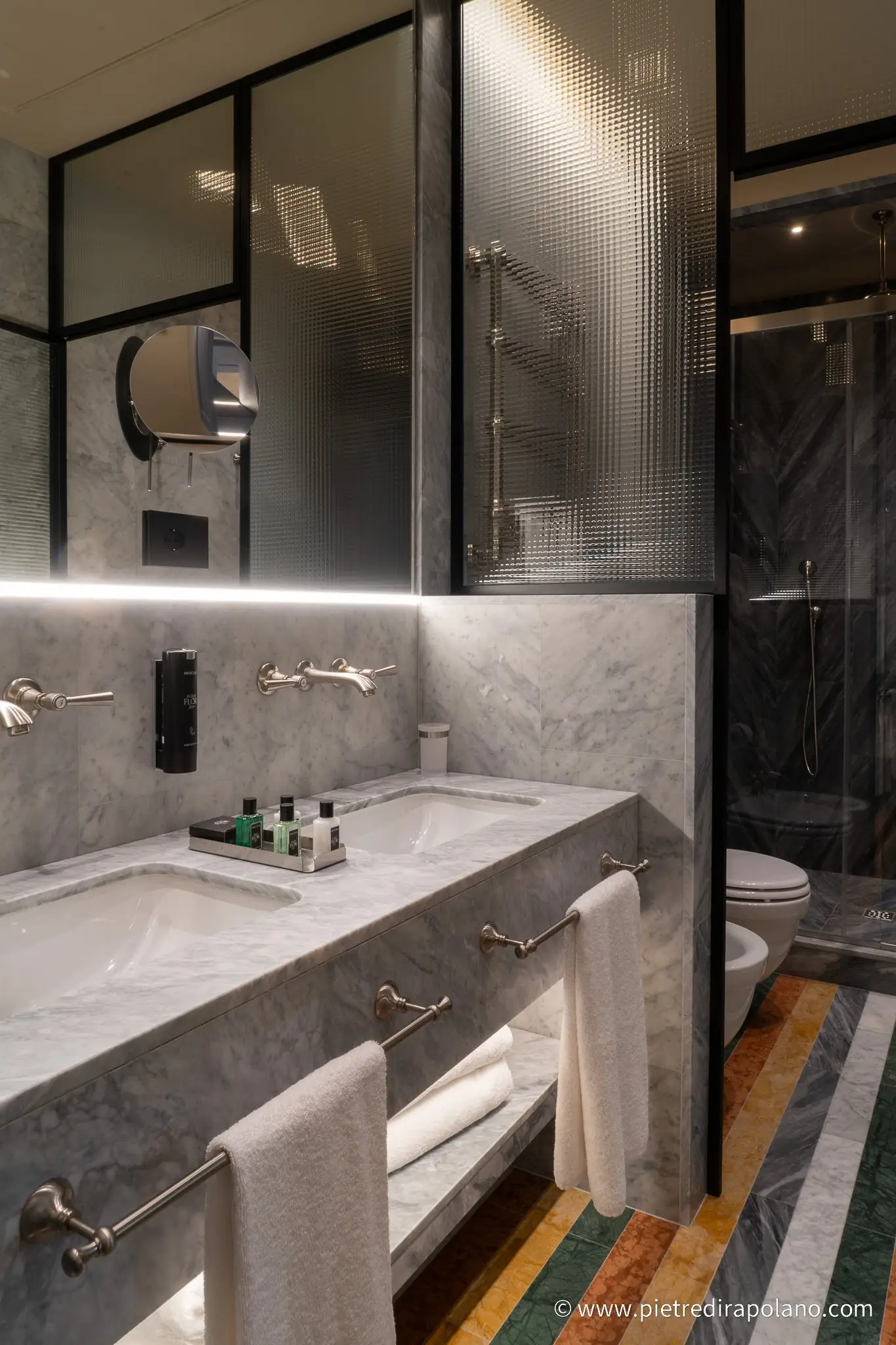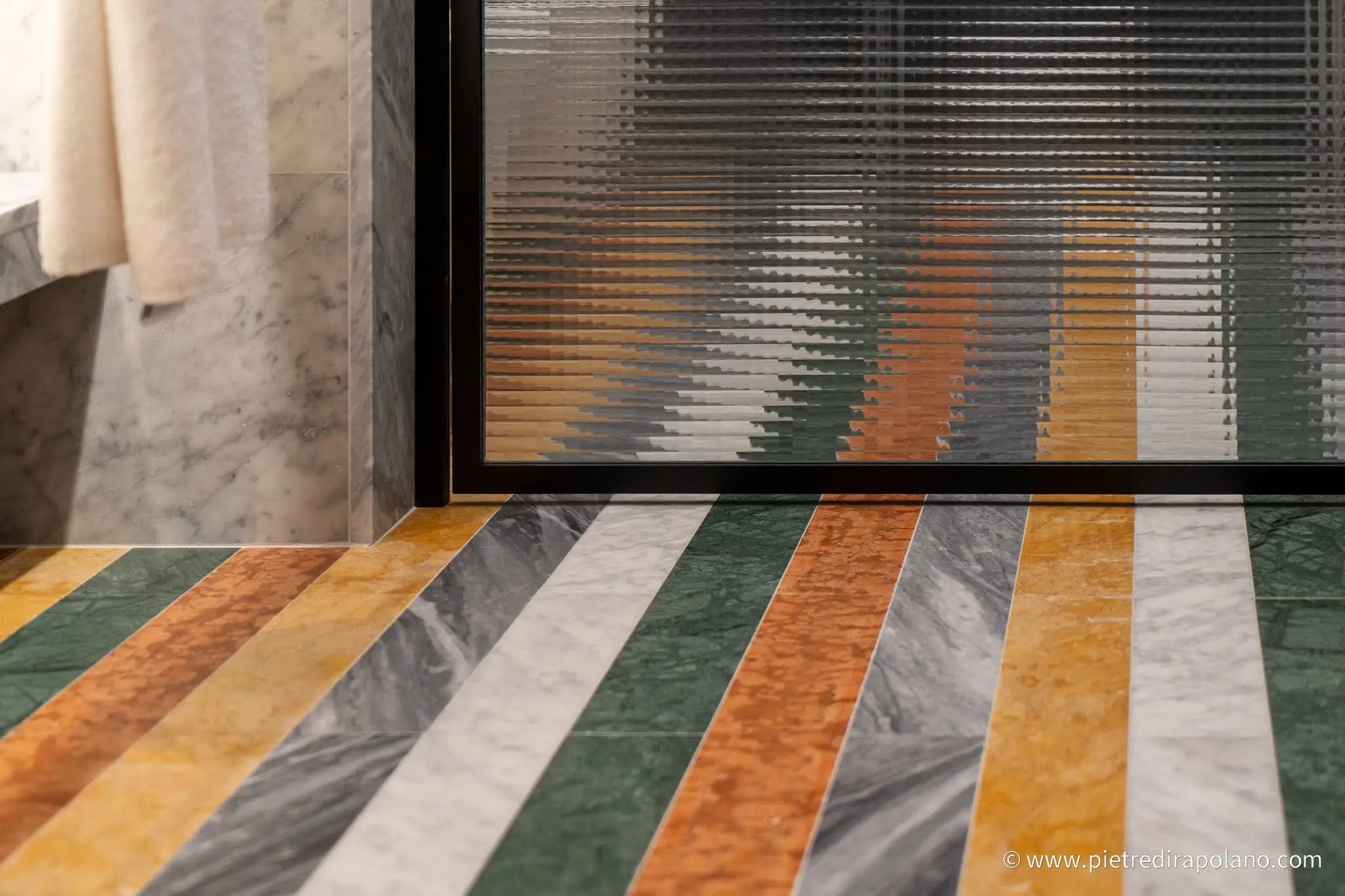 L’utilizzo del Travertino “Avana Mix” in falda per i pavimenti, con le sue tonalità calde e il pattern di posa, crea un’atmosfera di autentica eleganza e valorizza l’ampiezza degli spazi.