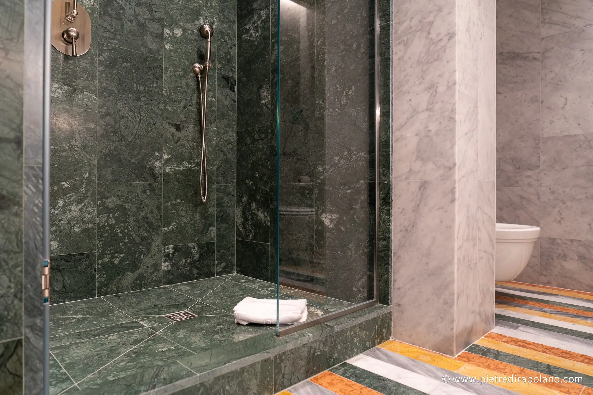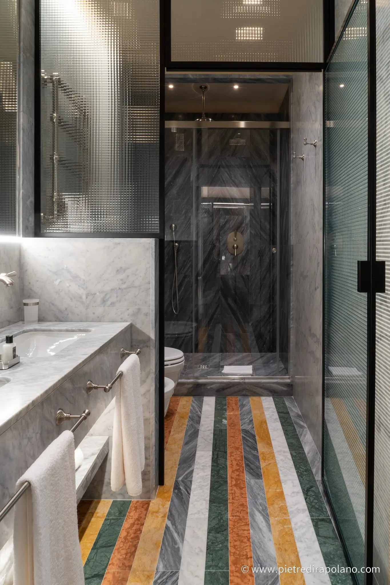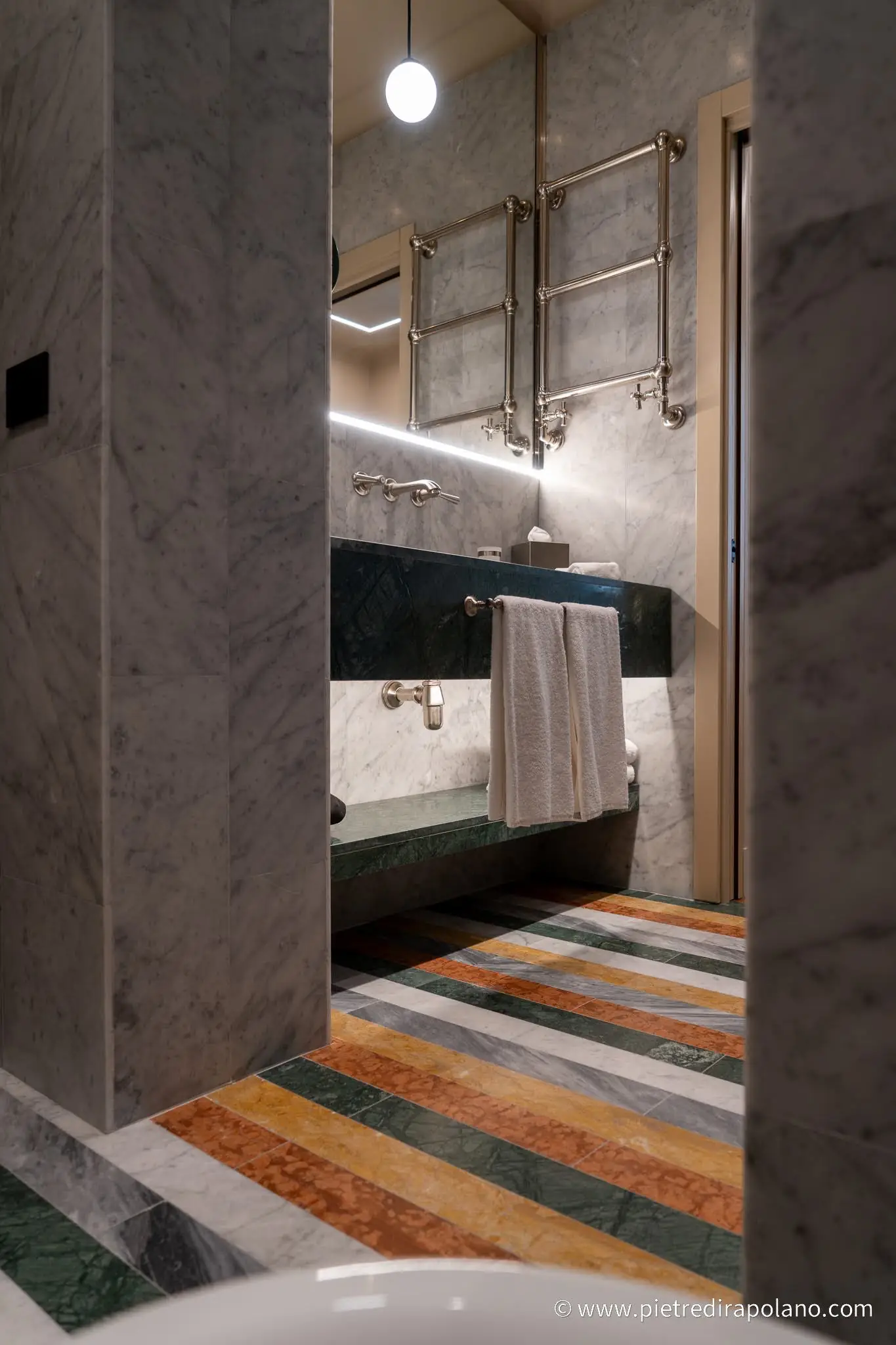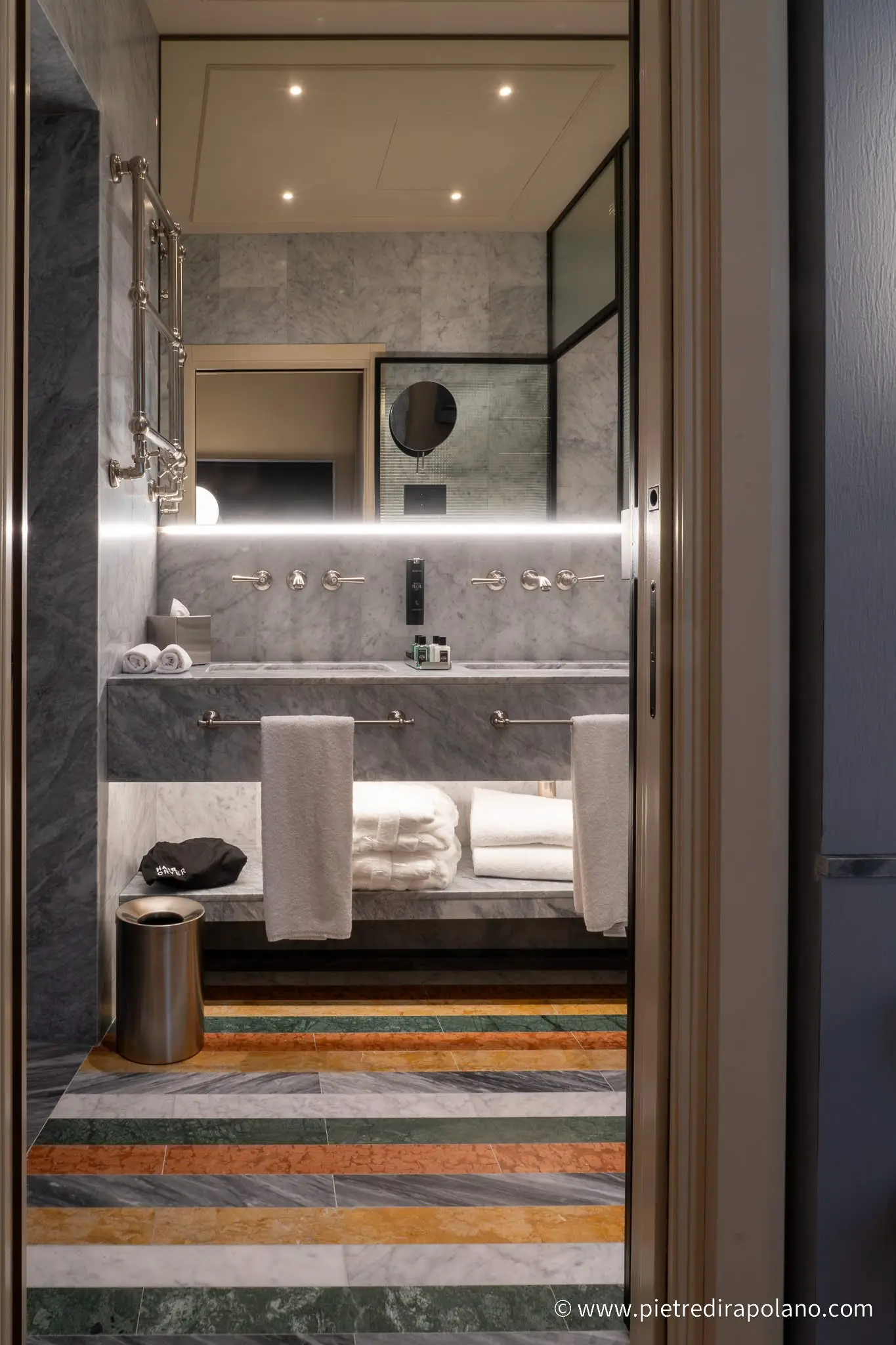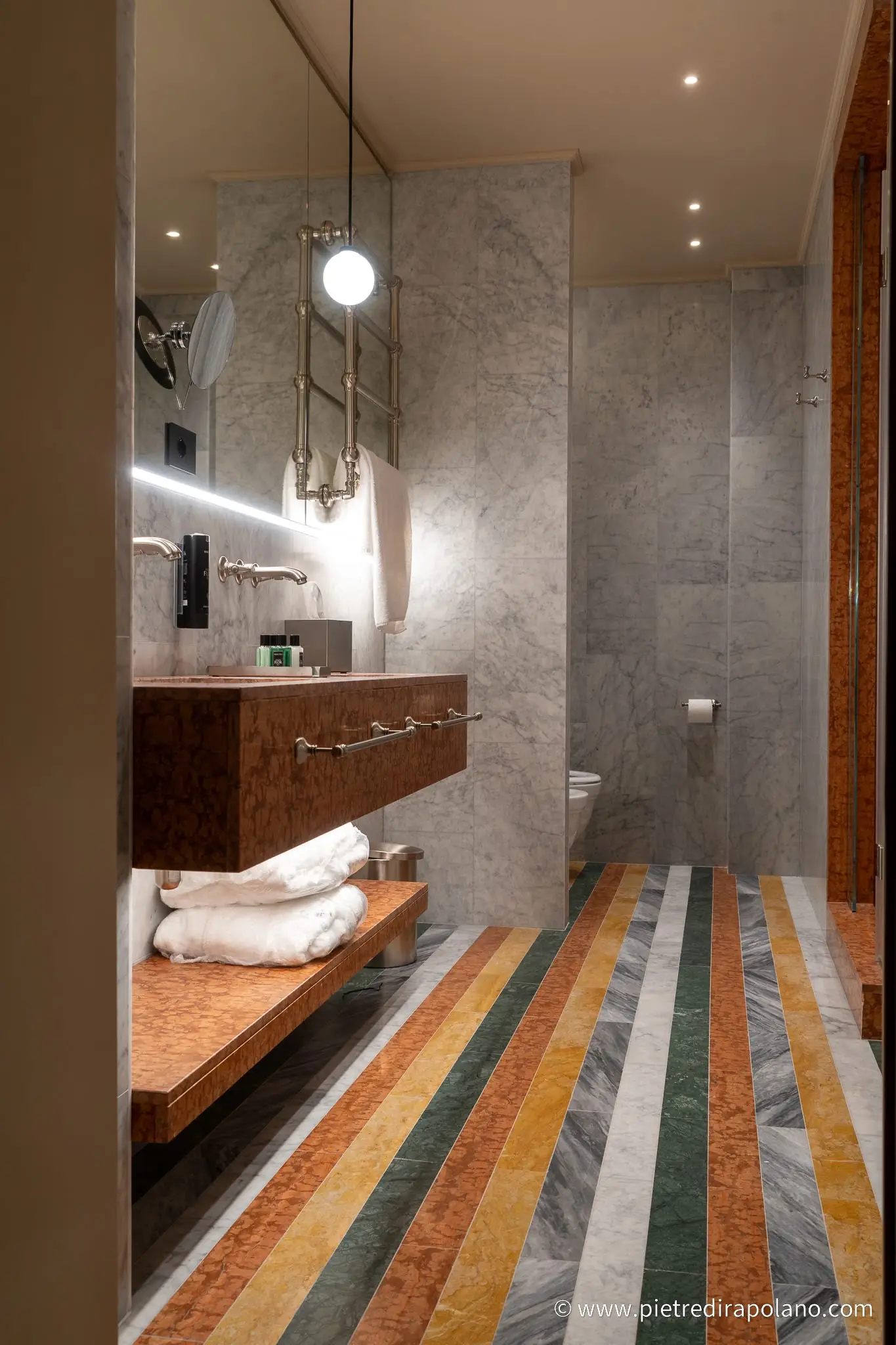 L’utilizzo del Travertino “Avana Mix” in falda per i pavimenti, con le sue tonalità calde e il pattern di posa, crea un’atmosfera di autentica eleganza e valorizza l’ampiezza degli spazi.