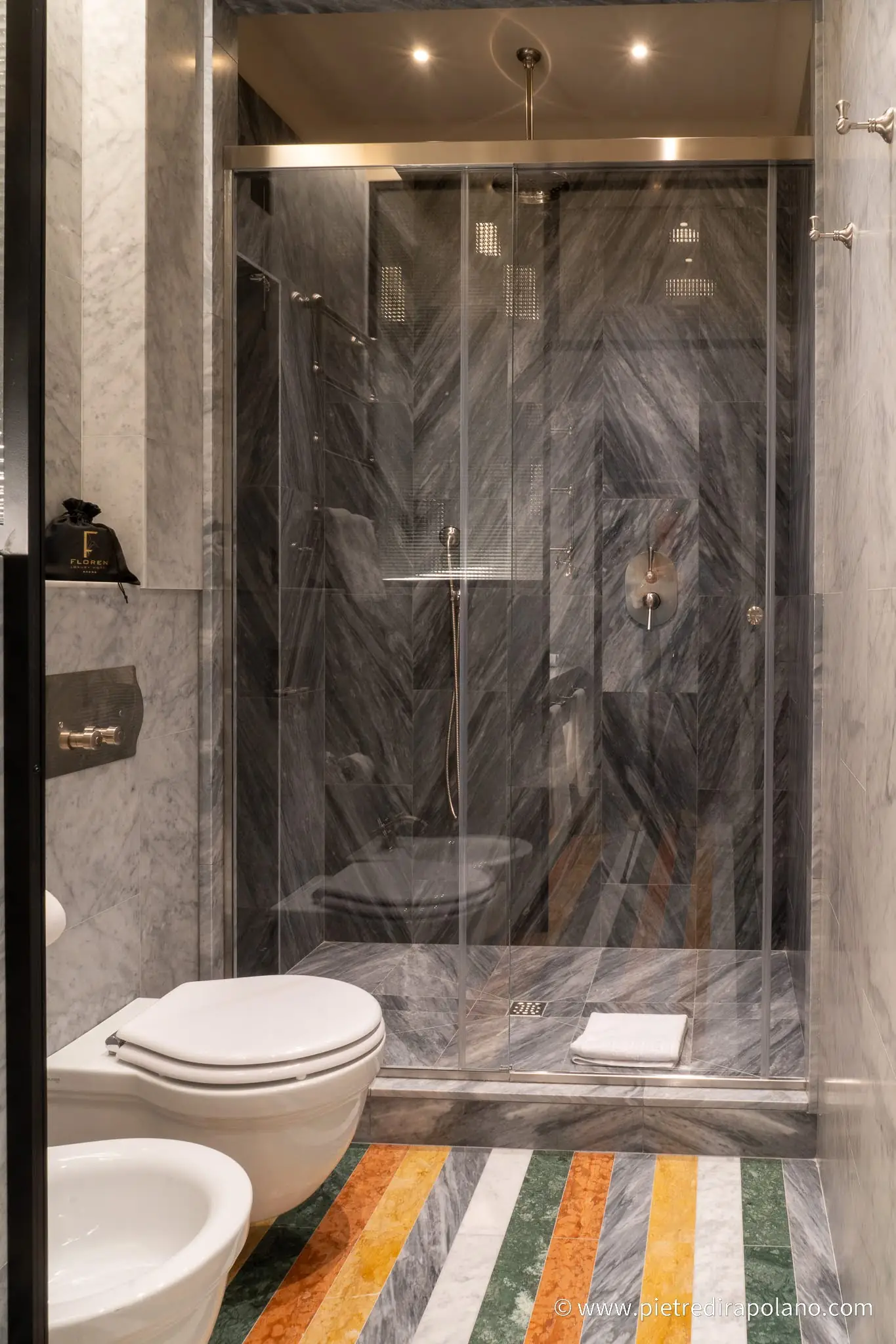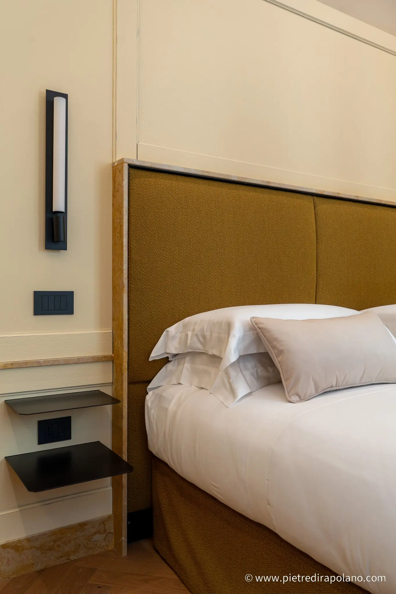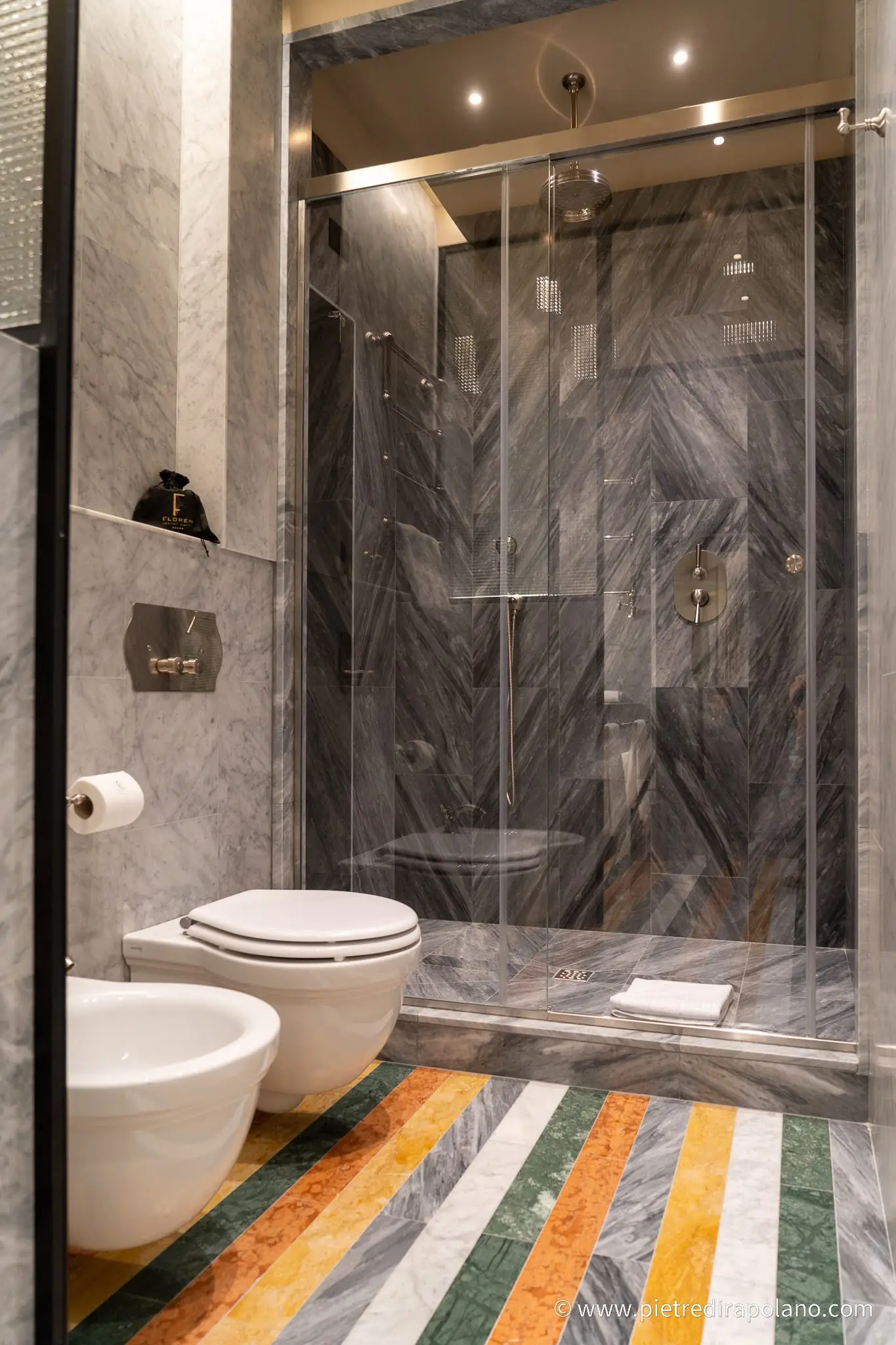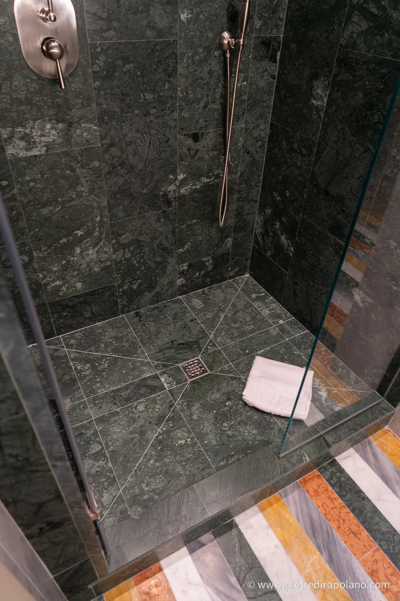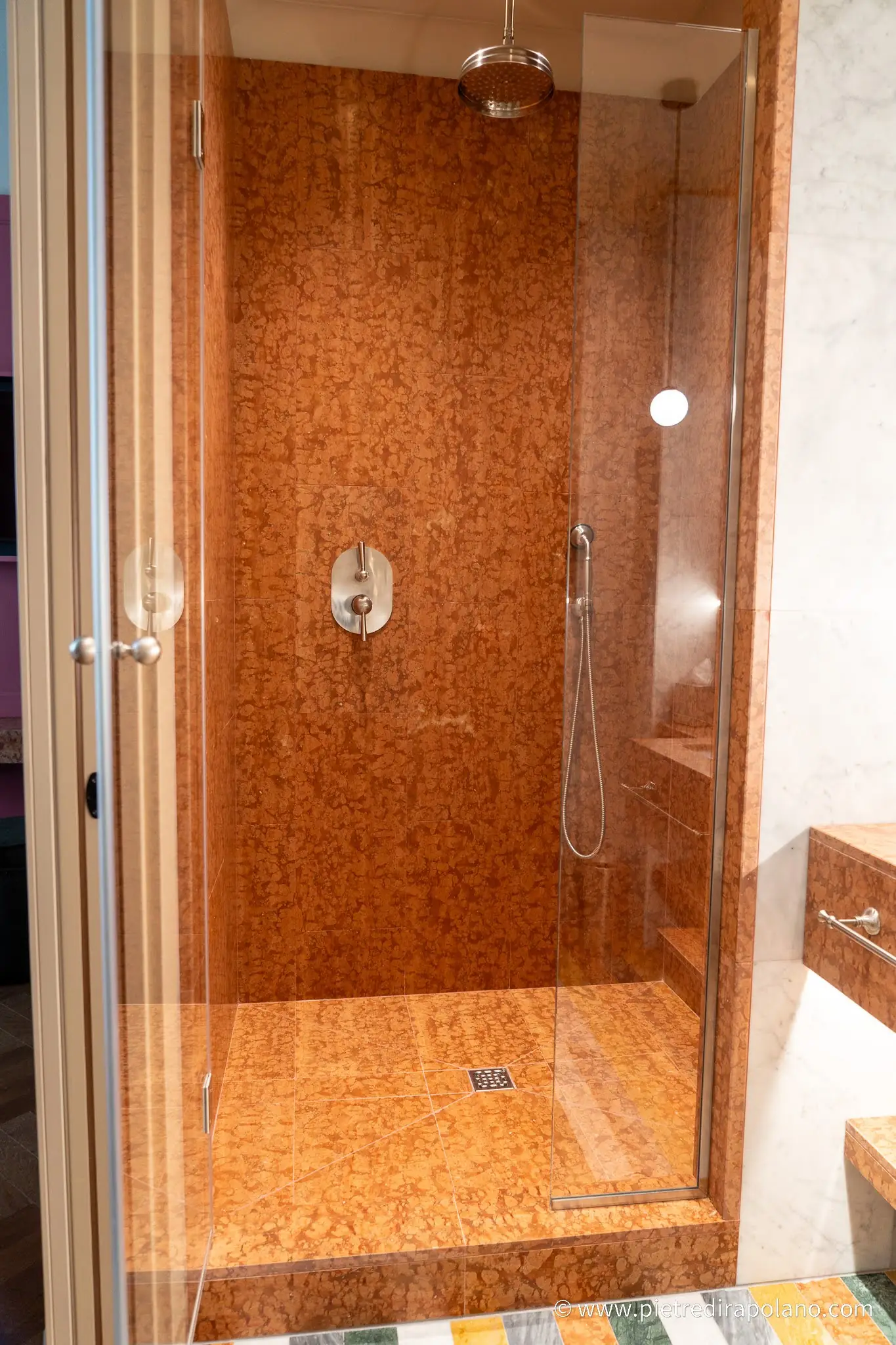 L’utilizzo del Travertino “Avana Mix” in falda per i pavimenti, con le sue tonalità calde e il pattern di posa, crea un’atmosfera di autentica eleganza e valorizza l’ampiezza degli spazi.