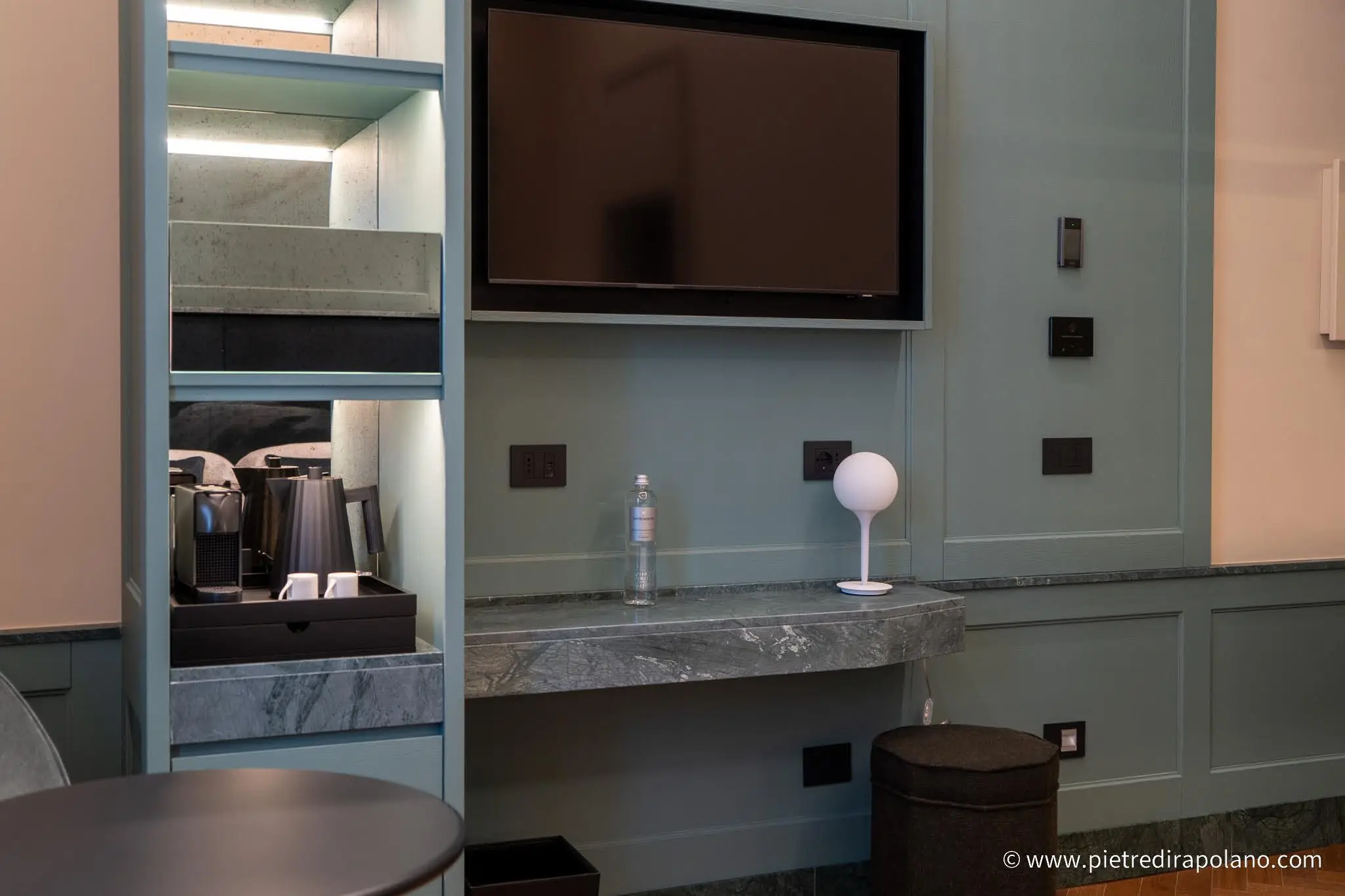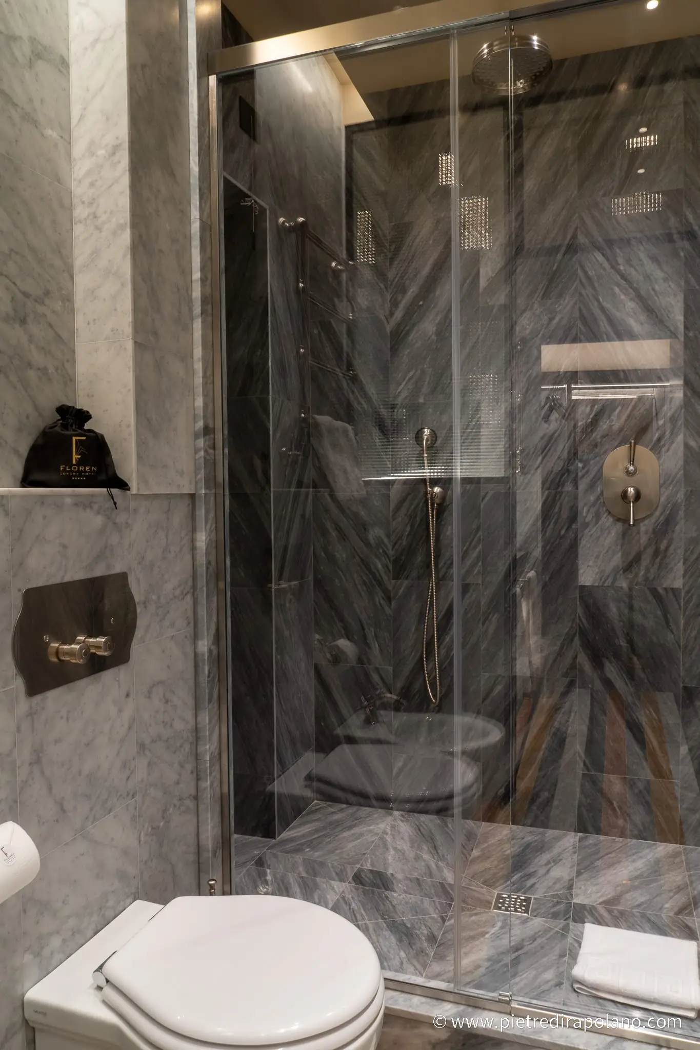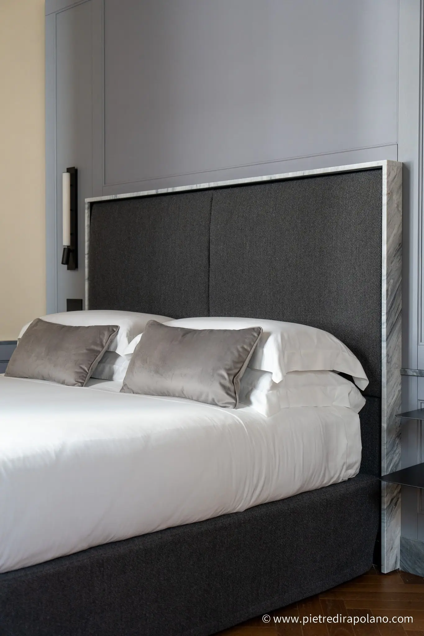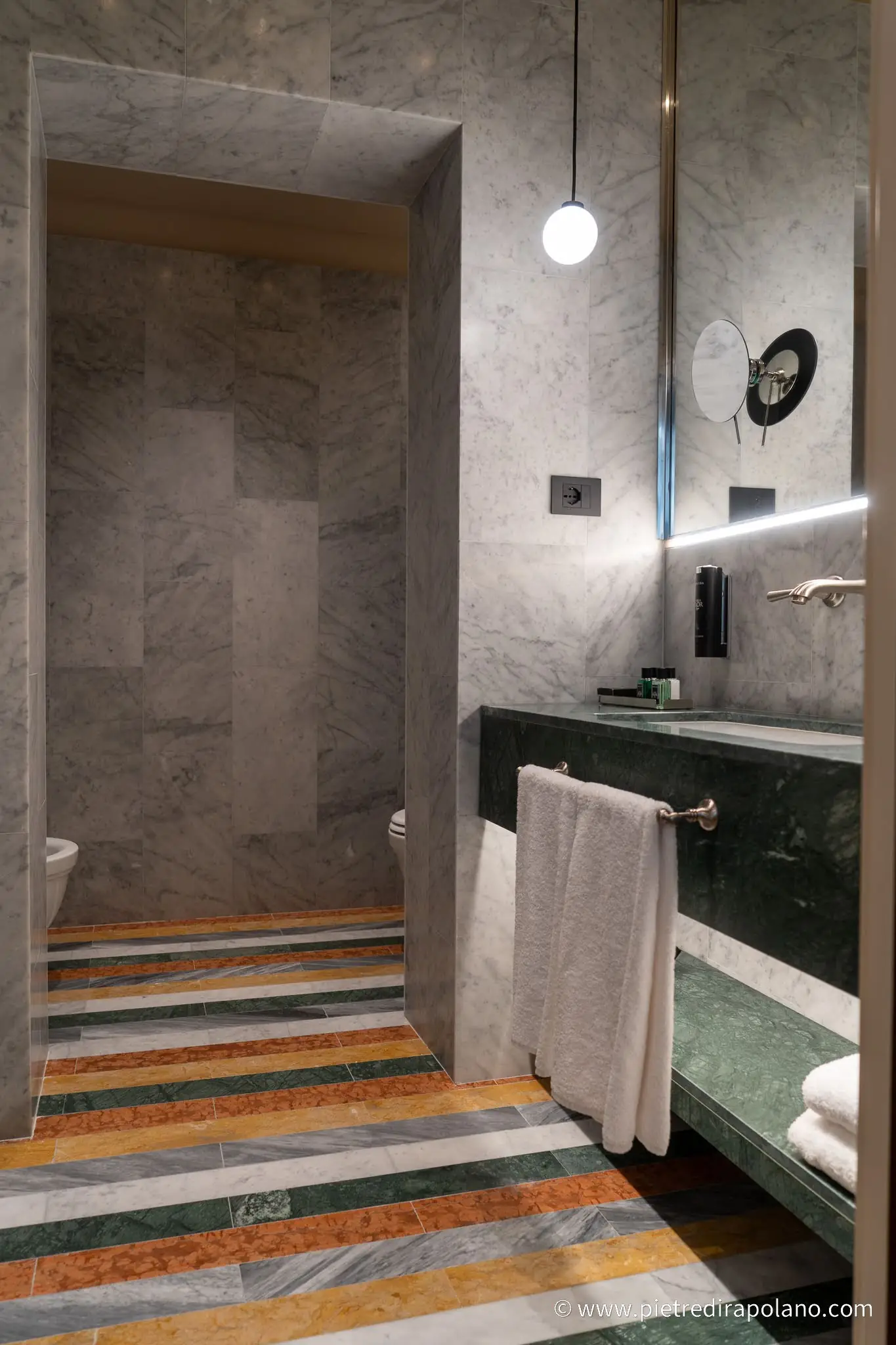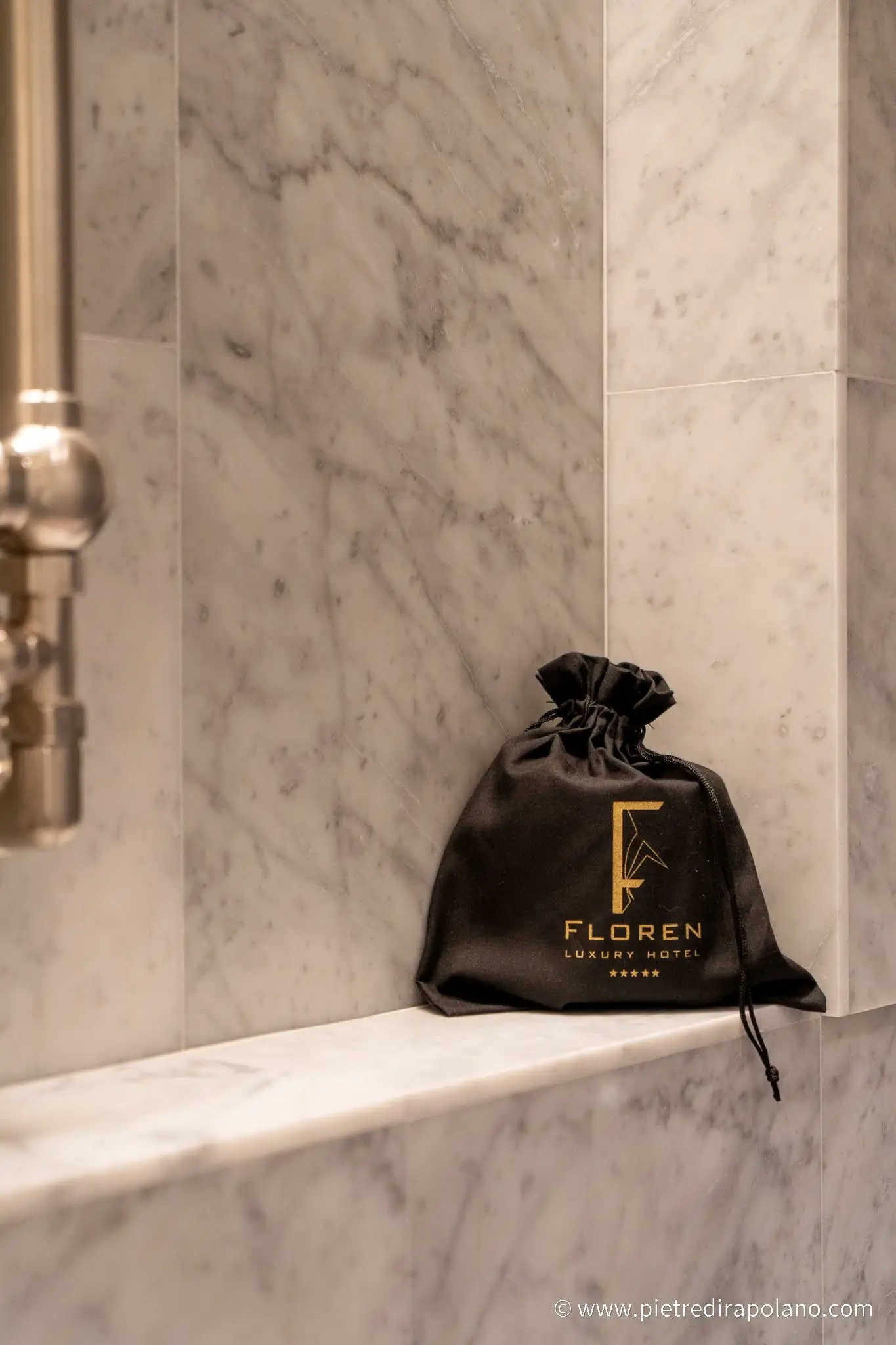 L’utilizzo del Travertino “Avana Mix” in falda per i pavimenti, con le sue tonalità calde e il pattern di posa, crea un’atmosfera di autentica eleganza e valorizza l’ampiezza degli spazi.