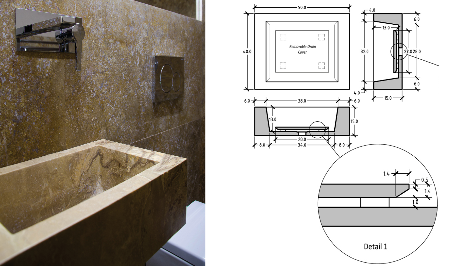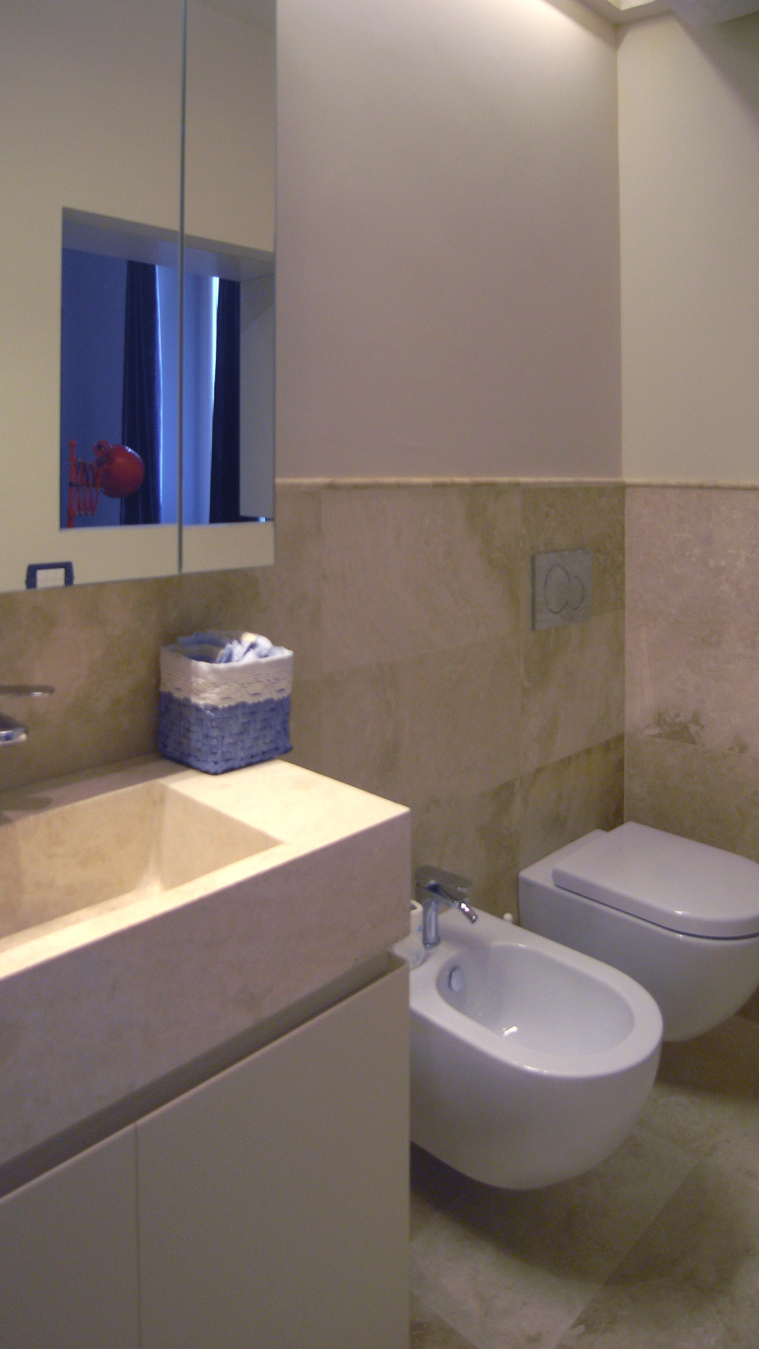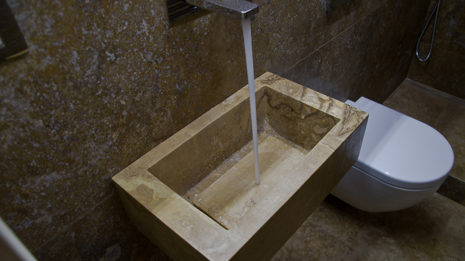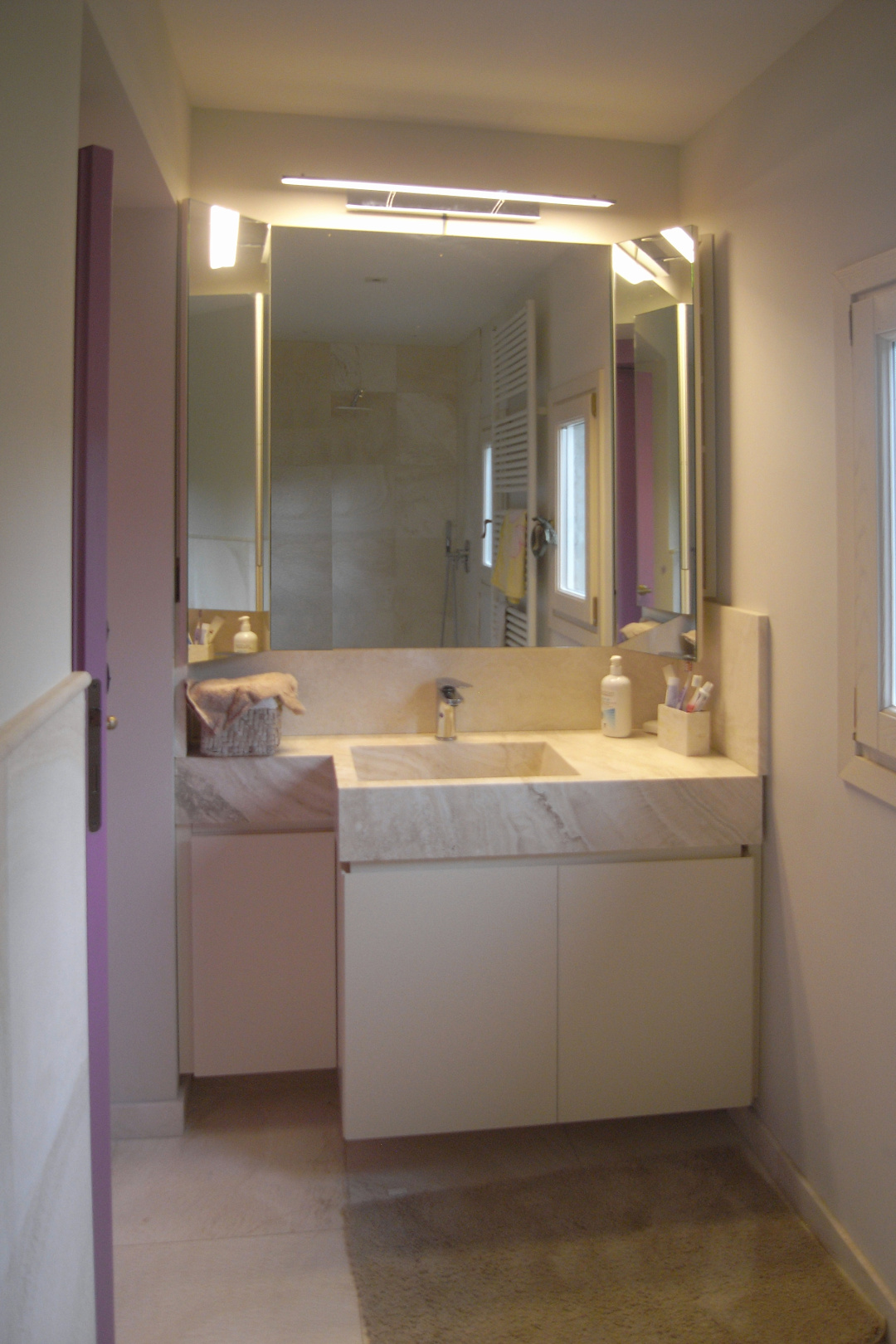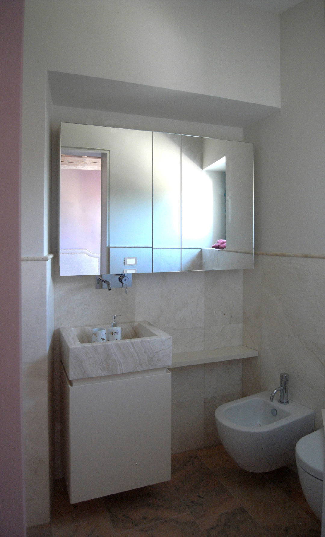 In ogni bagno è stato scelto un colore diverso di travertino: ce ne siamo serviti per i pavimenti, per i rivestimenti e per il lavabo massello su disegno originale di Arcabi.