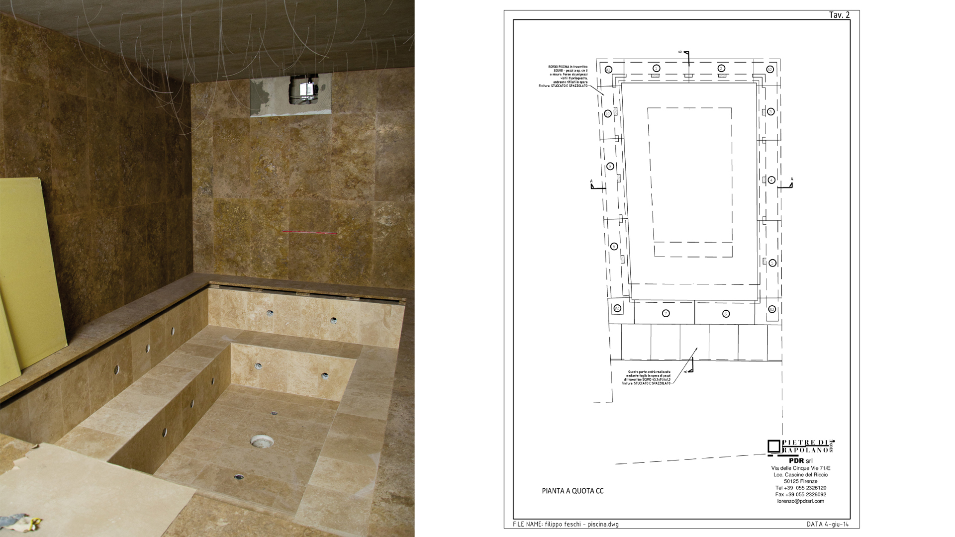 Tutti i pavimenti di questo piano sono in Pietra di Rapolano: nel dettaglio, per la piscina della SPA, è stato utilizzato il travertino Venato Scuro (codice PDR008), uno dei nostri colori più tipici, fornendo il servizio di rilievo e i disegni esecutivi per la lavorazione dei pezzi necessari al rivestimento.