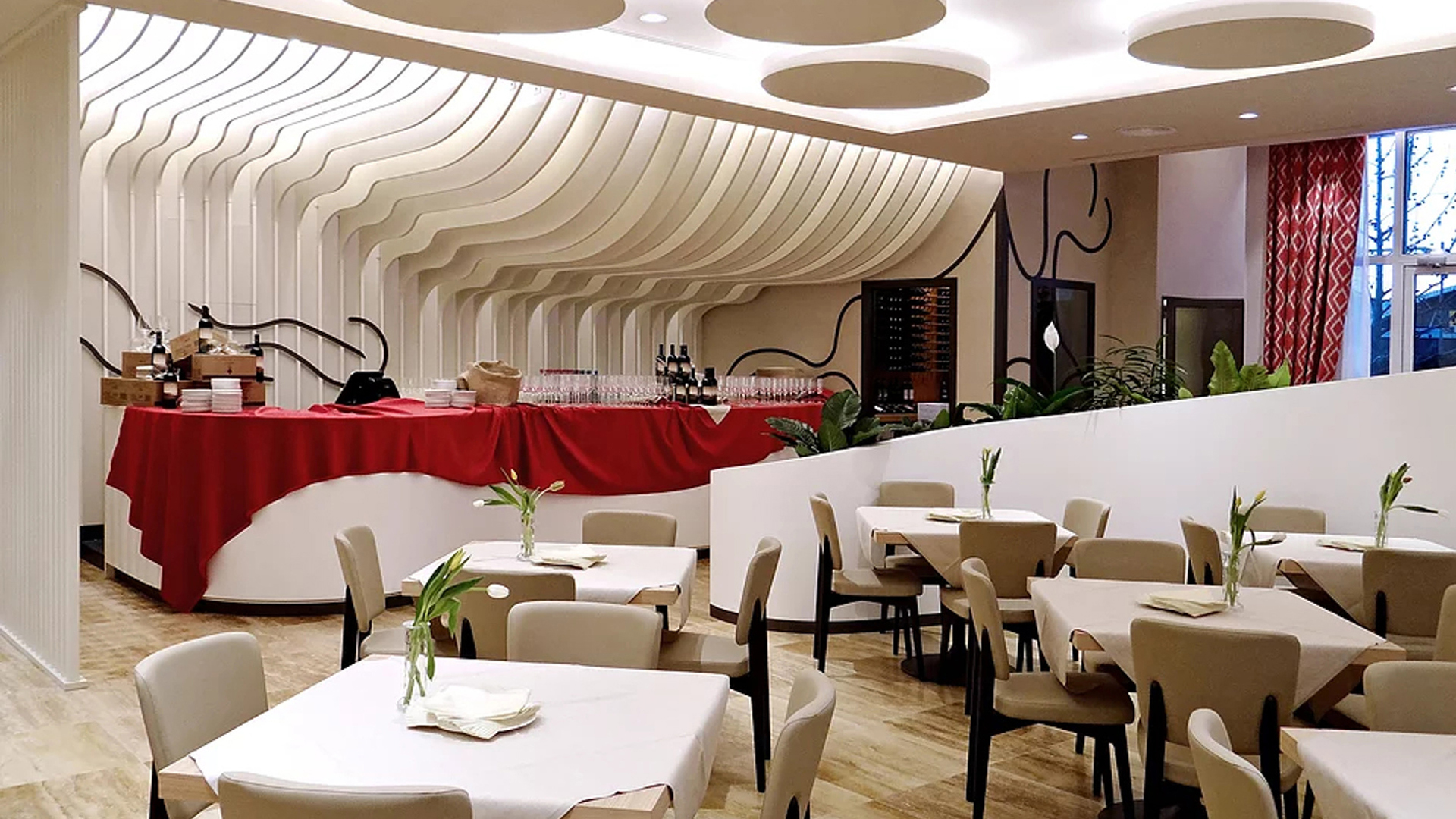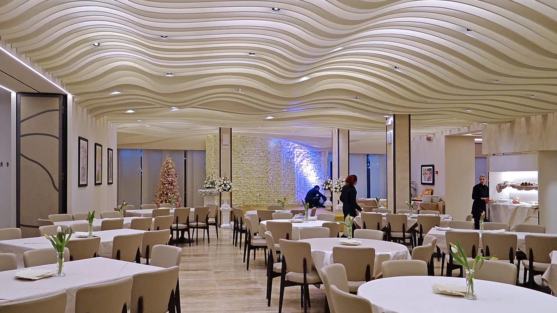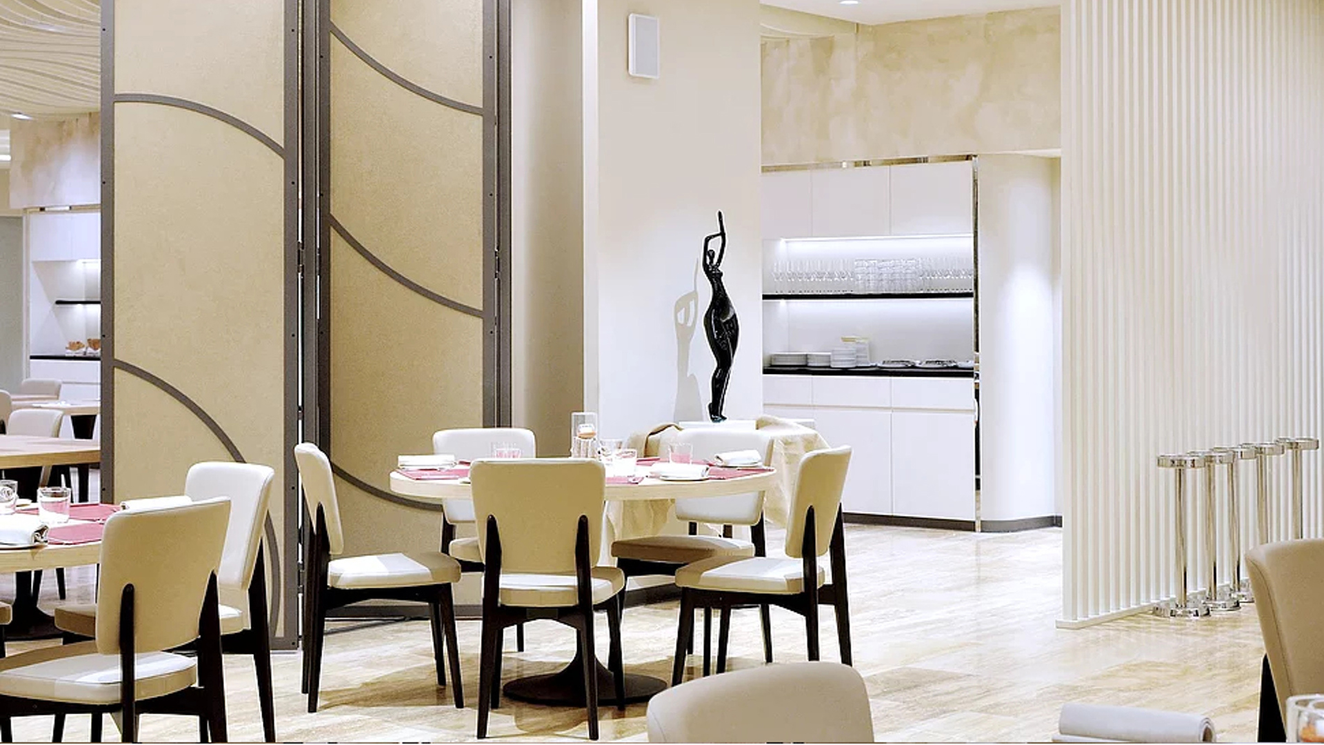 Il risultato è di notevole impatto grazie anche ad un’accurata selezione di luci che valorizzano gli elementi plastici e decorativi alle pareti e al soffitto.