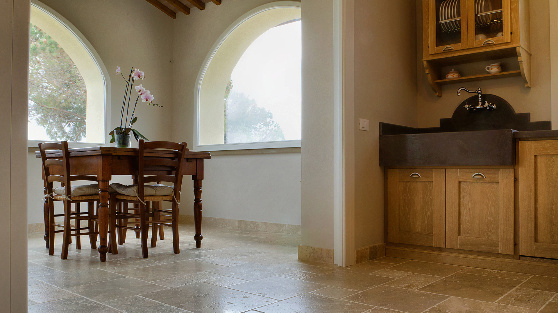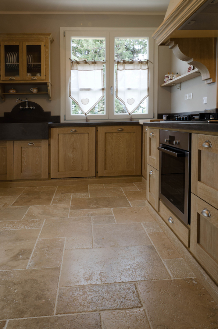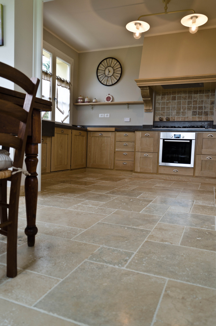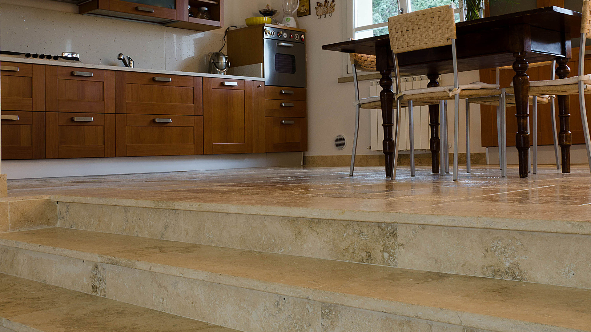 Anche per gli interni, in particolare il soggiorno e la cucina comunicante, è stato utilizzato il travertino Terra Chiara. Essendo l’ambiente ampio si è tornati ad utilizzare il formato Comp 40: nello stesso materiale ritroviamo anche il pavimento della cucina e gli scalini di collegamento; il risultato è omogeneo e naturale e si sposa alla perfezione con l’arredamento in legno scuro dal taglio moderno.