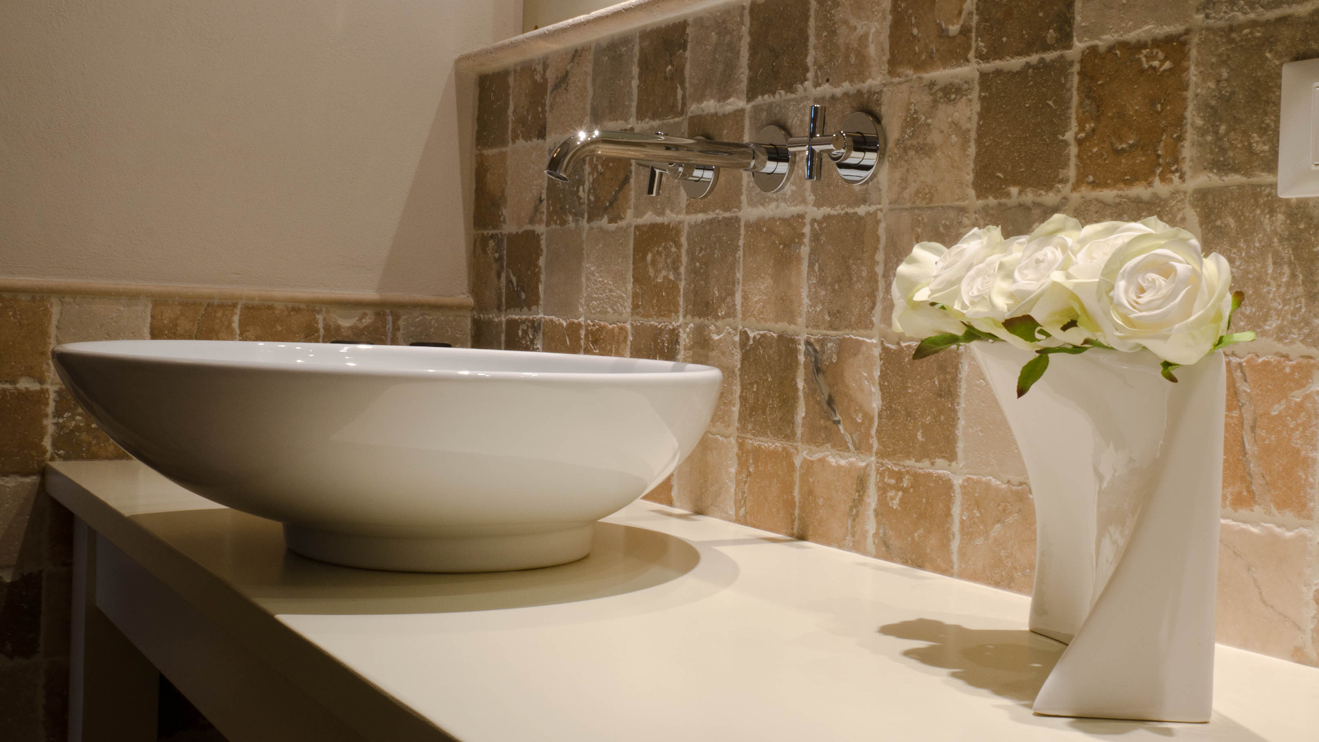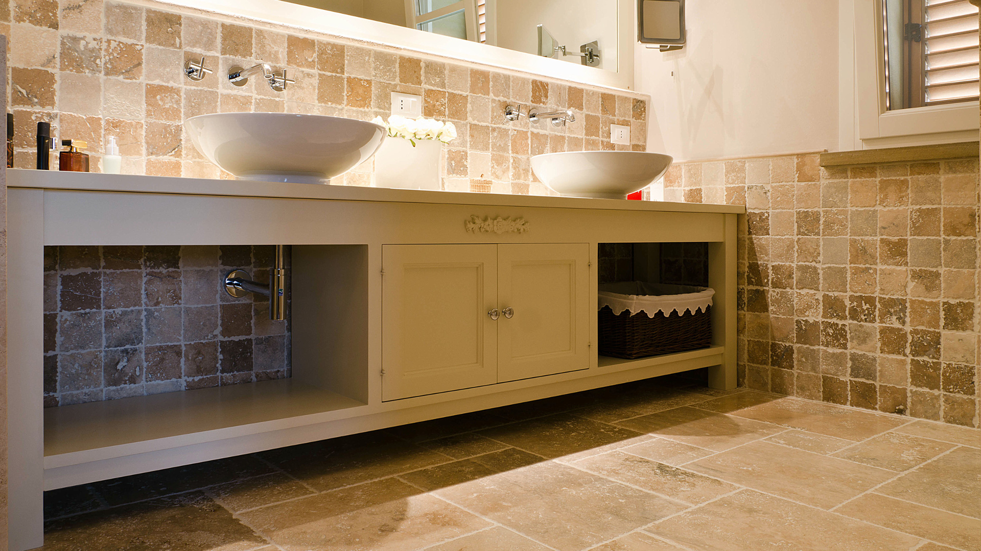 Anche il bagno padronale è stato rivestito in pietra sia per i pavimenti che per il rivestimento con Avana mix 10×10 ciottolo in varie sfumature di beige, ocra e rosa che ricopre la parete principale.